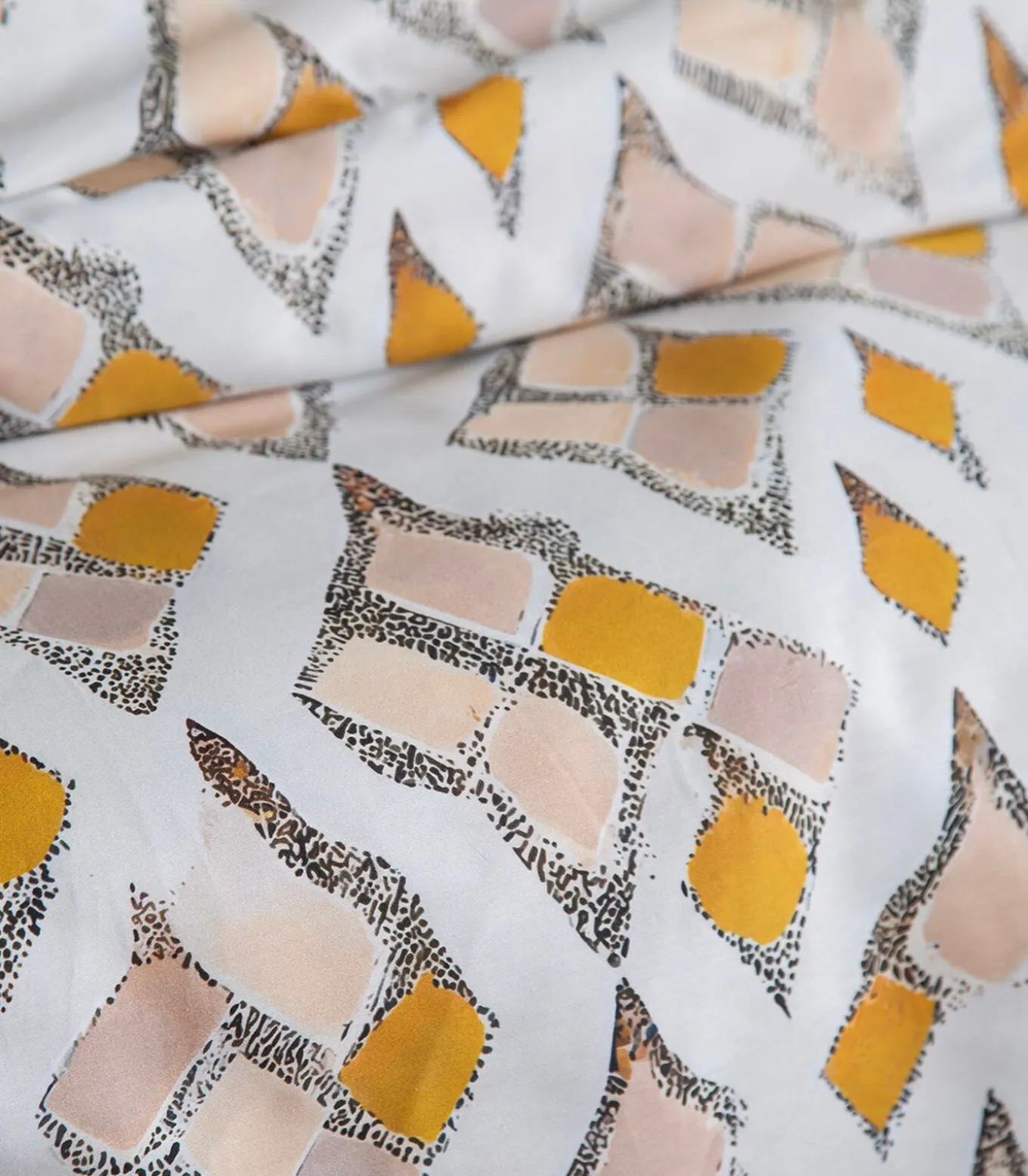 BEDRUKTE KATOENZIJD – 2 persoons beddengoed – 3 stuks: 1 dekbedovertrek 240×220 cm Knoopsluiting + 2 kussenslopen 63×63 cm met vlakke volants 3 cm. – Samenstelling 100% gekamd katoen 210 TC. (82 draden/cm2) Machinewasbaar op 60°C. OEKO–TEX gecertificeerd product: het Oeko–Tex® label garandeert dat gecertificeerde artikelen vrij zijn van schadelijke stoffen die schadelijk kunnen zijn voor de gezondheid.Dit beddengoed is ontworpen voor eindeloos comfort.De gebruikte vezel is gekamd katoen, wat het edelste deel van katoen is. De vezels zijn lang en zeer zacht.De weeftechniek van het satijnkatoen geeft het materiaal een stralende, zachte en zeer zijdeachtige uitstraling. De stof is elegant, duurzaam en zeer comfortabel. De kleuren zijn eigentijds, de lijn is puur en verfijnd, en de afwerkingen zijn minutieus.Voor een goede nachtrust, kiest u voor comfortabele en mooie lakens: uw welzijn is verzekerd….Om de glans van de kleuren te behouden, raden wij wasbeurten aan op 60 °.Als u kiest voor drogen in de droogtrommel, kies dan voor een gematigde temperatuur om de vezels te sparen.Uw beddengoed zal zachter worden na meerdere wasbeurten.