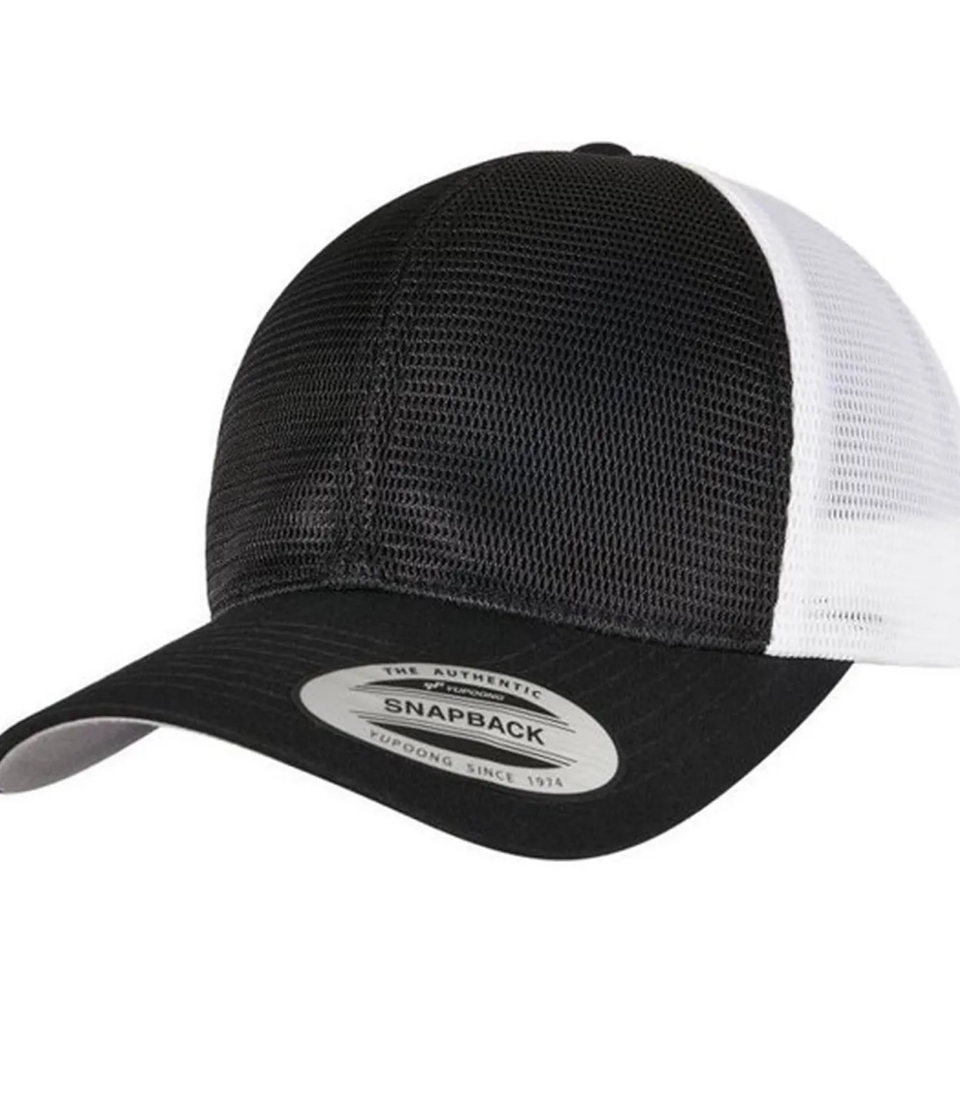 Flexfit 360–hoed, marineblauw gemaakt van een stofmix bestaande uit 60% katoen en 40% polyester. Deze hoed heeft een Omnimesh–stof, tweekleurig ontwerp met zes panelen, achtvoudig gestikt, authentieke sticker, knoop bovenaan, vooruit gebogen piek, versterkte voorkant en bewerkte ademend–stoffechnologie. De hoed heeft een snapback sluiting en is WRAP gecertificeerd voor duurzaamheid.