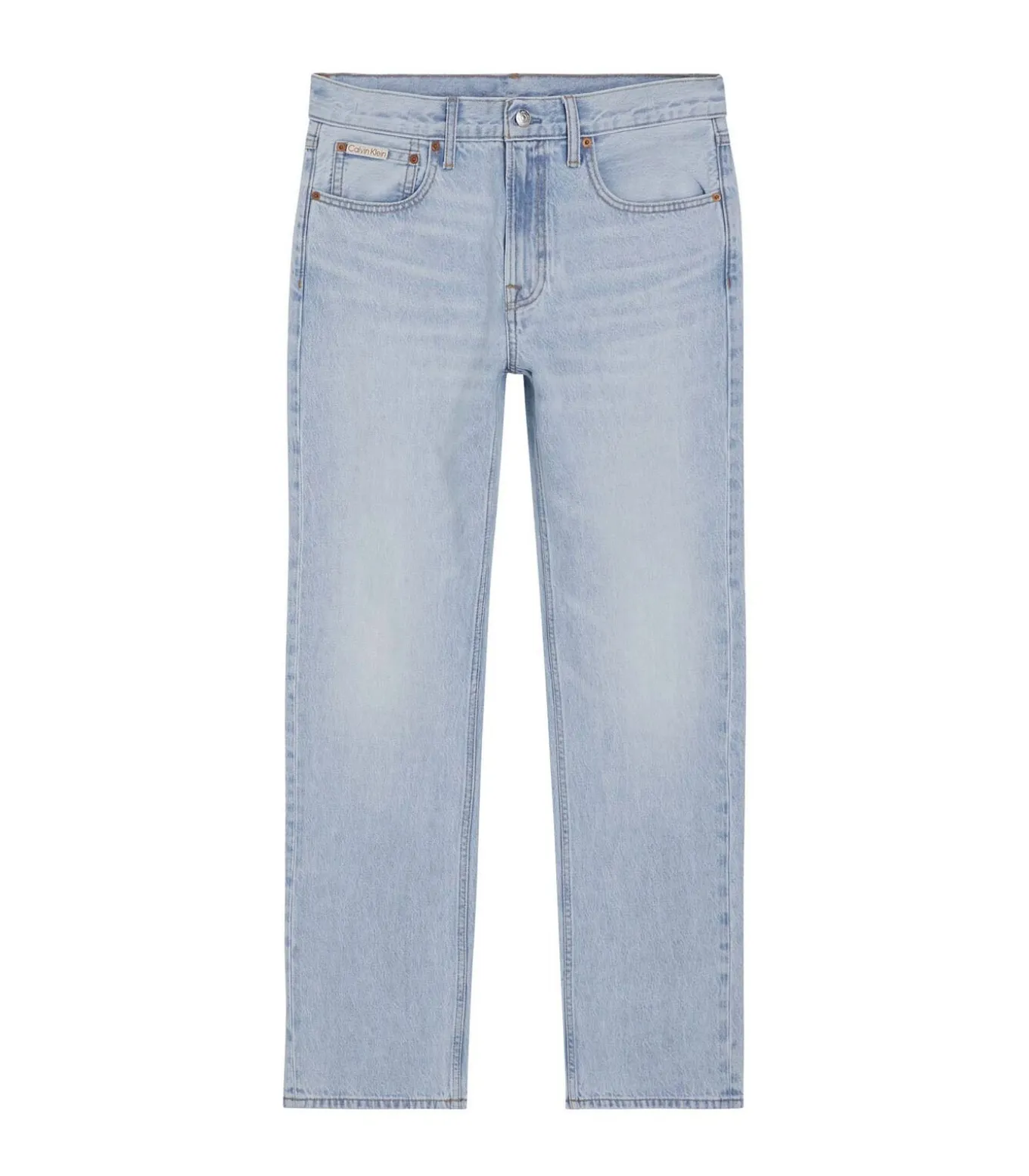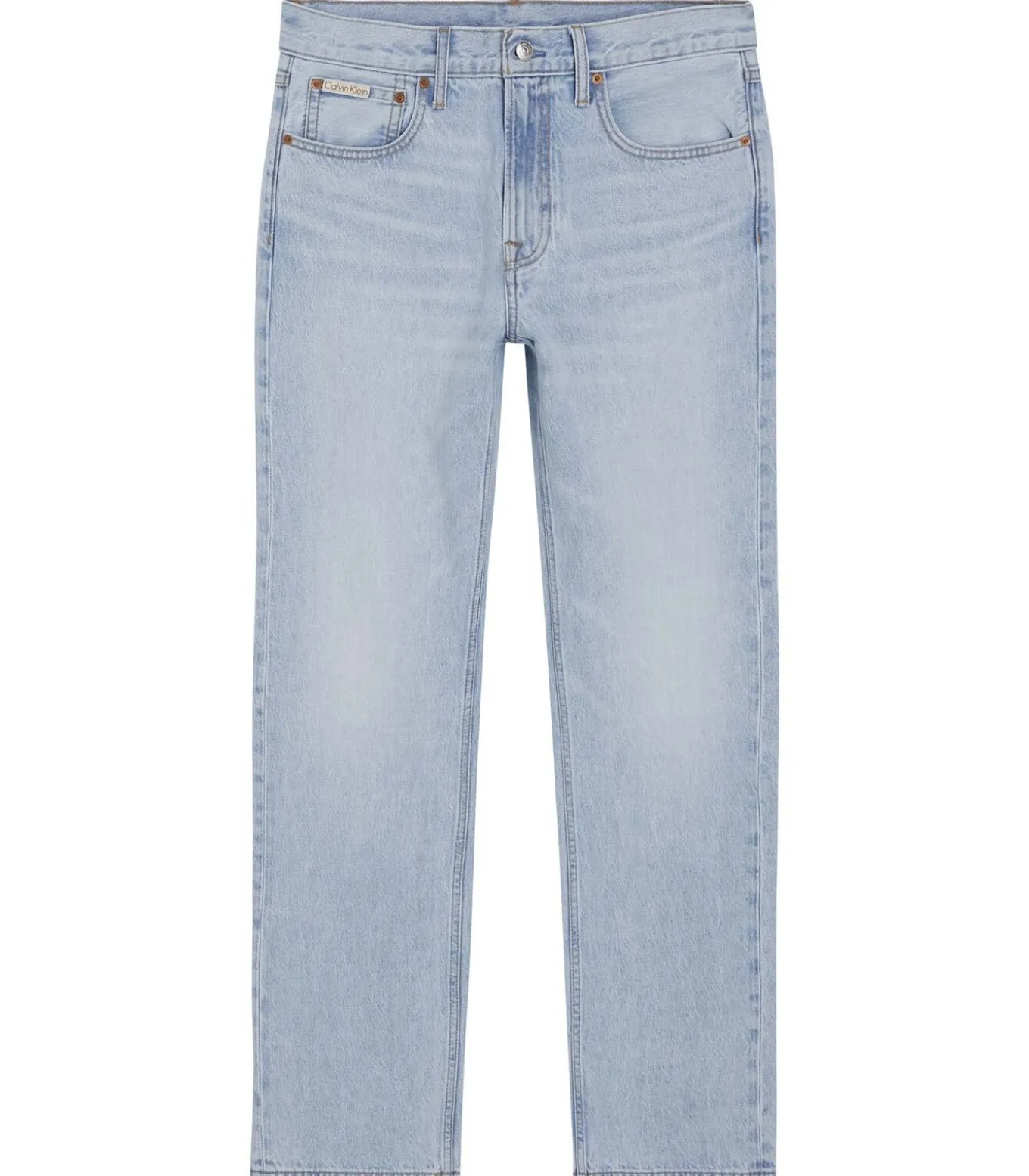 * Kleur: Marbled Beacon * Lengte: lage taille met lange rechte pijpen * Pasvorm: relaxte pasvorm * Sluiting: knoopgulp * Details: niet–stretch stijve katoenen denim, zwaardere stof, vijfpocketmodel, lichtblauwe wassing, Calvin–logoklinknagels Klein en leren label * Gebruik: Ideaal voor een casual jaren 90 look, perfect te combineren met sneakers en oversized breisels