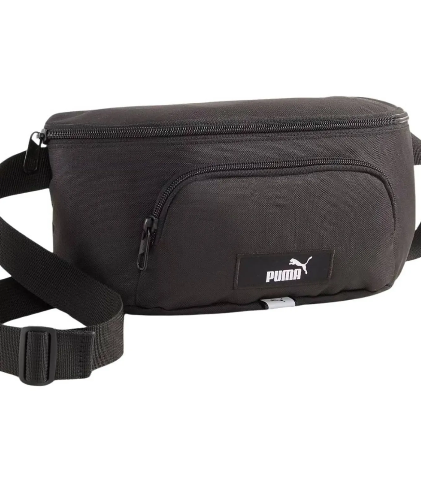 Puma Academy – Zwarte Tas, gemaakt van 100% polyester. Deze tas heeft een hoogte van 29 centimeter, een lengte van 14 centimeter en een breedte van 7 centimeter. Het volume is 2,8 liter. De tas beschikt over een voorzak en een ritssluiting. Binnen bevindt zich één hoofdvak met rits. De heupbanden zijn verstelbaar. De tas wordt vastgehouden door gespen. Het ontwerp van de tas toont het Puma logo, evenwijdig met reflecterend detail.