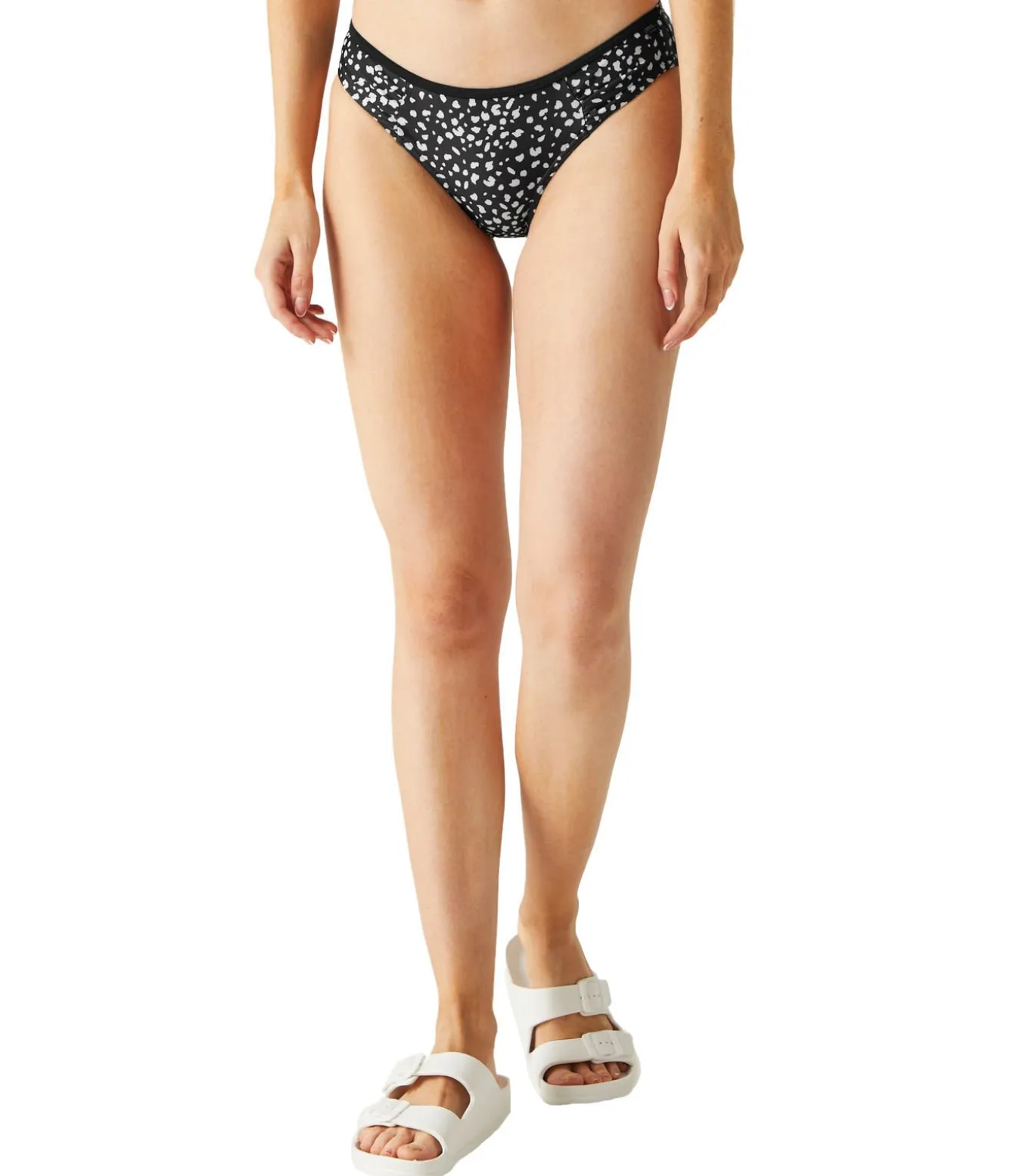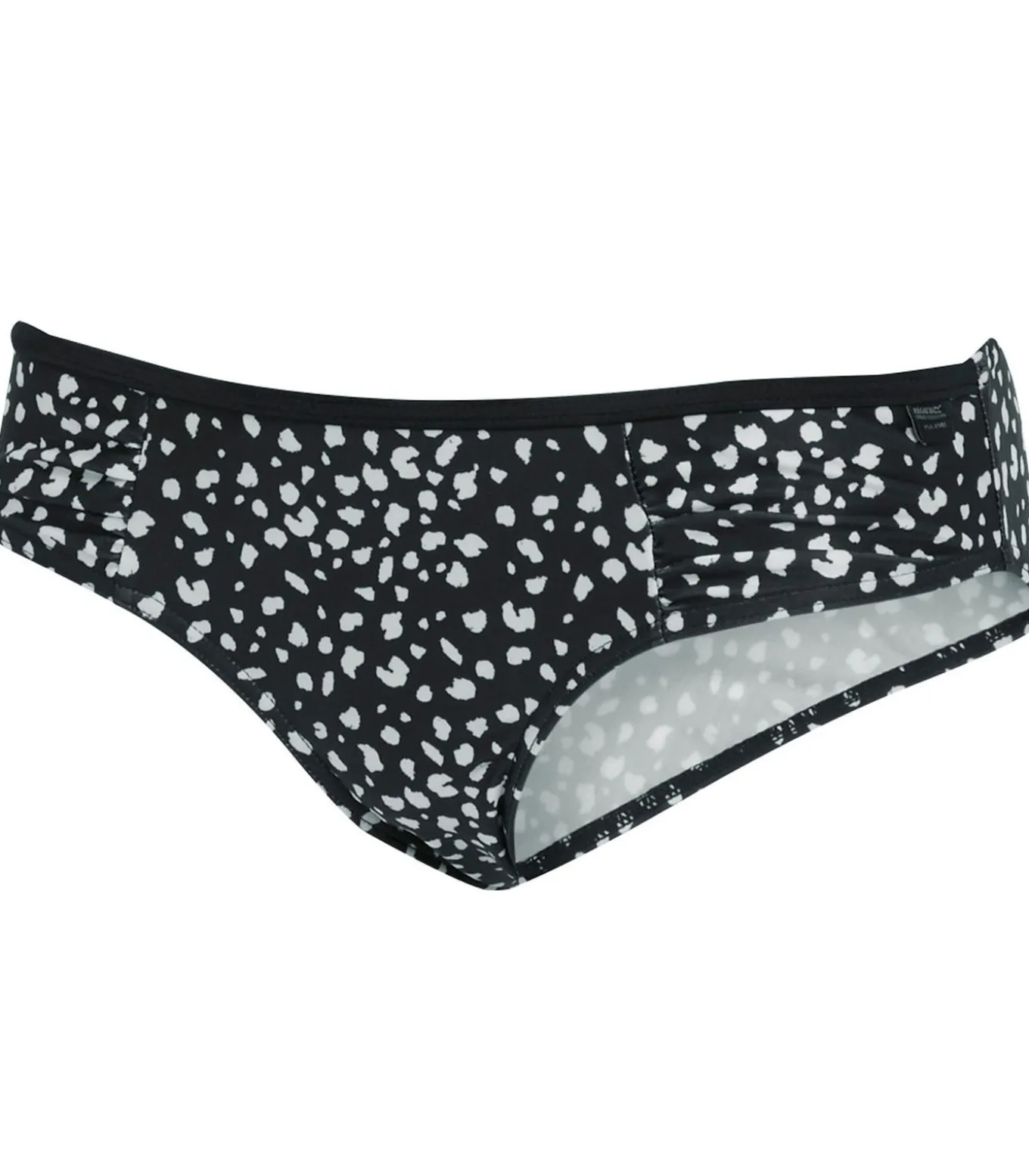 Regatta ACEANA Zwart Bikinibroekje is gemaakt van elastaan, polyamide en polyester. Het zwart stof heeft een geperforerde structuur, versierd met een algemene afdruk, logo en polka dot. Het wordt doorgetrokken met een slimme band. Op het zijkant zijn er gecarteerde tabbladen en ruches aanwezig. De slof is zacht en bevat UV–bescherming. De taille is elastisch met een slanke band, en heeft een UPF 50+ zonneschatting.
