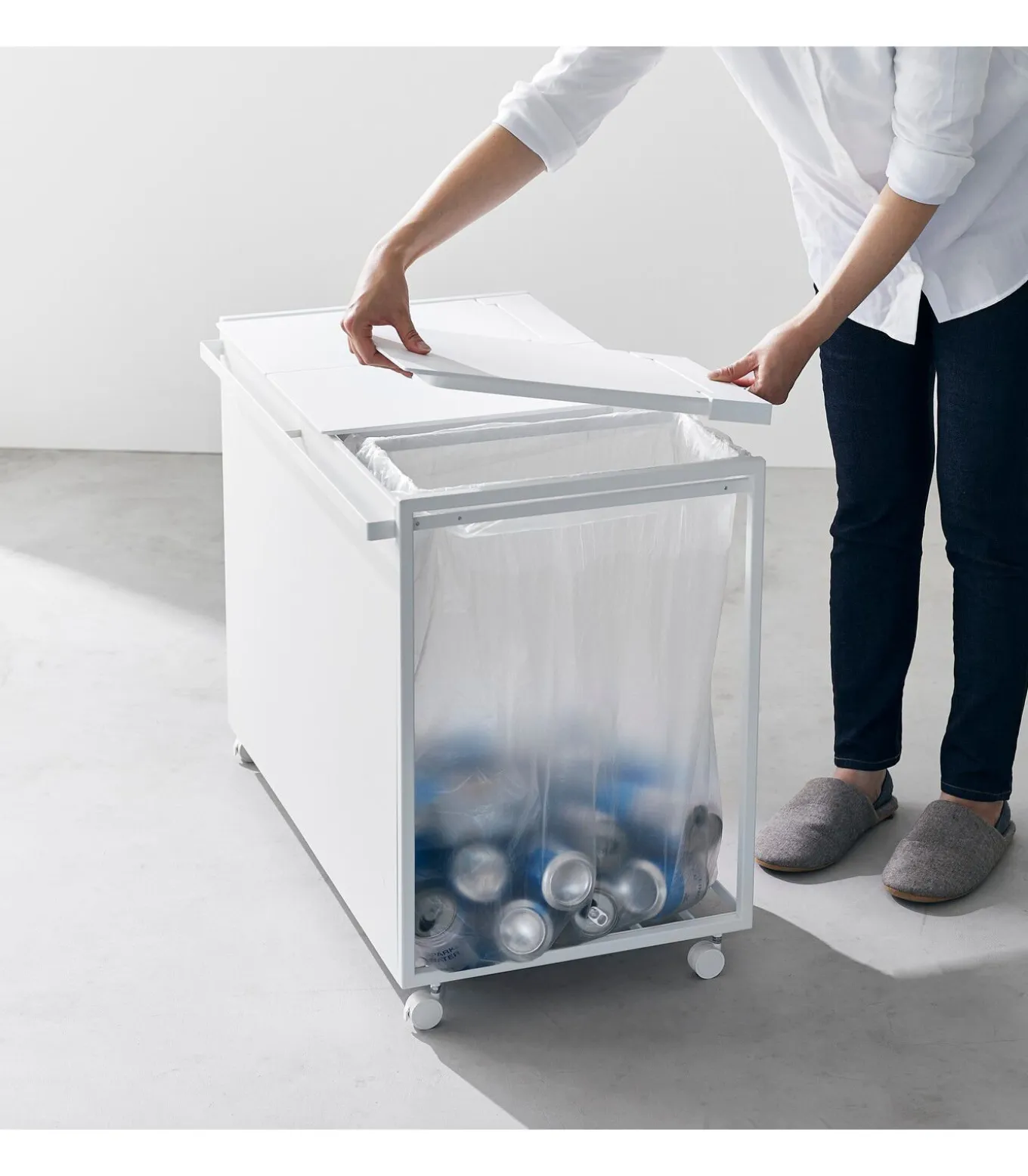 Deze prullenbak van Yamazaki heeft drie compartimenten waarin je boodschappen– of vuilniszakken kunt hangen. Dankzij de praktische wieltjes en handgreep verplaats je de prullenbak moeiteloos naar iedere gewenste plek. De deksel biedt niet alleen een discrete afsluiting, maar is ook gemakkelijk te openen en blijft dankzij een siliconenstopper op zijn plek staan, handig tijdens het vervangen van de zakken. Daarnaast biedt de onderste plank extra opbergruimte voor je voorraad vuilniszakken of andere benodigdheden.