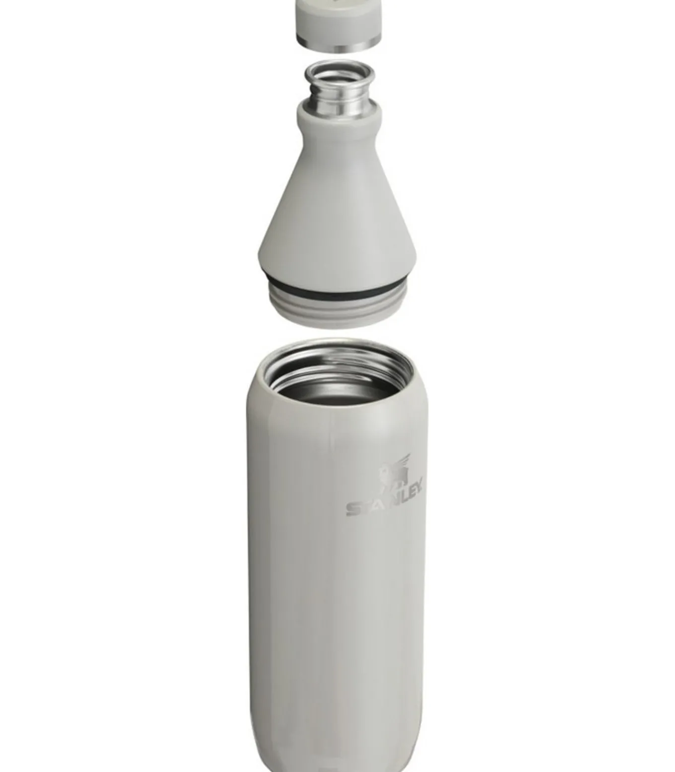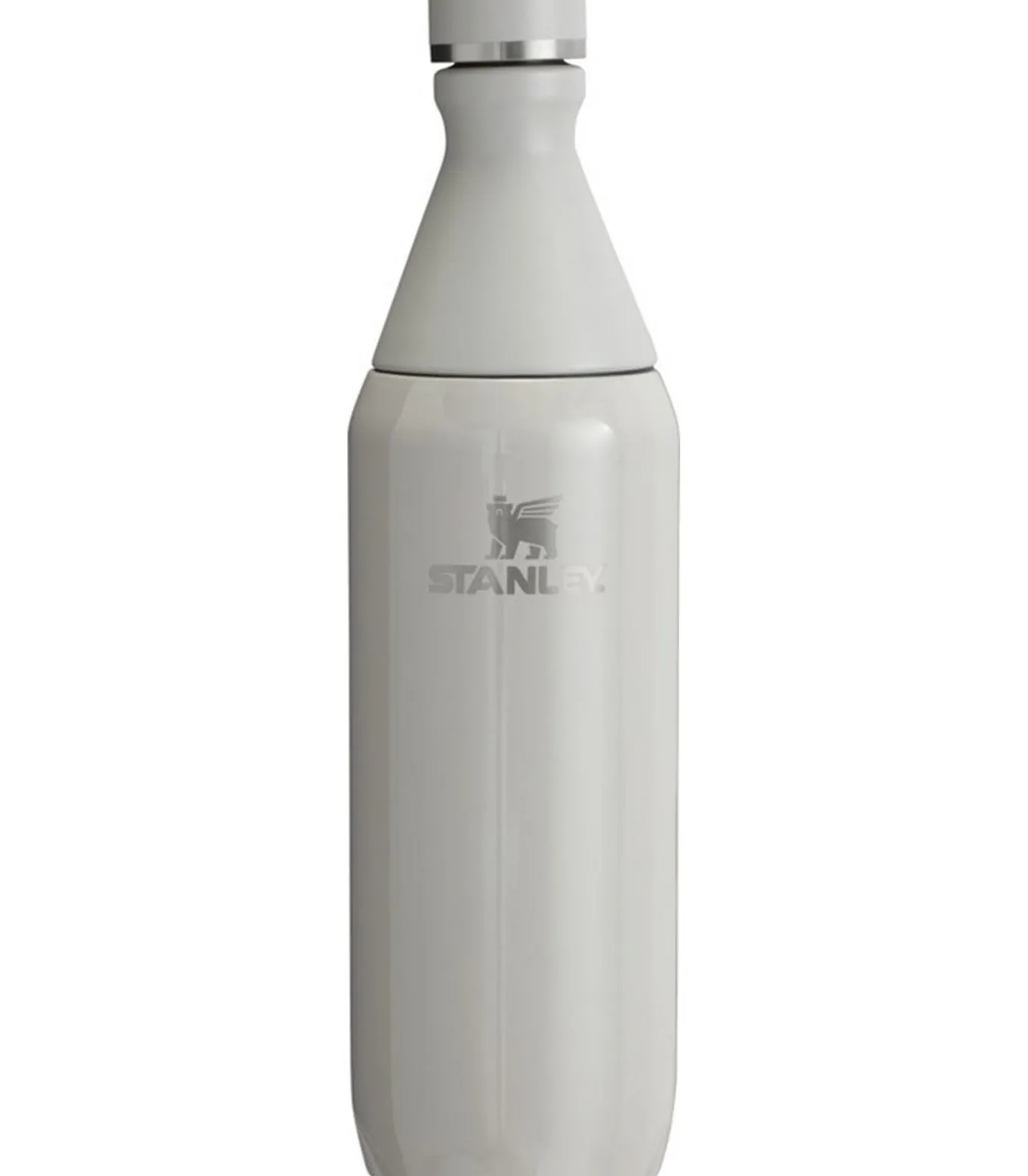 Stanley ALL DAG, waterfles zwart gemaakt van hergebruikt roestvrij staal met een hoogte van 26,4 cm, een lengte en breedte van elk 7,3 cm. Het heeft een dubbele wand, schroefdeksel en is vacuüm geïsoleerd. Het waterfles draagt het logo van Stanley en heeft een capaciteit van 600 ml.