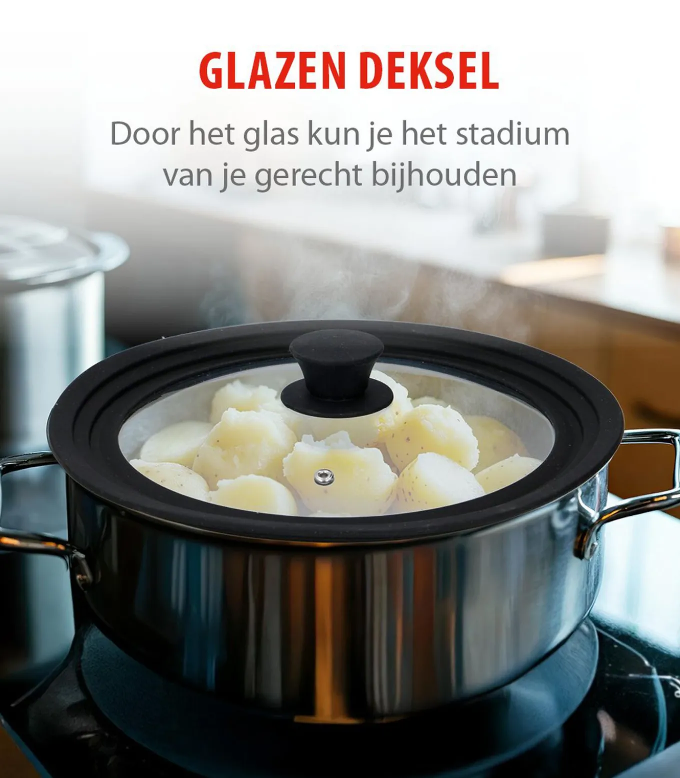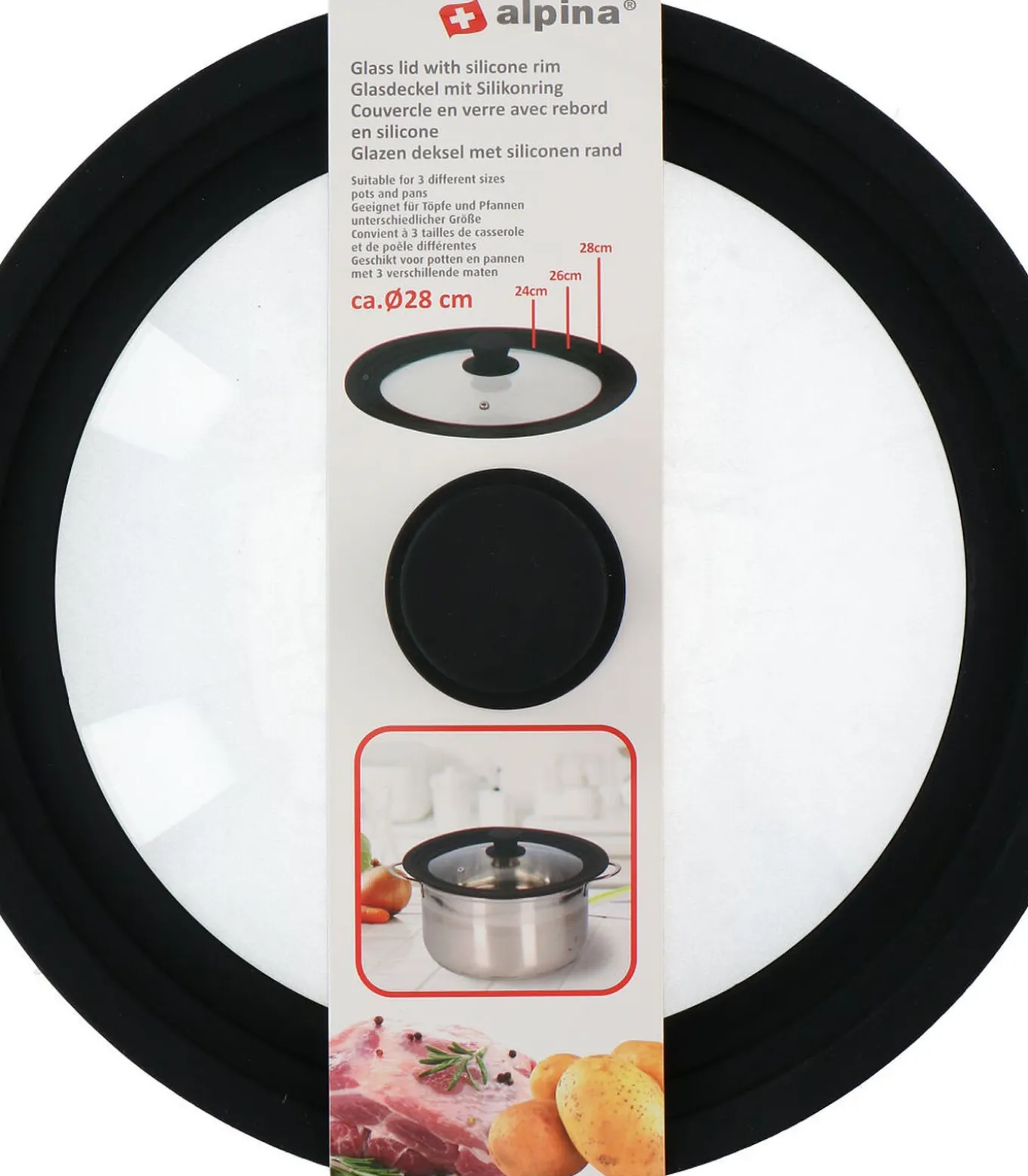 Alpina glazen pannendeksel met siliconen rand – universeel 28 cmMet deze glazen pannendeksel van Alpina met siliconen rand wordt koken een stuk makkelijker én veiliger. Dankzij de stevige siliconen rand past deze deksel perfect op pannen van 24, 26 en 28 cm en blijft de warmte goed in de pan. Zo kook je sneller en bespaar je energie!Het heldere glas zorgt ervoor dat je altijd zicht hebt op je gerecht zonder de deksel op te tillen. De handige handgreep en het stoomgaatje maken het koken extra comfortabel. Na gebruik mag de deksel gewoon in de vaatwasser, dus schoonmaken is zo gepiept.Extra informatieUniverseel geschikt voor pannen van 24, 26 en 28 cmMet isolerende siliconen rand voor extra veiligheidHelder glas voor optimaal zicht op je gerechtVaatwasserbestendig voor eenvoudig schoonmaken