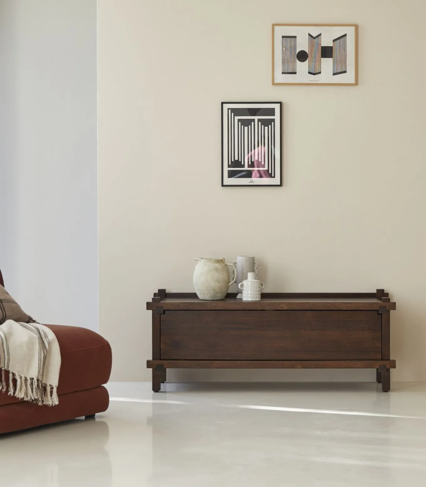 Het tv–meubel Arko in massief mangohout is er in een versie met lades.