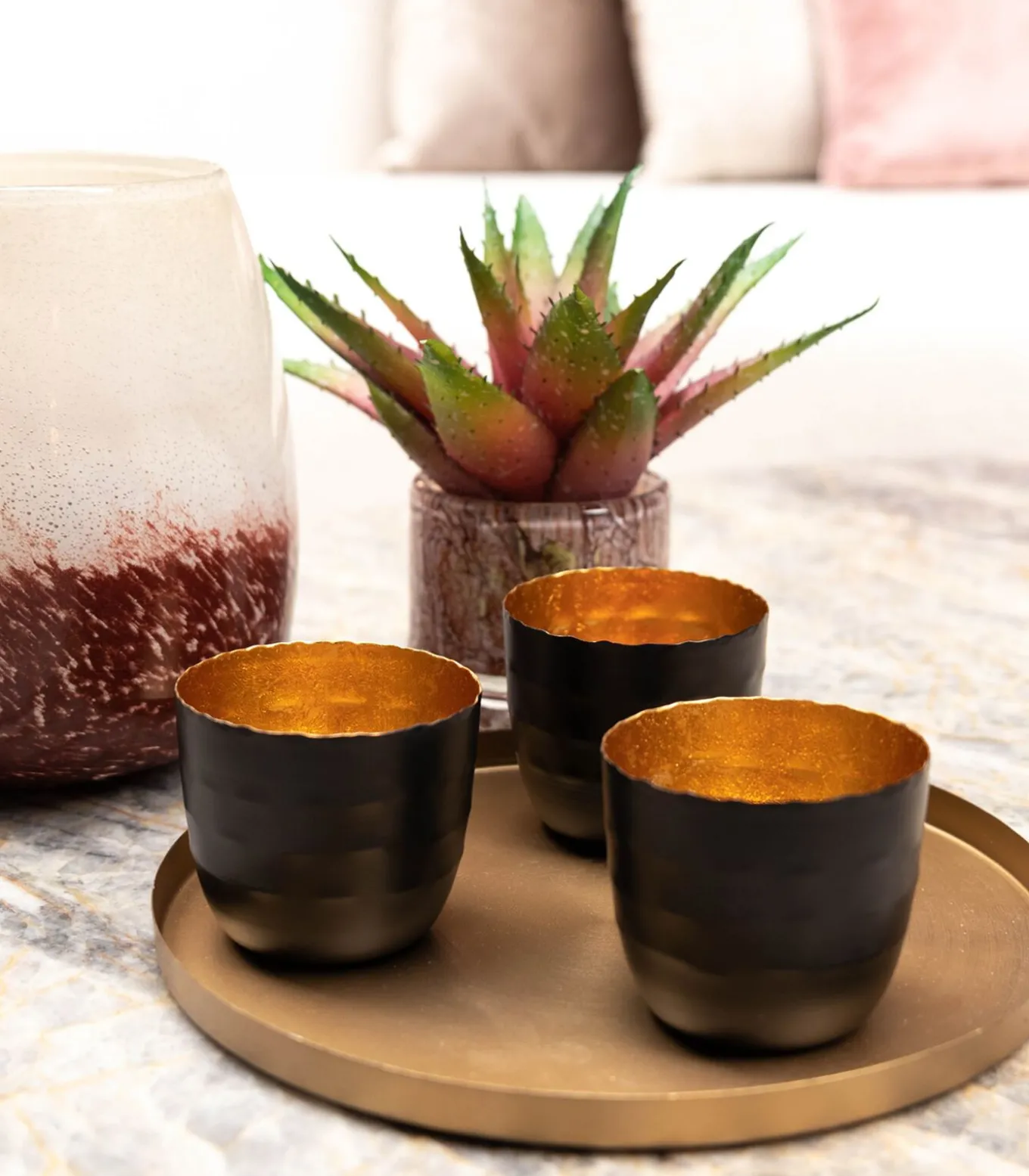 De set van 3 theelichthouders Arras mag niet ontbreken in je interieur. De 3 kommetjes zijn stoer én elegant. De binnenzijde lijkt wel van bladgoud en contrasteert mooi met de pikzwarte buitenkant. Dit trio kan je overal een plaatsje geven. En nog eens… en nog eens… Zoekwoorden : Kaarshouder, Zwart,