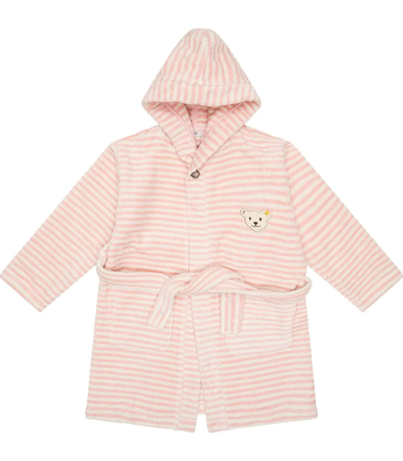 Gestreepte badjas voor jongens en meisjes van het merk Steiff. Pluizige jas met een capuchon en twee zakken aan de voorkant. Ceintuur voor een perfecte pasvorm. Klein teddybeermotief op de linkerborst. Aangenaam om te dragen dankzij het zuivere katoen.