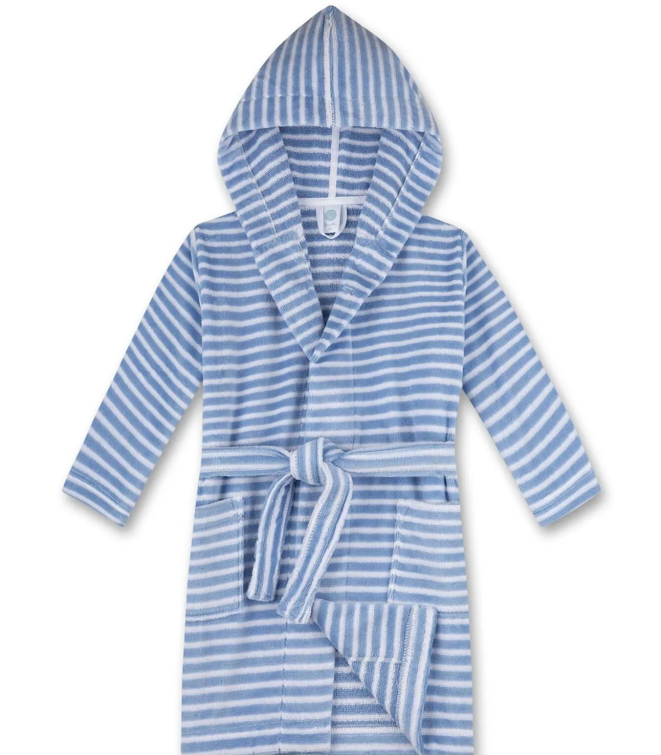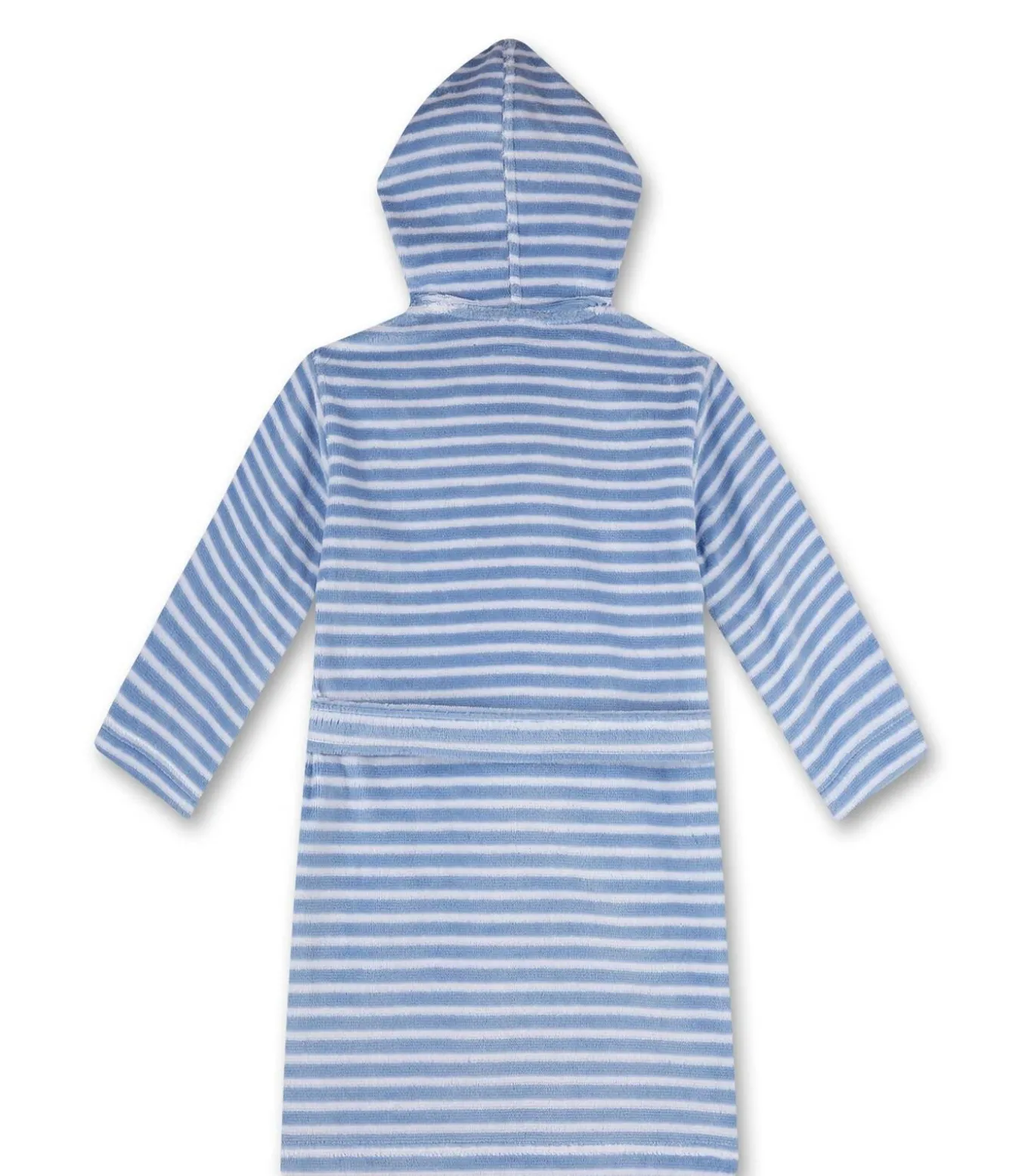 Badjas voor jongens en meisjes van het merk Sanetta. Gestreepte jas met een capuchon, bindceintuur en twee zakken aan de voorkant. Zachte katoenmix.