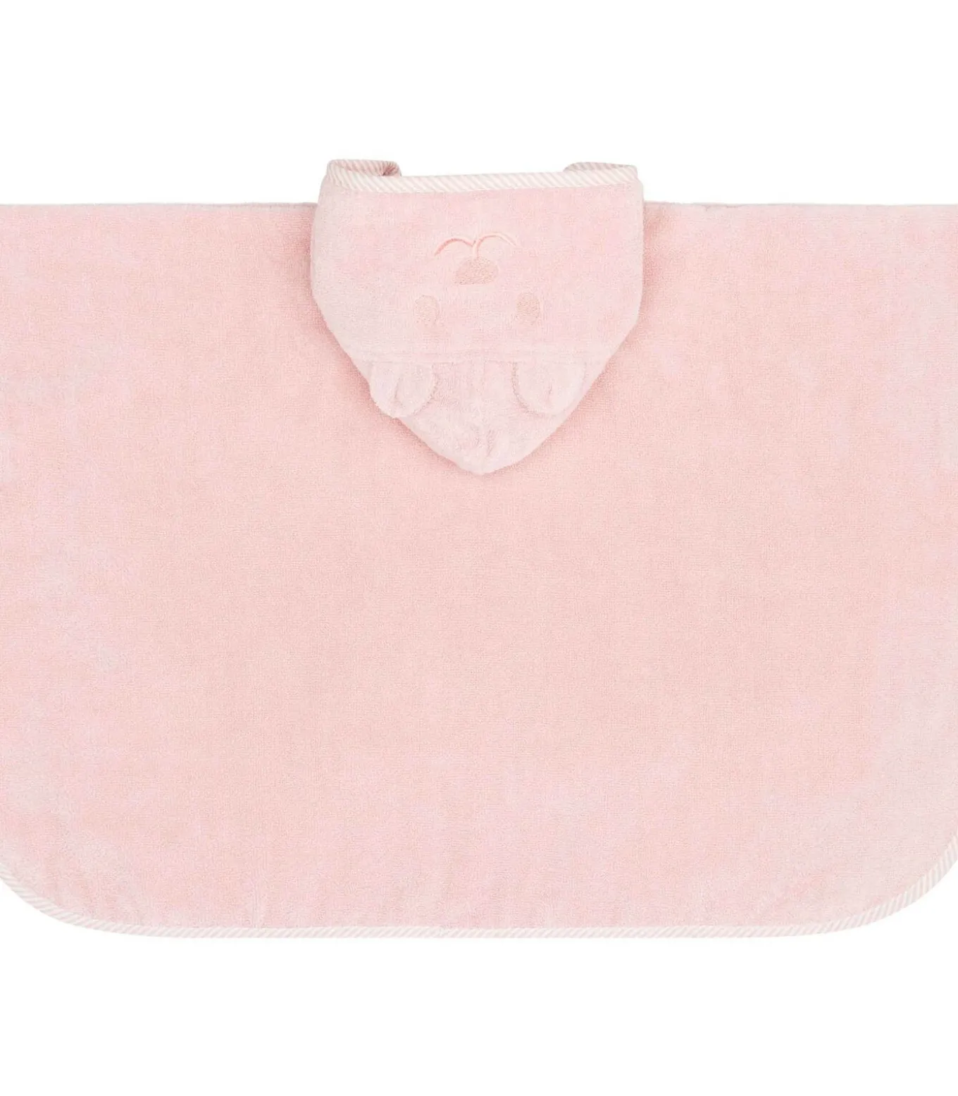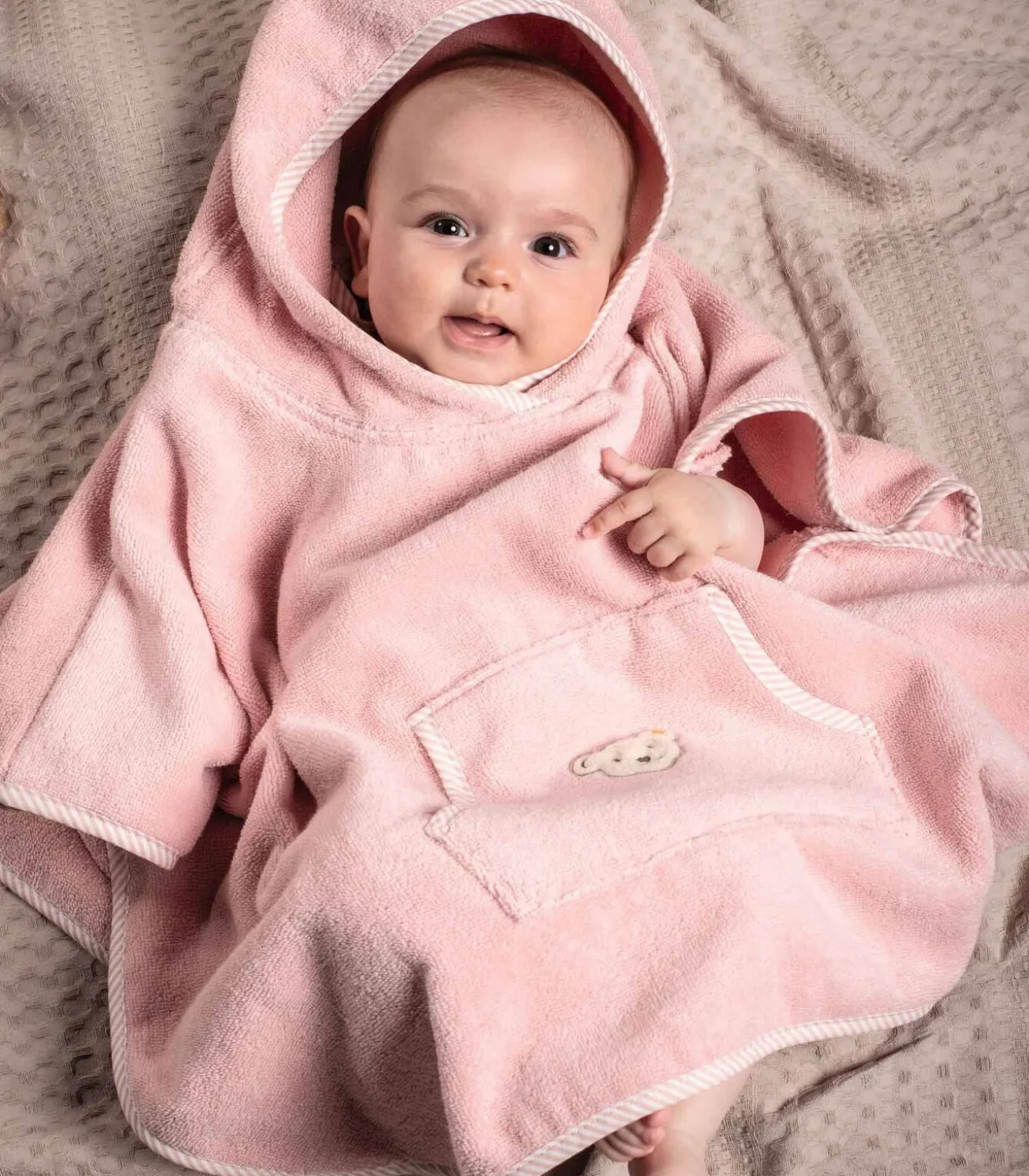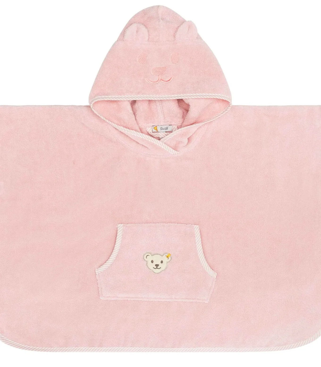 Pluizige, zachte badstof badponcho van het merk Steiff. Met een grote capuchon en drukknopen aan de zijkant. Teddybeermotief op de zak. Puur katoen.