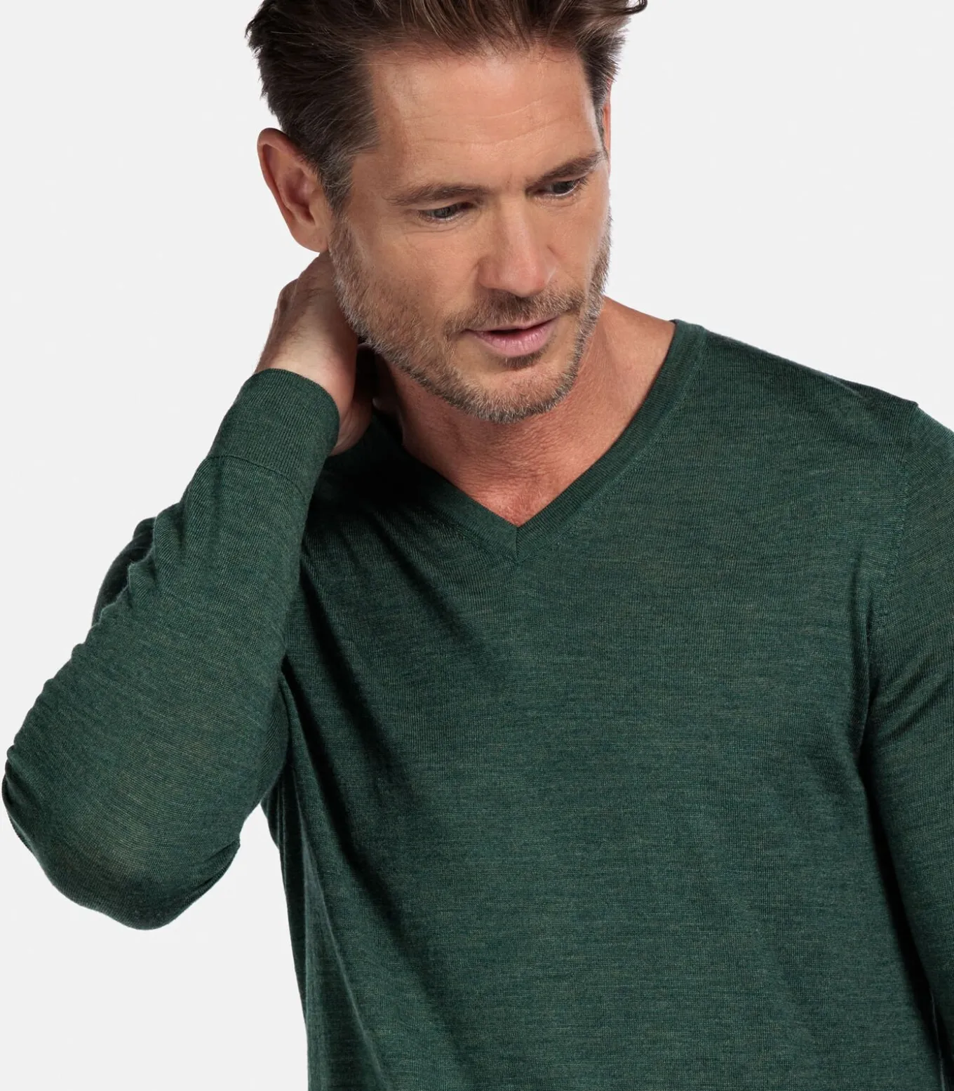 Deze trui met V–hals is gemaakt van merino wol, een zachte, warme en lichtgewicht pullover. Het fijngebreide design met moderne pasvorm geeft een luxe, tijdloze uitstraling. Draag hem solo voor een ingetogen look of over een overhemd voor een verfijnde, gelaagde stijl. De perfecte kleur voor het najaar. Artikelnummer 520065–73