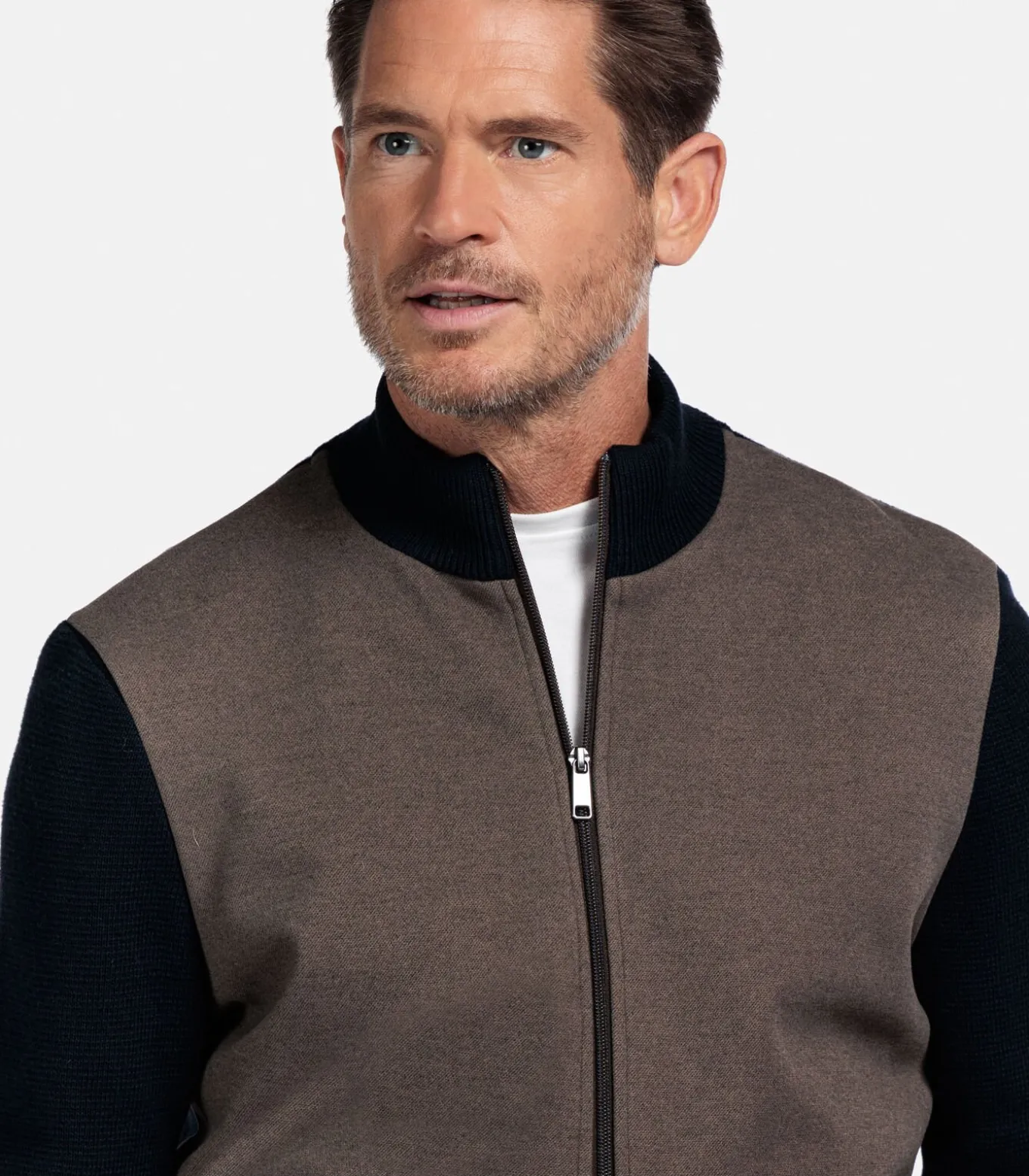 Dit vest combineert een flanel voorpand met gebreide mouwen en een achterpand van katoenmix in een contrasterende kleur. De ribgebreide boorden bij kraag, mouwen en zoom versterken het kleurcontrast en geven het vest een moderne, sportieve uitstraling. Het model is uitgevoerd in een regular fit met opstaande kraag, ritssluiting en zakken in de zijnaden. De mix van materialen zorgt voor comfort, warmte en een luxe, casual look. Artikelnummer 522093–87