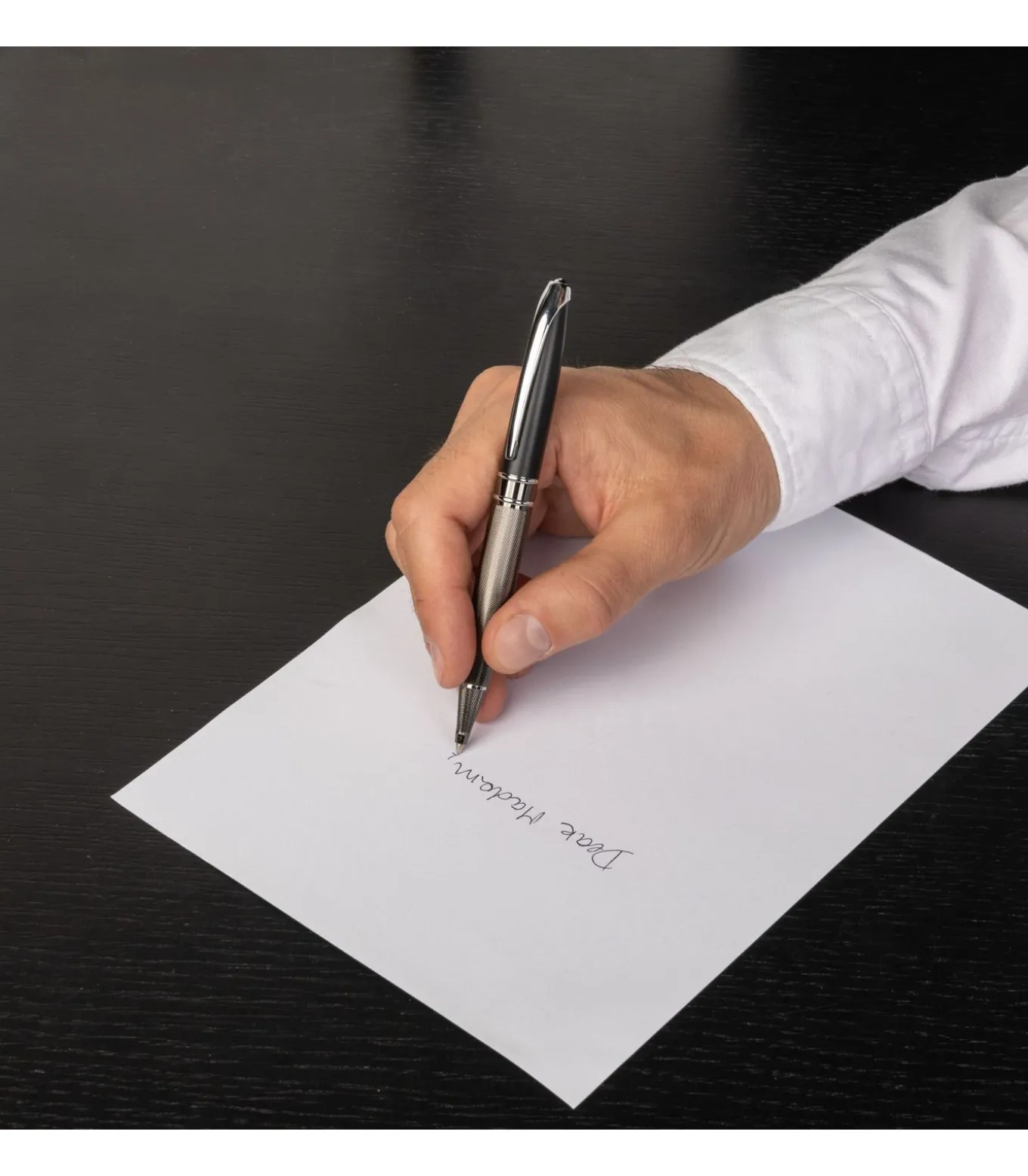 De “Abbey” pen is gebaseerd op een van de meest iconische silhouetten van Cerruti’s schrijflijn. De pen is nu opnieuw uitgevonden door een matzwarte lakafwerking te mengen met een diamantgeslepen gegraveerde onderste loop, modern en elegant. Dimensions: DIA.12/H.140 mm, Material: Brass,Metallic paint (matt),Gun plating