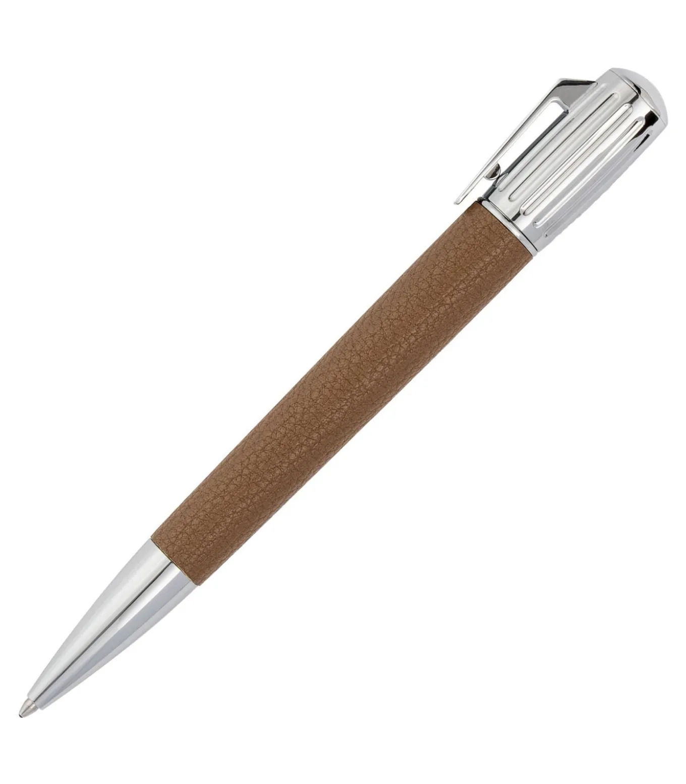 The Pure line, with its tapered yet aerodynamic silhouette, redefines modern aesthetics through structural simplicity. This new Iconic edition imbues timelessness into our long–time best–selling silhouette, featuring crisp and classical chrome accents, and barrels wrapped in luxurious, subtly pebbled textures. The ribbed design and unexpectedly placed logo on the cap add a contemporary touch to this timeless piece. The grained texture is crafted from PU. This line is available in two color versions: camel or black, each adorned with chrome trims and detailing Dimensions: DIA.14.4/H.140 mm, Material: Brass,Chrome plating,Leather