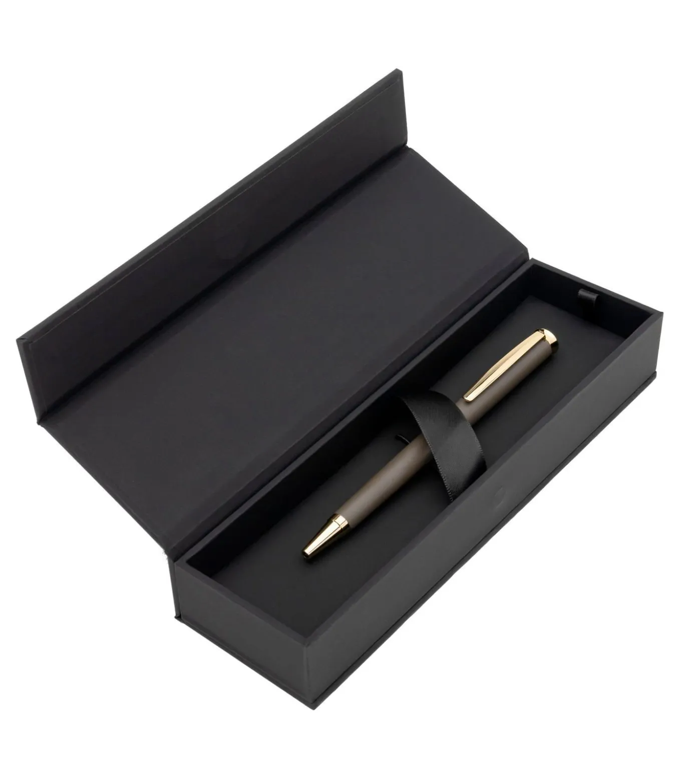 De vrouwelijke & slanke “sophisticated” pennen zijn dit jaar in een nieuw jasje gestoken, passend bij onze nieuwe vrouwelijke “Triga” accessoirelijn met een reeks warme & neutrale tinten: zwart, taupe & nude, deze schrijfinstrumenten zijn perfect te mixen & matchen in combinaties die passen bij uw smaak, om zo ingetogen maar verfijnde geschenksets te creëren. De vergulde afwerking zorgt voor de laatste luxe en vrouwelijke touch. Dimensions: DIA.9.8/H.136 mm, Material: Brass,Lacquer