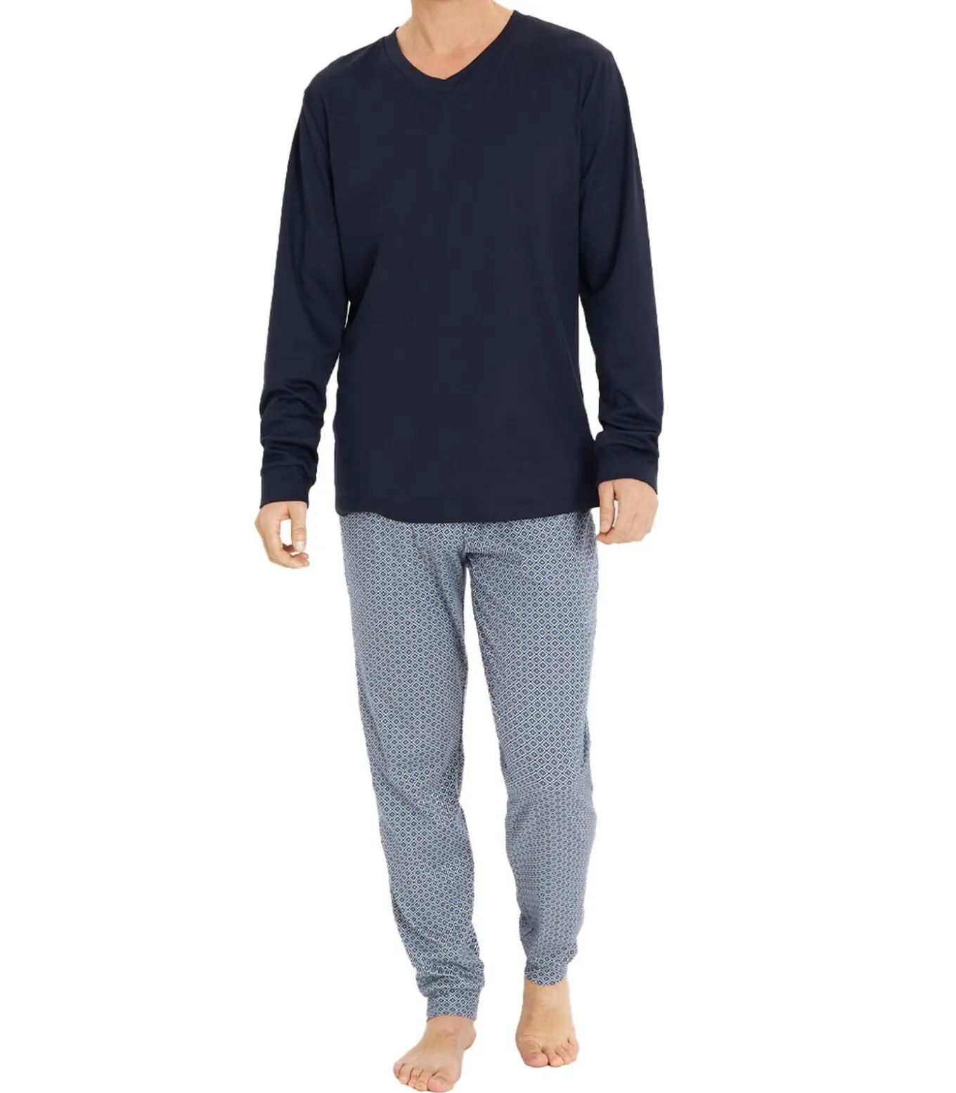 Deze casual pyjama is ontworpen voor maximaal comfort! De broek en mouwen hebben comfortabele manchetten en de broek, ontworpen met een minimalistische print, heeft een elastische tailleband voor een perfecte pasvorm. De V–hals van de effen top is ook afgezet met elegante biezen.