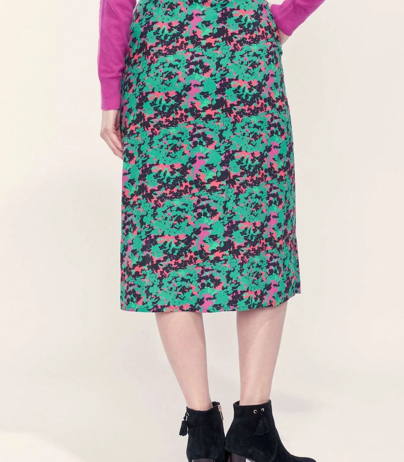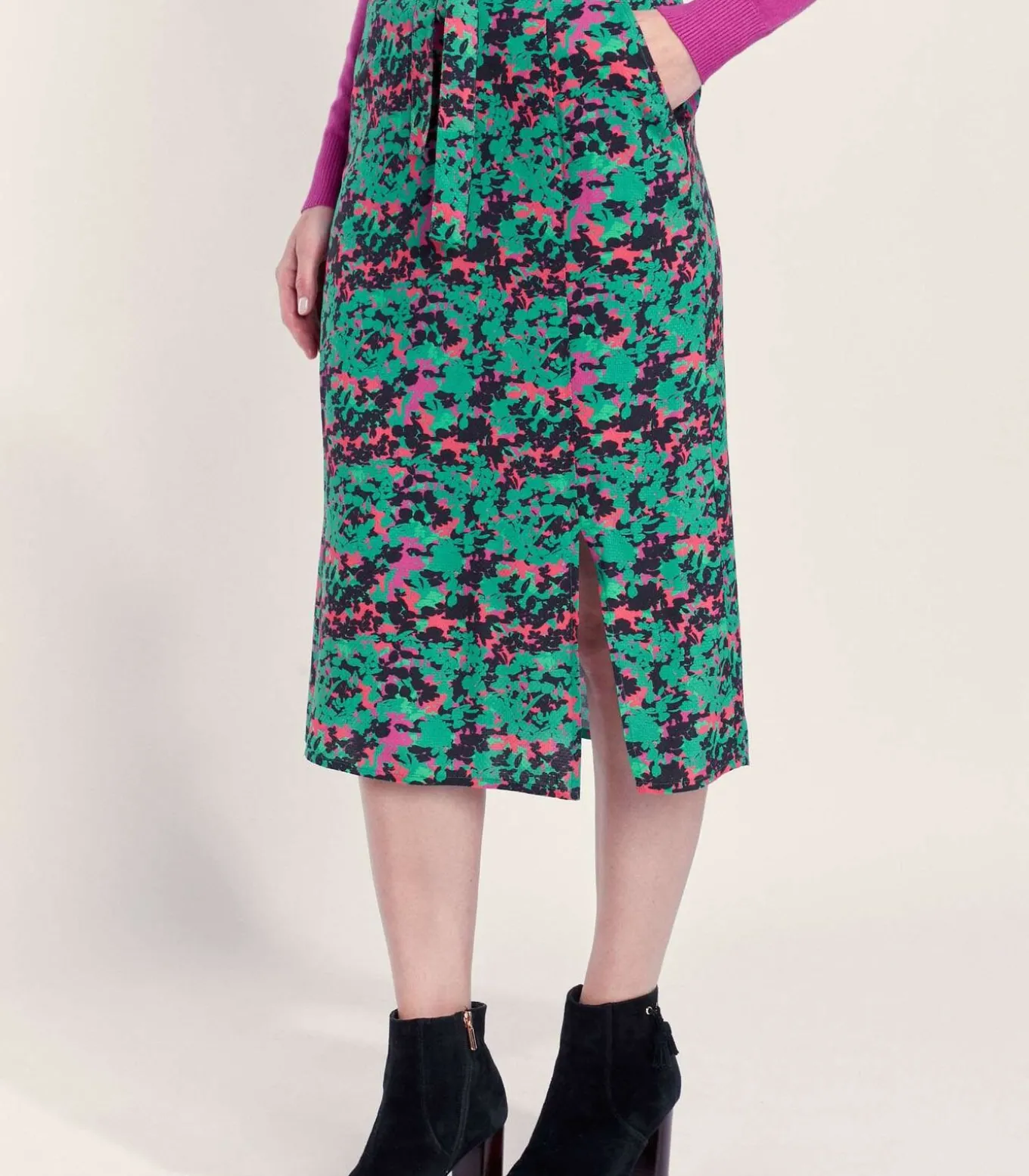Vloeiende rok onder de knie van viscose Lenzing Ecovero met een split. Zakken in de zijnaden. Onzichtbare rits aan de linkerkant.