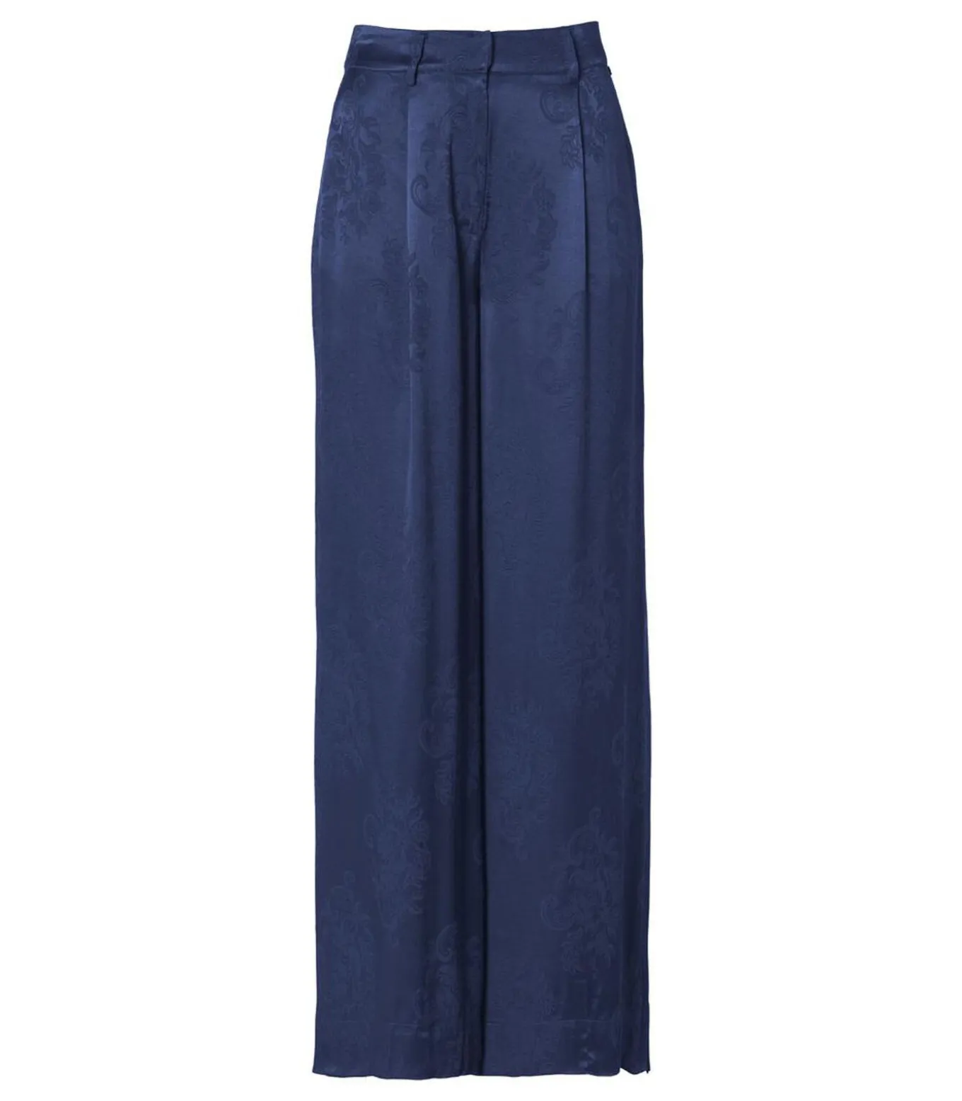 Maak kennis met de navy jacquard pantalon van Mart Visser, een stijlvol samenspel van elegantie en comfort. De broek heeft een recht en wijd uitlopend model dat een tijdloze uitstraling creëert en geschikt is voor diverse gelegenheden, van formeel tot casual. De hoge taille met elastiek aan de achterzijde zorgt voor een comfortabele en perfecte pasvorm. Voorzien van schuine steekzakken voor en nette strookzakken achter, straalt de pantalon verfijning uit. Het subtiele jacquard bloemenpatroon geeft de stof een luxe textuur en maakt de broek een blijvende toevoeging aan je garderobe. Combineer hem met de Bension blouse of de Bellize blouse voor een ton–sur–ton jumpsuit–effect, of draag hem met een effen navy of witte top voor een moderne daglook. Fashiontip: kies voor minimalistische accessoires en een clutch in neutrale tinten, zodat de jacquardstof volledig tot zijn recht komt. Dankzij de hoogwaardige materialen en zorgvuldige afwerking blijft de pantalon mooi in vorm en comfortabel om te dragen, seizoen na seizoen.