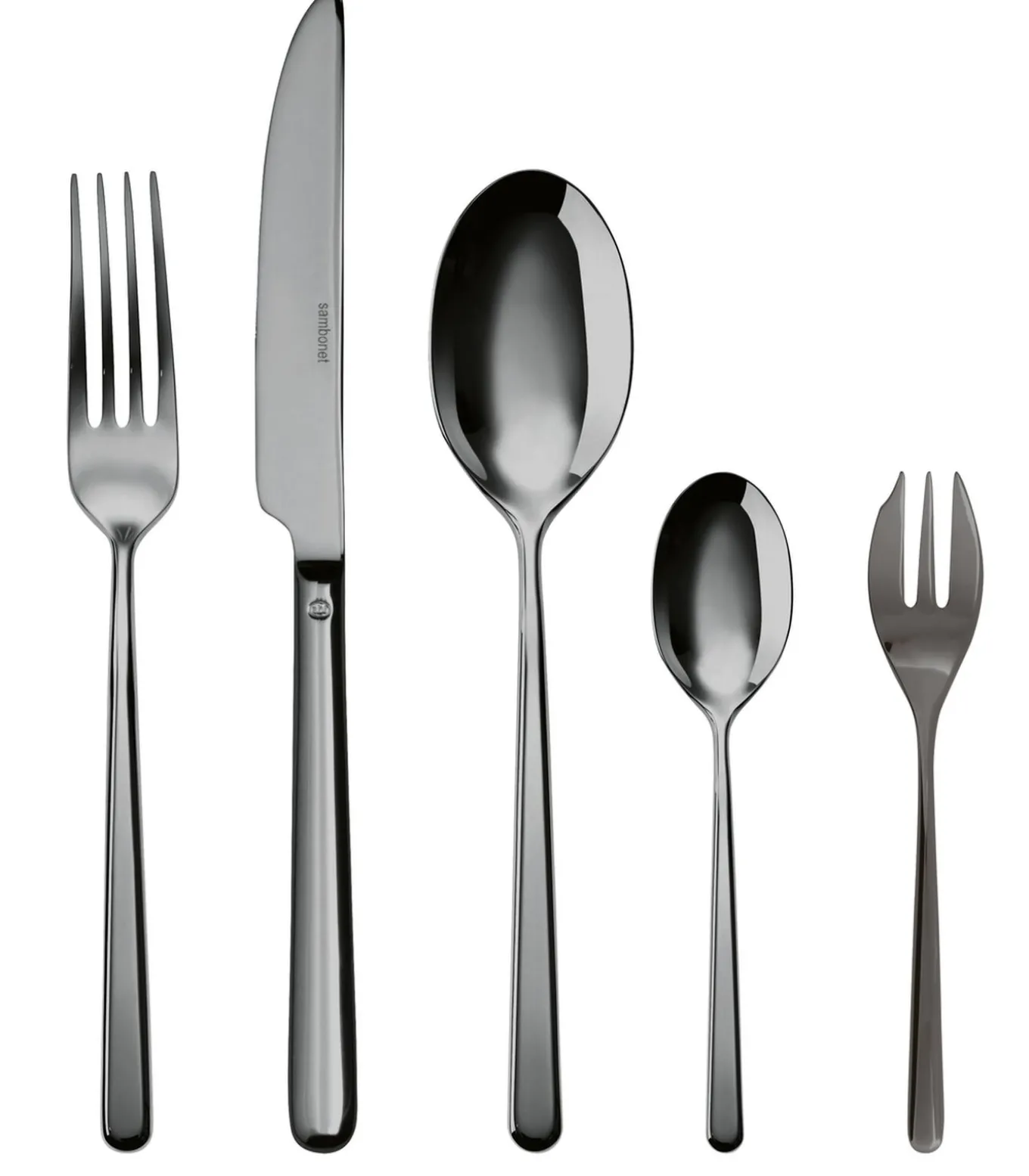 Met dit 30–delige bestek van Sambonet ben jij helemaal klaar om te eten met 6 personen! De Linear bestekset van Sambonet komt in meerdere kleuren, is tijdloos en straalt luxe uit. Kies voor zilver, zwart, koper of goud en geniet met familie en vrienden van een heerlijk diner. Dankzij de PVD–coating is het bestek bestand tegen krassen en kan het in de vaatwasser. De set bestaat uit: * 6 x Sambonet Tafelvork Linear Mirror PVD Black * 6 x Sambonet Tafelmes Linear Mirror PVD Black * 6 x Sambonet Tafellepel Linear Mirror PVD Black * 6 x Sambonet Gebaksvorkje Linear Mirror PVD Black * 6 x Sambonet Theelepel Linear Mirror PVD Black