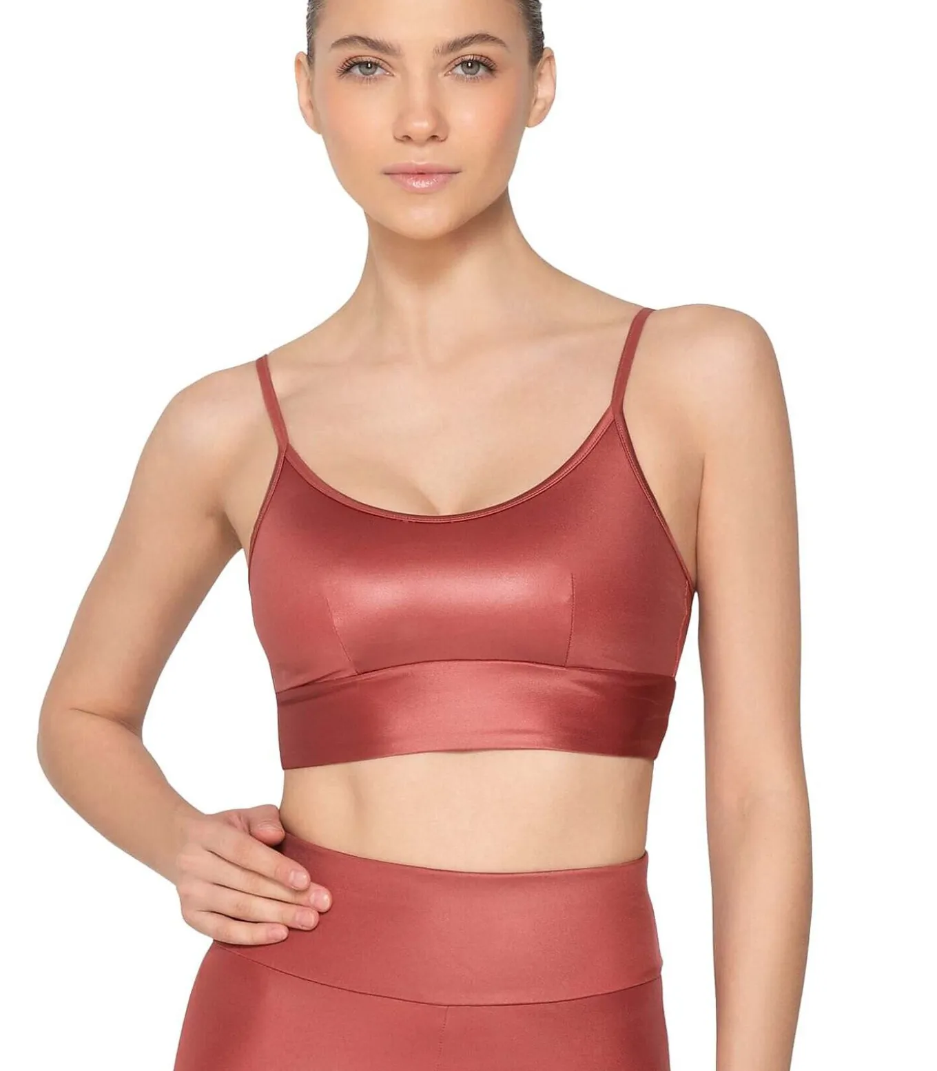 Slipe, slim–fit beha met een brede elastische band onder de buste voor goede ondersteuning. De rug is recht, met een lage halslijn en een klein goudkleurig logo in het midden. De dunne bandjes zijn verstelbaar voor een perfecte pasvorm. De minimalistische, moderne stijl maakt dit kledingstuk geschikt voor zowel sport als smart casual wear.