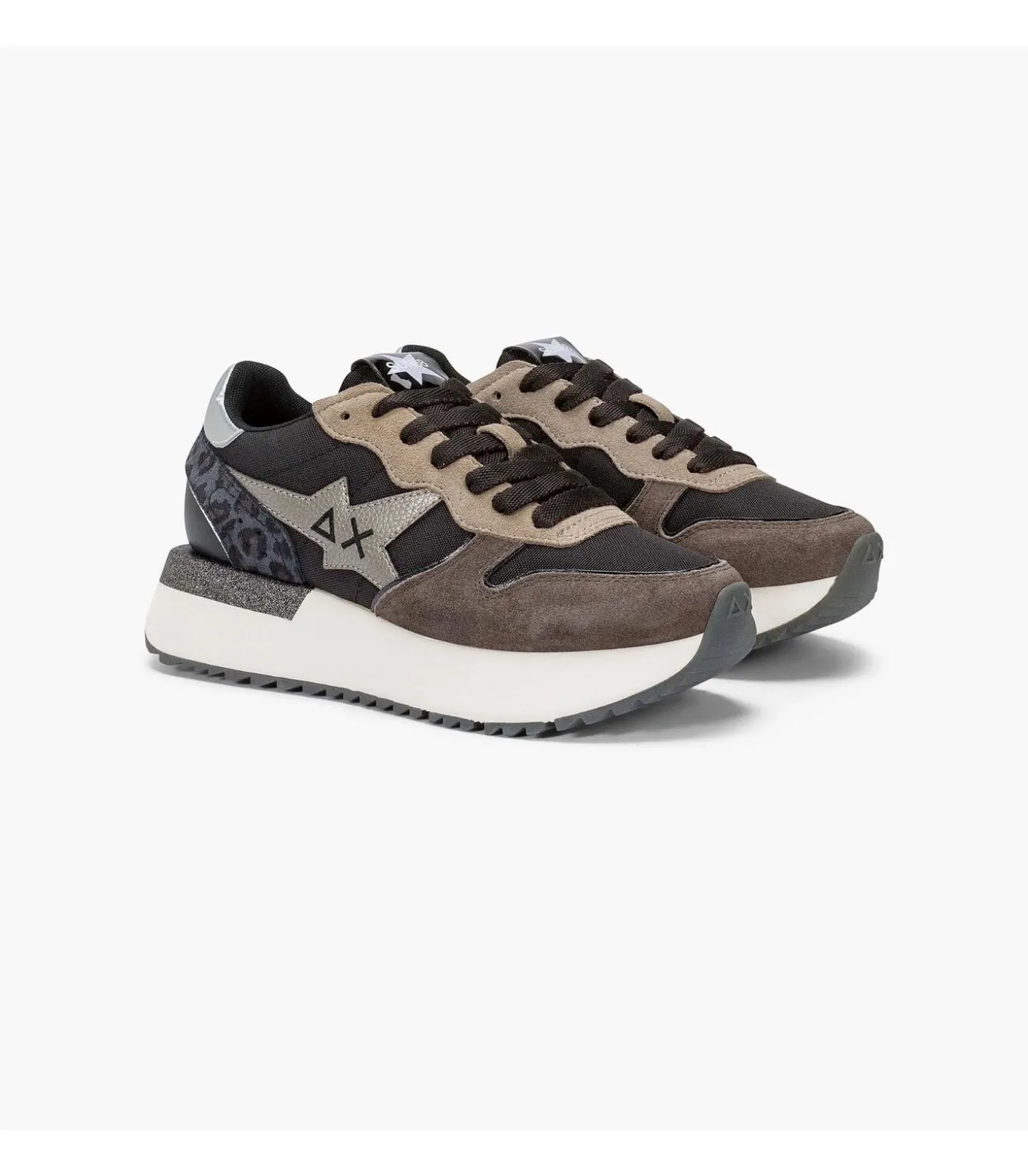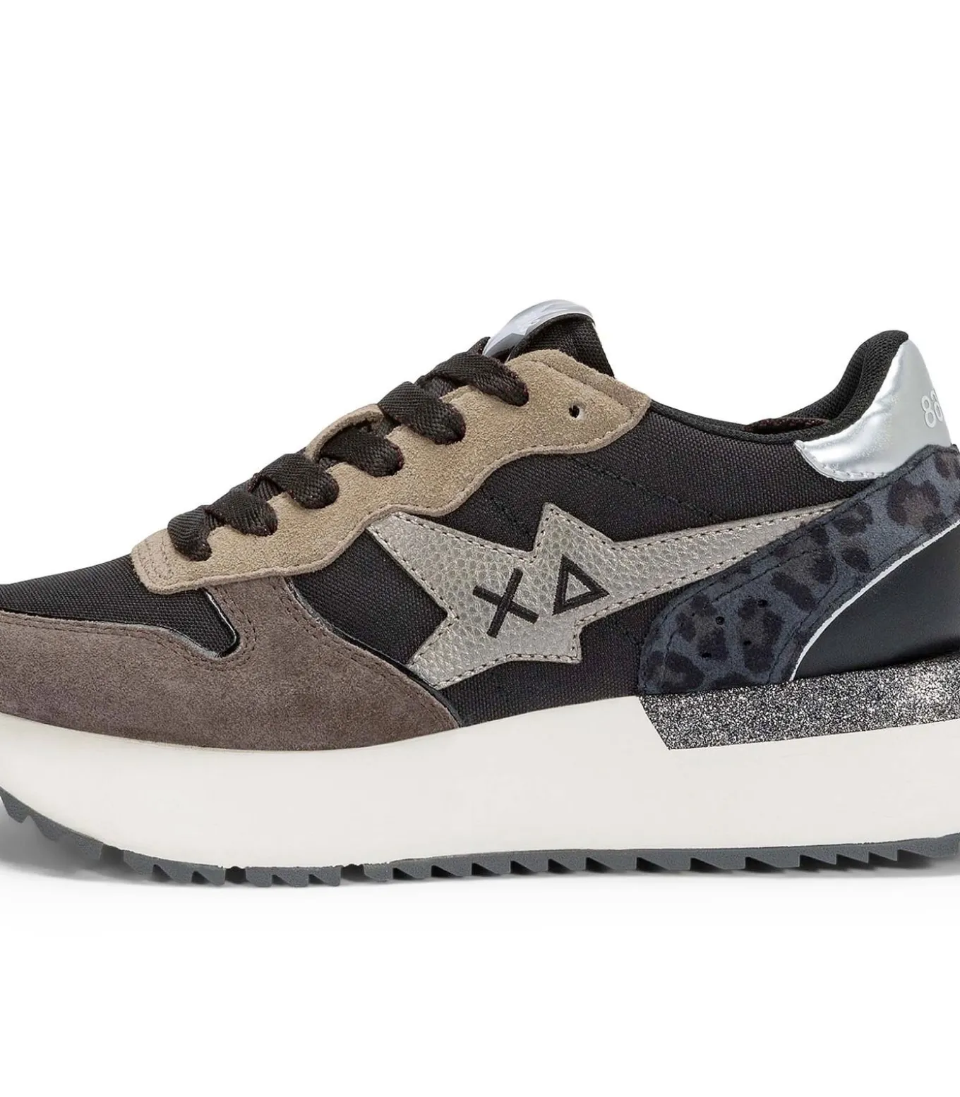 Kleur: Zwart. Samenstelling: 49% Leer, 41% Stof, 10% Polyurethaan. Details: Sneaker met plateauzool en een opvallend design, met een mix van materialen en dierenprints. Metallic details en een geborduurd logo op de zijkant maken de stoere en eigentijdse stijl compleet. Gebruik: Ideaal om urban outfits karakter te geven, perfect te combineren met jeans, een strakke pantalon of een casual jurk voor een moderne en trendy look.