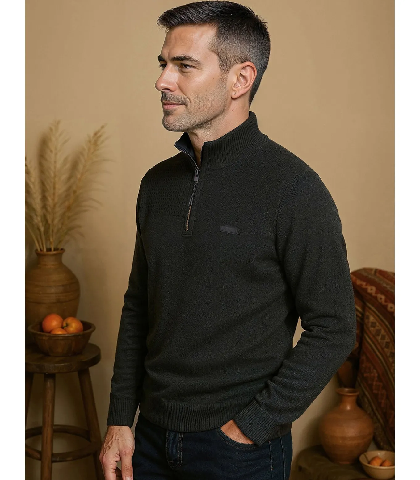 Kies voor elegantie en comfort met deze blauwe herentrui met rits, geïnspireerd op de drukte van Santiago. Gemaakt van een mix van 45% nylon, 30% acryl, 20% viscose en 5% kasjmier, biedt deze trui zowel warmte als zachtheid. De rechte snit en opstaande ritskraag geven een moderne touch, terwijl de geribbelde stretchboorden en manchetten zorgen voor een comfortabele pasvorm. Lange mouwen en het uitgewiste J&JOY–logo op het hart maken deze verfijnde look compleet. Mis de kans niet om deze must–have trui aan je collectie toe te voegen. Bestel nu en wees klaar om de winter stijlvol tegemoet te treden.