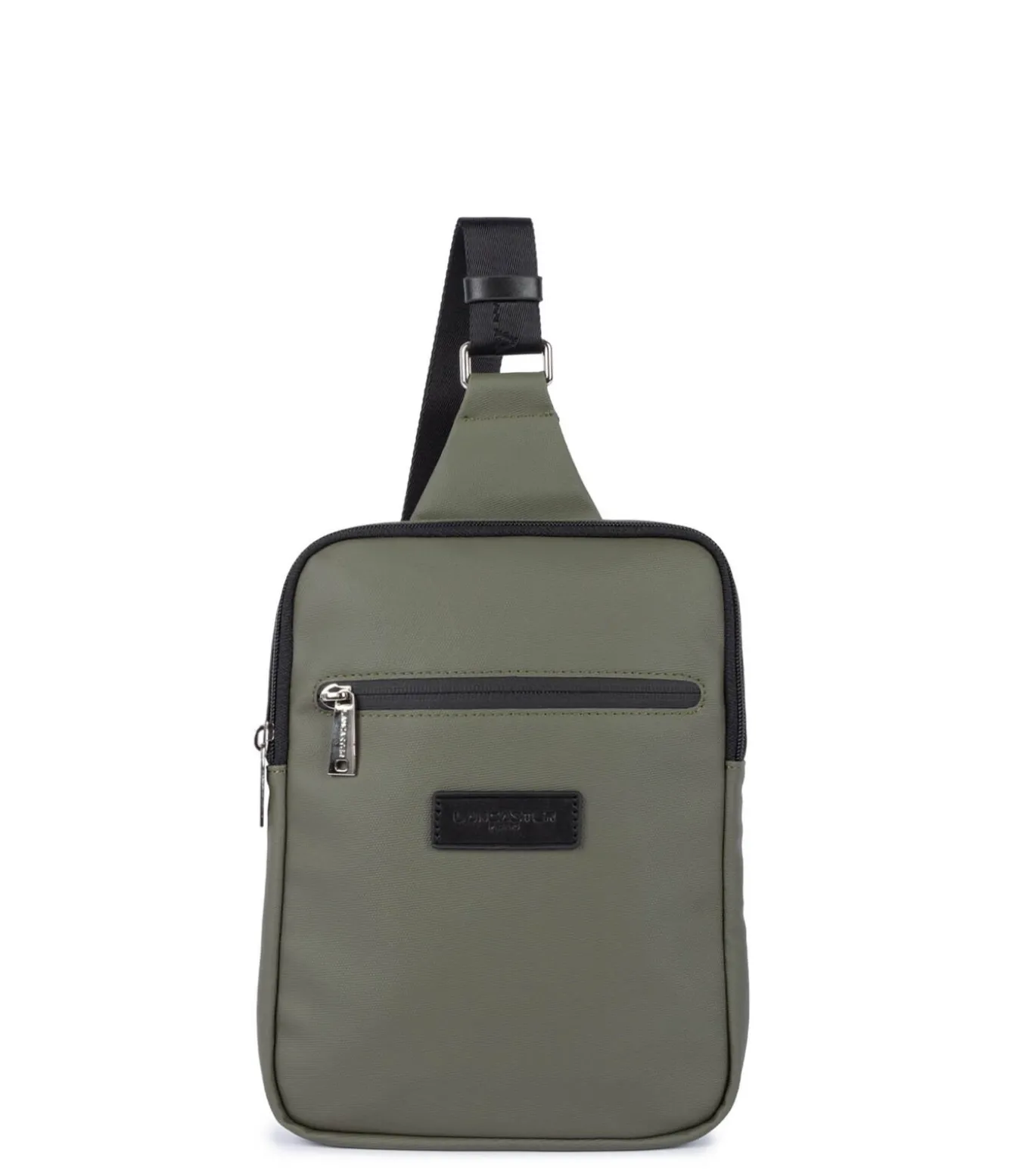 Deze bodybag is gemaakt van gecoat canvas en afgewerkt met rundleer. Ze heeft een voorvak met ritssluiting, een binnenvak met ritssluiting en een eenvoudige binnenzak. Ze wordt crossbody gedragen.