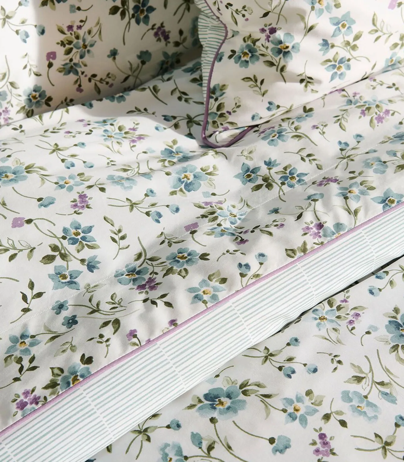 Delicate wikke– en vergeet–mij–nietjes in blauwtinten en parma openen zich in een ivoorkleurige zachte omarming.