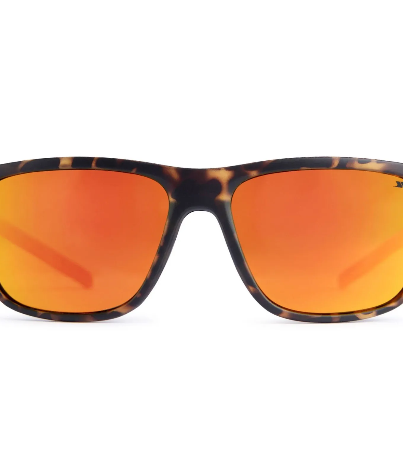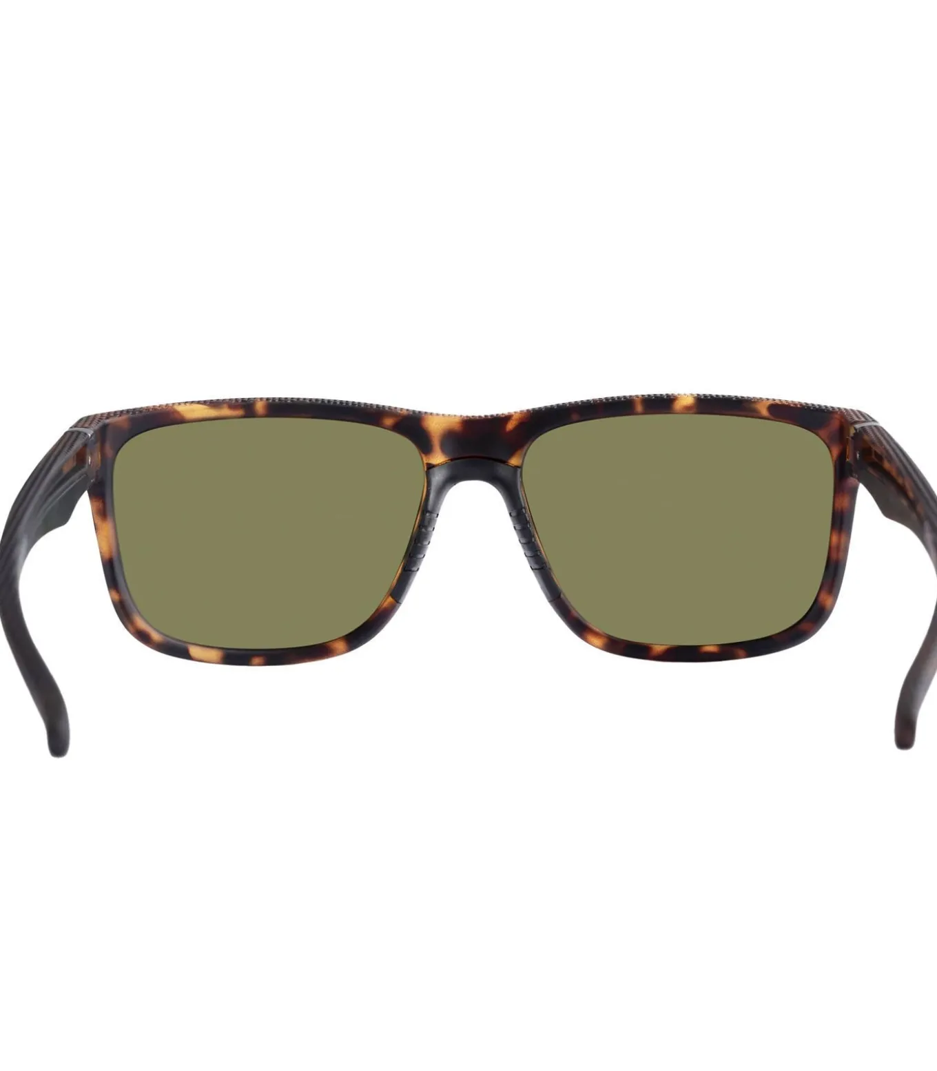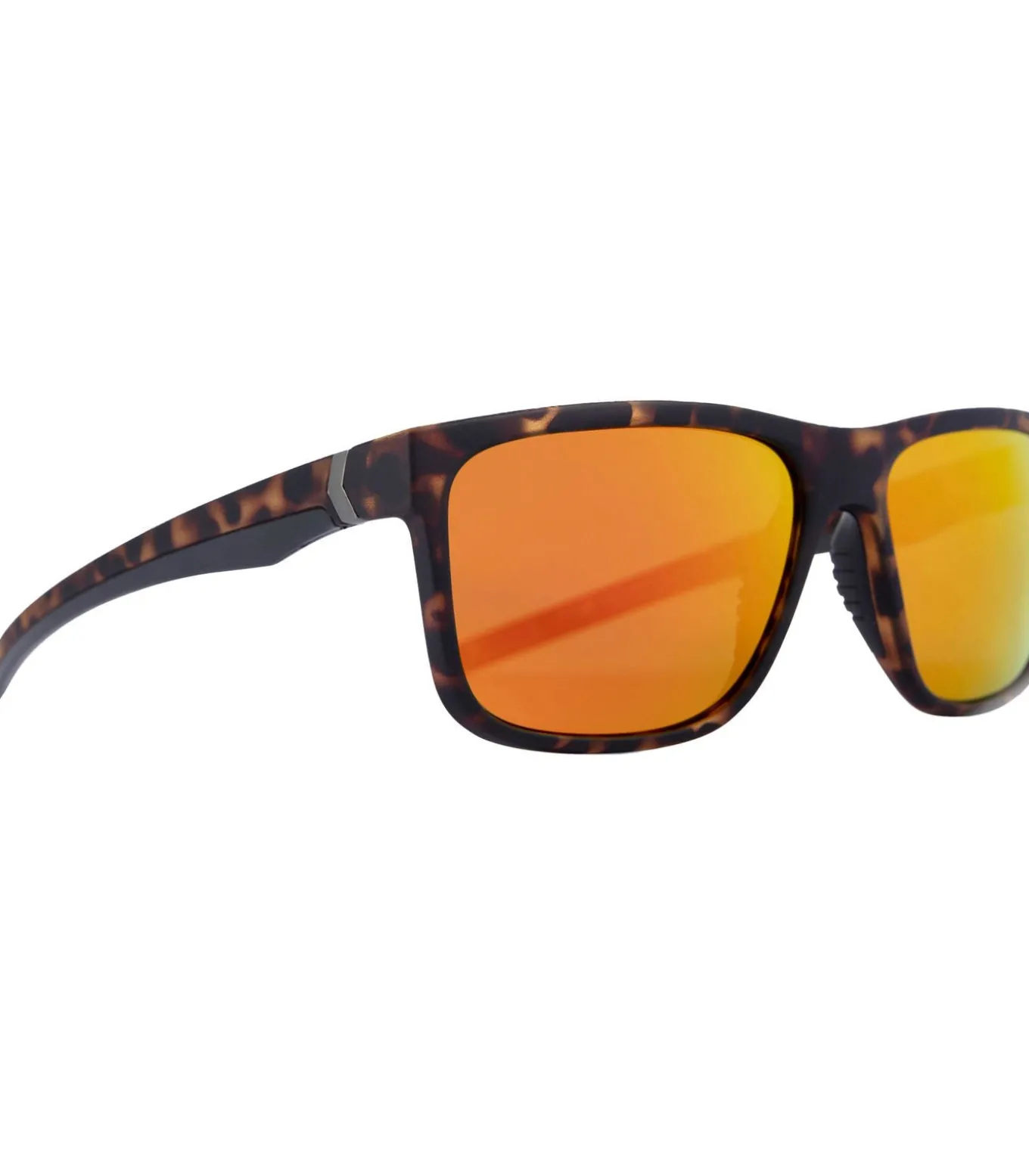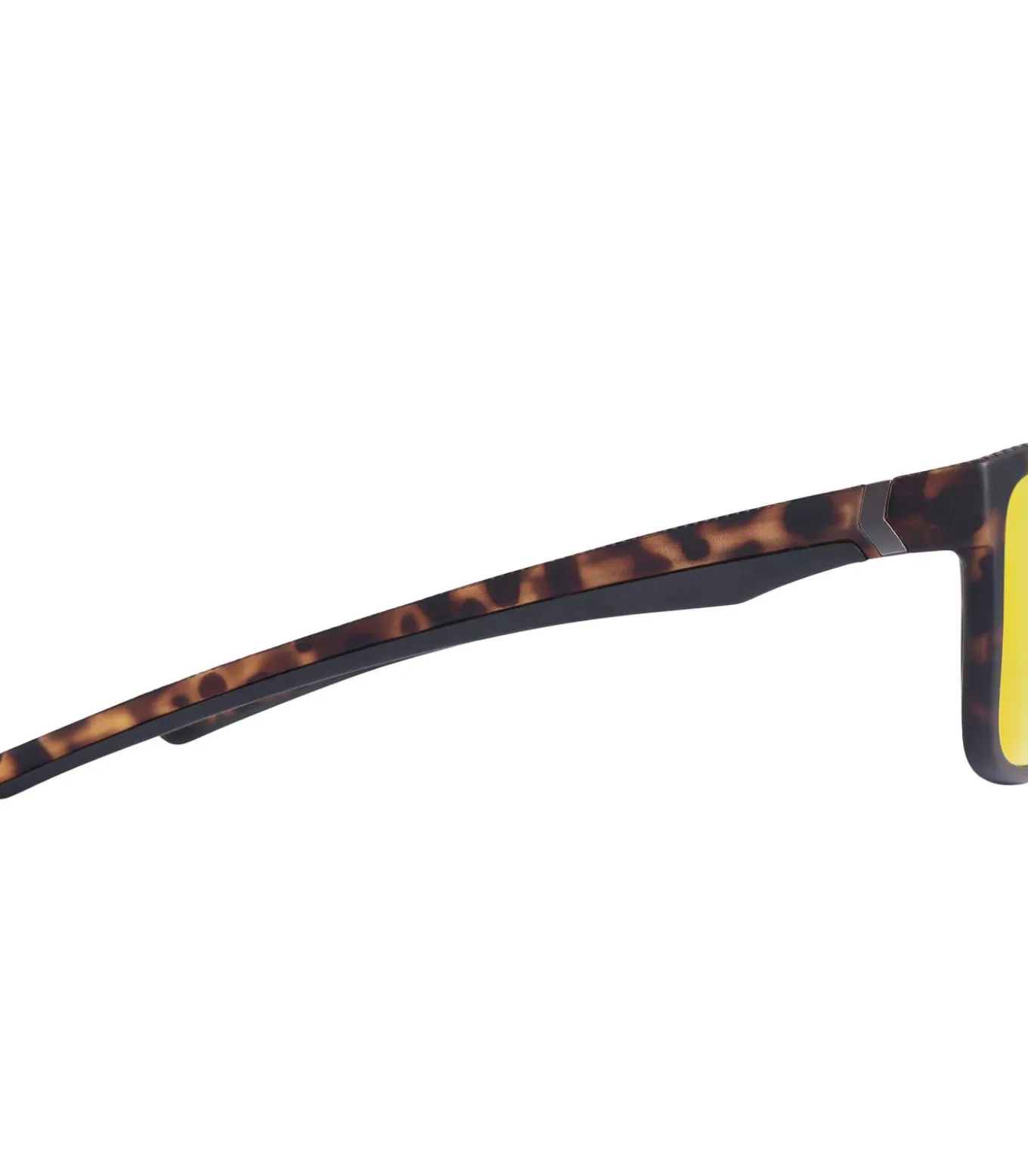 Deze unisex zonnebril voor volwassenen heeft een metalen montuur met schildpadmotief en polycarbonaat met rubberen onderdelen. De spiegelende en gepolariseerde glazen vallen onder categorie 3 en bieden UV–bescherming 400. Het product wordt geleverd met een stoffen zakje en een enkele bril. Het montuur heeft een logo–ontwerp geïnspireerd op schildpadpatronen.