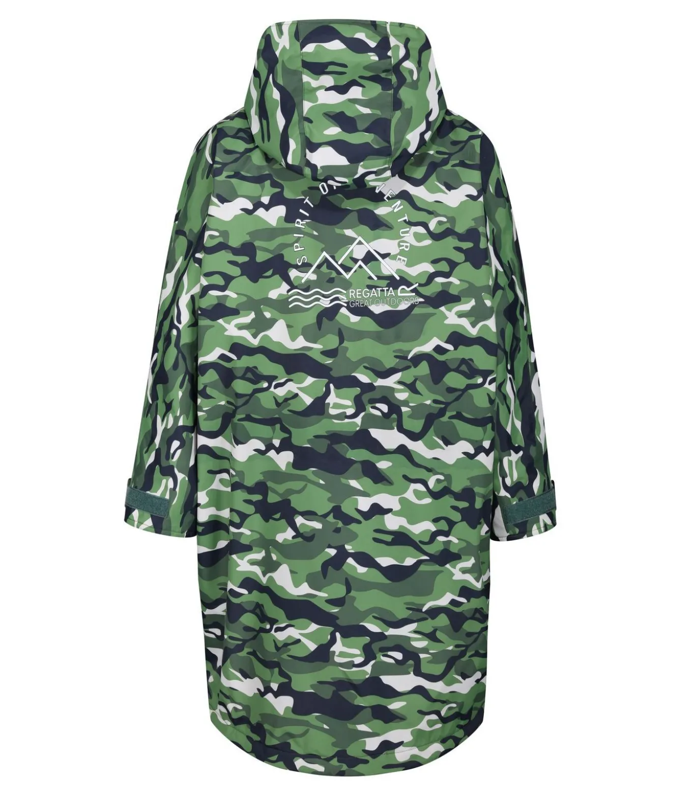 Dit product is een waterdichte kamerjas die speciaal is ontworpen voor kinderen. Hij is gemaakt van 100% polyester en heeft een borg, contrast en fleece voering voor extra warmte en comfort. De Hydrafort 5000–stoftechnologie zorgt voor waterbestendigheid, windbescherming en weerbestendigheid. De badjas heeft een camouflageprint met een rugprint, logo en tekstdetails, waardoor hij er stijlvol en opvallend uitziet. Hij is uitgerust met een meegroeibare capuchon en lange mouwen, voor voldoende bedekking en bescherming tegen de elementen. De manchetten zijn voorzien van drukknopen voor een veilige en verstelbare pasvorm. Voor extra gemak heeft de badjas een binnenzak en een zijzak, waar je kleine benodigdheden in kunt opbergen. Hij sluit met een volledige rits voor gemakkelijk aan– en uittrekken. Dit product is gemaakt van gerecycled materiaal, wat aansluit bij de inspanningen op het gebied van duurzaamheid.