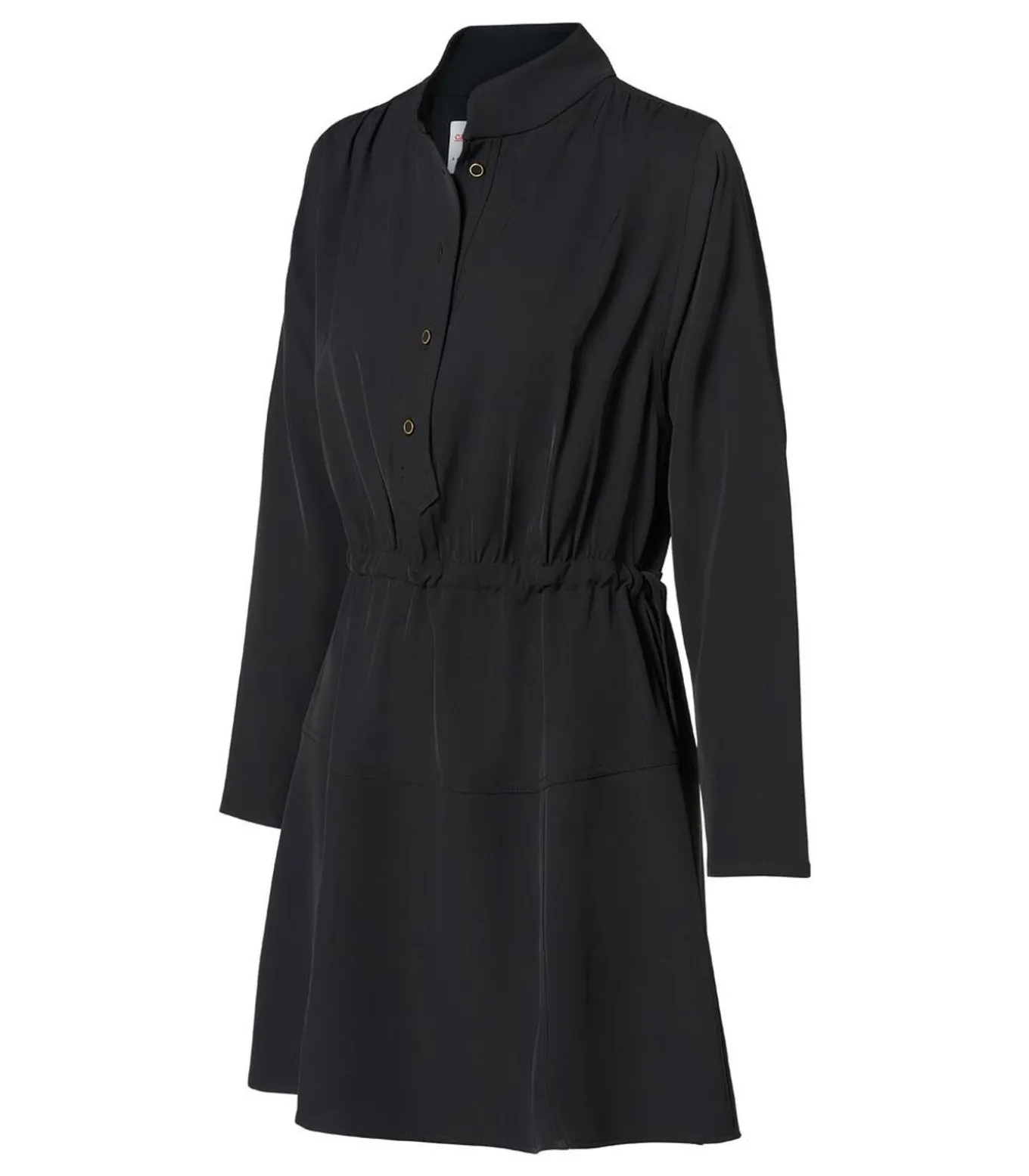 De zwarte Auburn jurk is een elegante klassieker met een eigentijdse twist, ideaal voor zowel formele als feestelijke momenten. De getailleerde snit volgt subtiel de vrouwelijke vormen, terwijl het zwierige rokdeel zorgt voor een soepele, vrouwelijke beweging bij elke stap. De jurk heeft een opstaand boordje met een verfijnde knoopsluiting aan de voorzijde, wat zorgt voor een chique uitstraling met een moderne touch. Dankzij het strikkoord in de taille kun je het silhouet naar wens accentueren, zodat de jurk altijd mooi aansluit. De lengte boven de knie maakt de jurk geschikt voor uiteenlopende gelegenheden, van een zakelijke werkdag tot een etentje of speciale gelegenheid. De comfortabele stofmix van 95% polyester en 5% elastaan voelt prettig aan op de huid en zorgt voor een verzorgde uitstraling, ondanks de non–stretch kwaliteit. De diepe zwarte kleur maakt dit item een veelzijdige toevoeging aan je garderobe, makkelijk te combineren met hakken, laarzen of sneakers, afhankelijk van je mood en de gelegenheid. De Auburn jurk valt normaal qua maat en sluit daardoor moeiteloos aan bij verschillende lichaamsvormen.