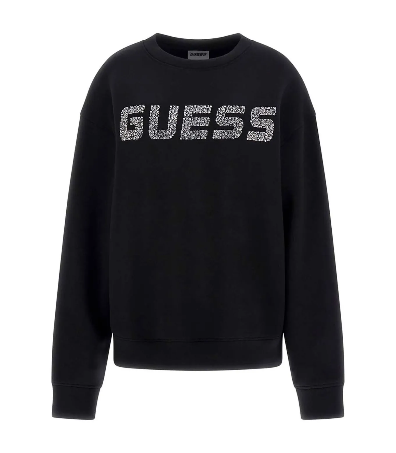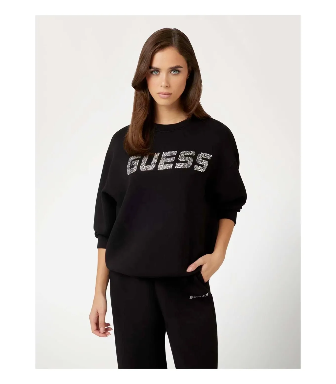 Kleur: Zwart Samenstelling: 77% Viscose/Rayon, 15% Polyamide, 8% Spandex/Elastan Mouwen: Lang Halslijn: Ronde hals Pasvorm: Relaxed Details: Gemaakt van zachte technische scubastof, logo op de voorkant met glinsterende strass–steentjes Duurzaamheid: Gemaakt met LENZING™ ECOVERO™ viscosevezels uit duurzame bronnen, met tot 50% minder uitstoot en waterverbruik Gebruik: Perfect om een vleugje glamour toe te voegen aan je vrije tijd, ideaal om te dragen met een joggingbroek of jeans voor een casual en moderne look.