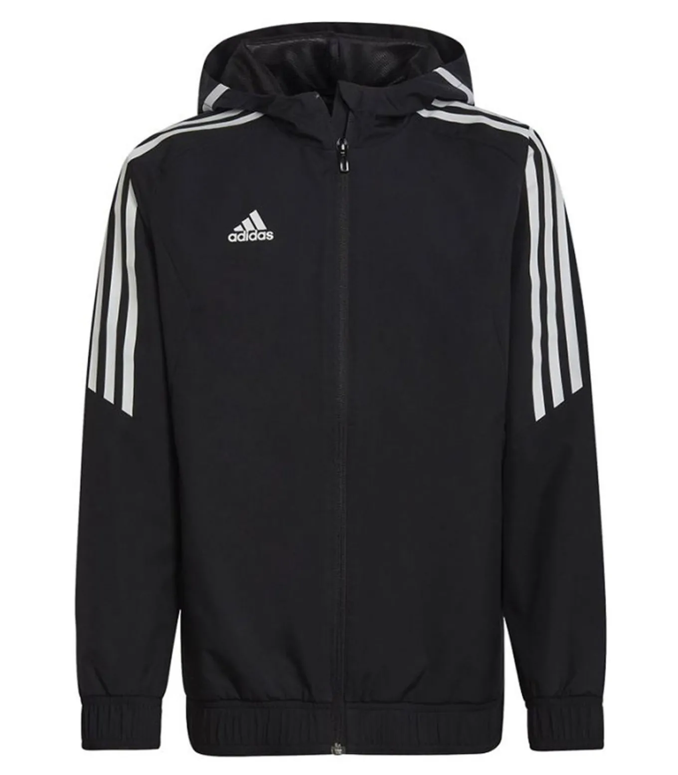 Adidas Condivo 22 zwart jasje is gemaakt van synthetisch materiaal en heeft een ontwerp met het Adidas logo en streepjesdetails. Het heeft een kapiteinshalslijn, is voorzien van lange mouwen en heeft ribbel manchetten. De kaptrekken zijn aan te trekken. De hemslaan bestaat uit ribben en is bevestigd via volledige ritssluiting. Dit jasje wordt aangeraden voor kinderen tussen de 6 en 15 jaar: – 6–7 jaar: 24 in – 8–9 jaar: 25 in – 10–11 jaar: 28 in – 12–13 jaar: 30,5 in – 14–15 jaar: 34 in