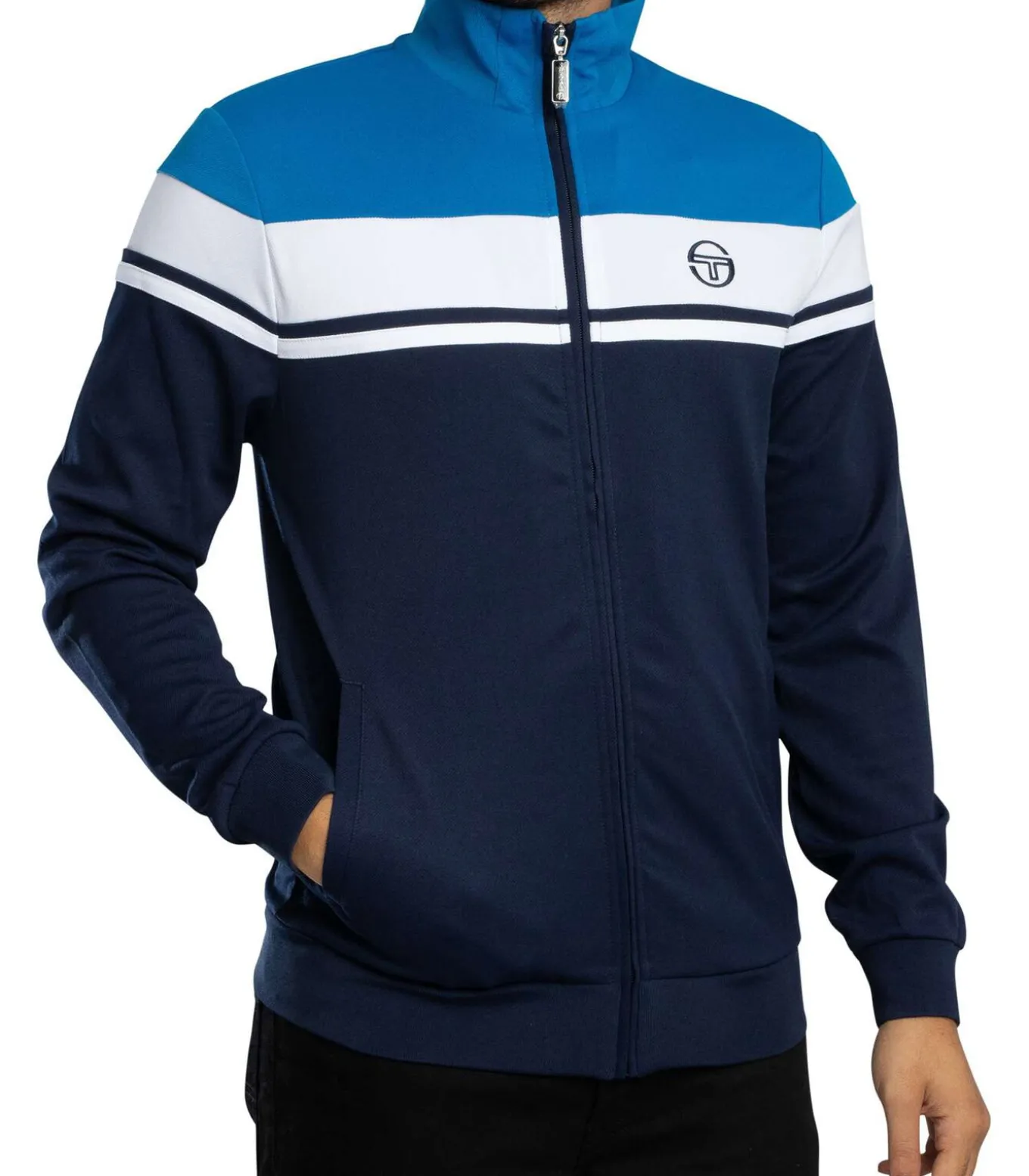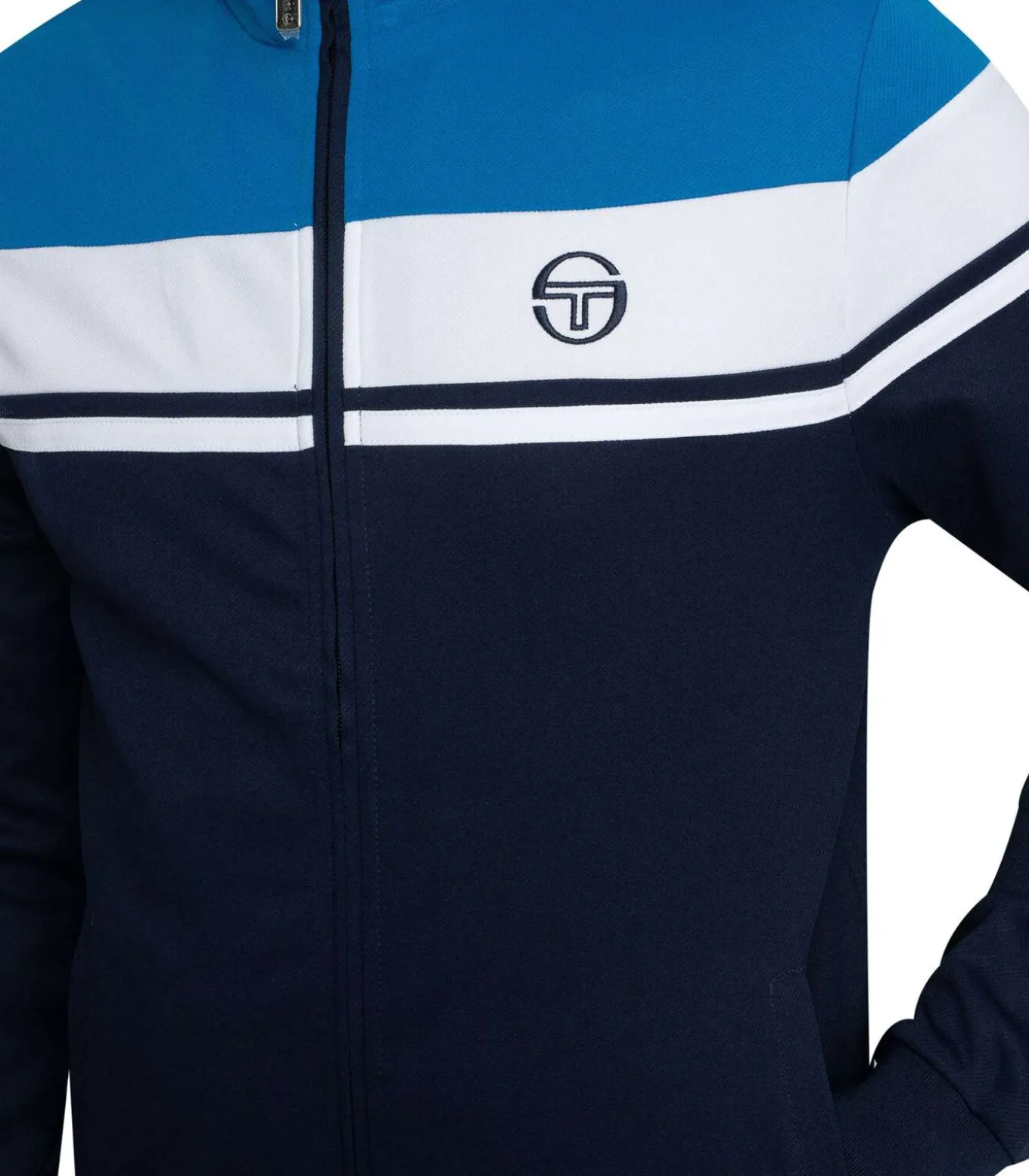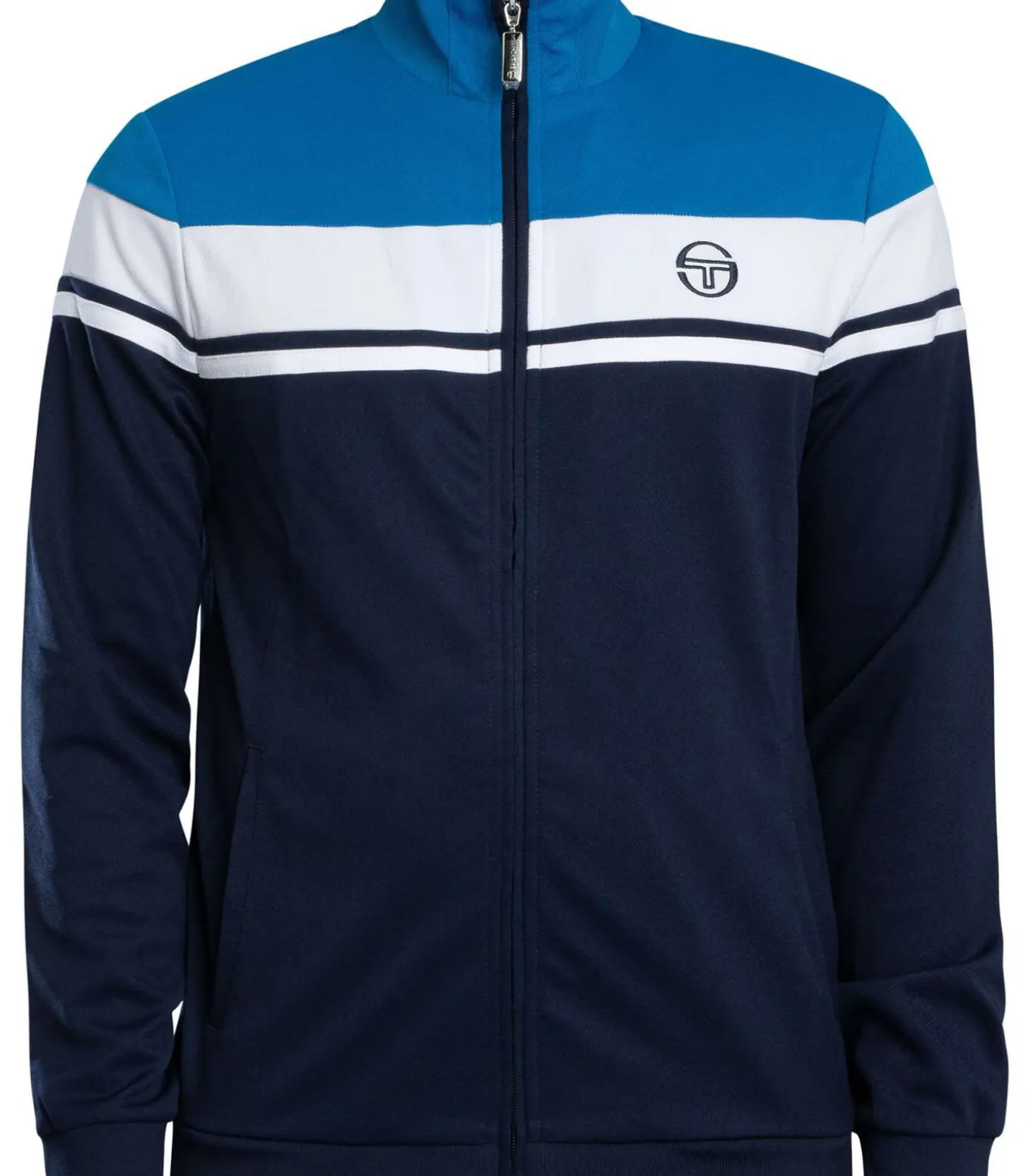 Sergio Tacchini’s Damarindo trainingsjack in Directoire Blue/White/Marition Blue is voorzien van een geborduurd Sergio Tacchini–logo, een ritssluiting met merklogo en open zakken voor extra functionaliteit. Elastische manchetten, zoom en kraag zorgen voor een goede pasvorm en draagbaarheid, terwijl het opvallende colourblock–ontwerp Sergio Tacchini’s mix van retro erfgoed en eigentijdse uitstraling weerspiegelt.