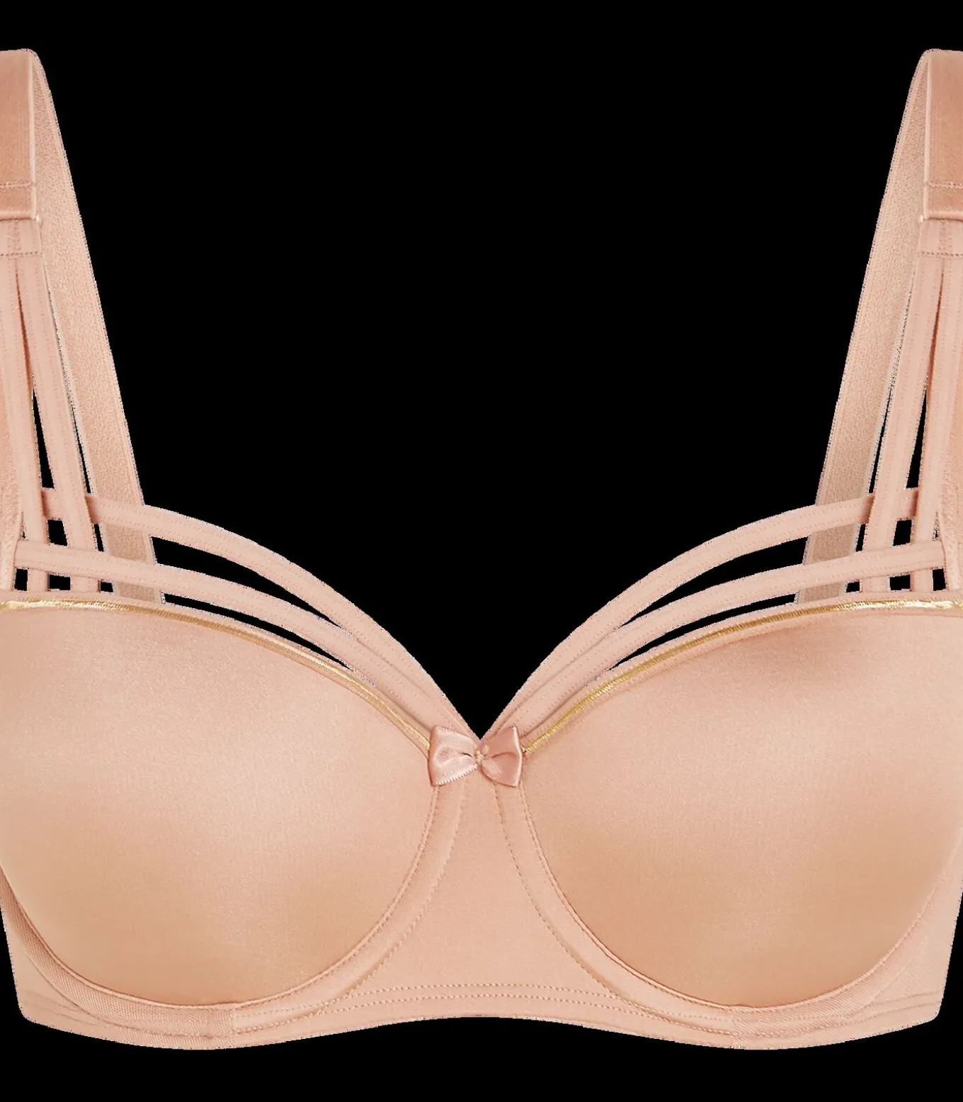 Accentueer je silhouet met de Dame de Paris glossy camel balconette bh. De klassieke balconette vorm ondersteunt en omlijst je borsten en creëert een natuurlijke, ronde decolleté. Gemaakt van gerecycled, glanzend microvezel en afgewerkt met een subtiel goudkleurig lurex accent en een satijnen strik in het midden.