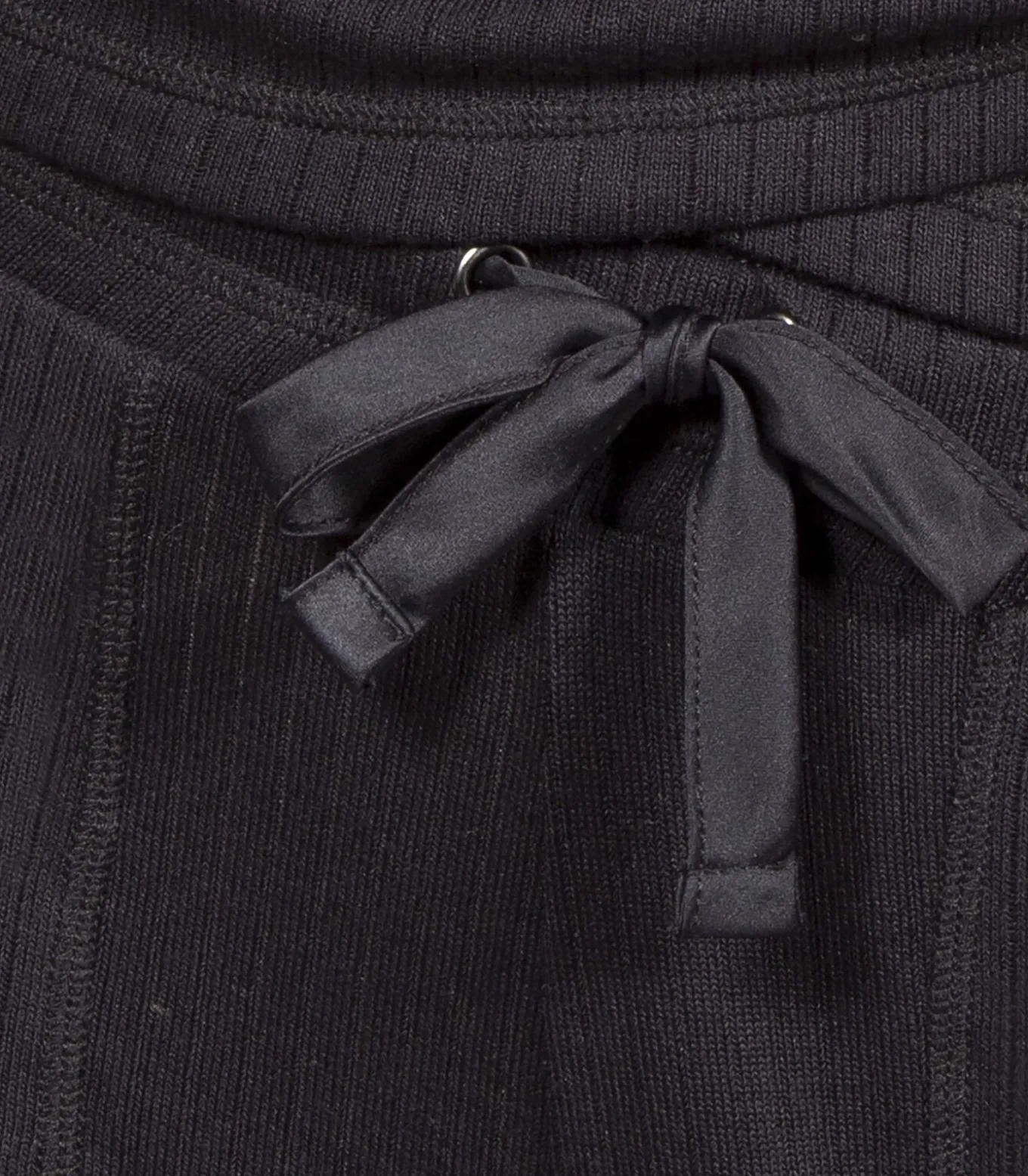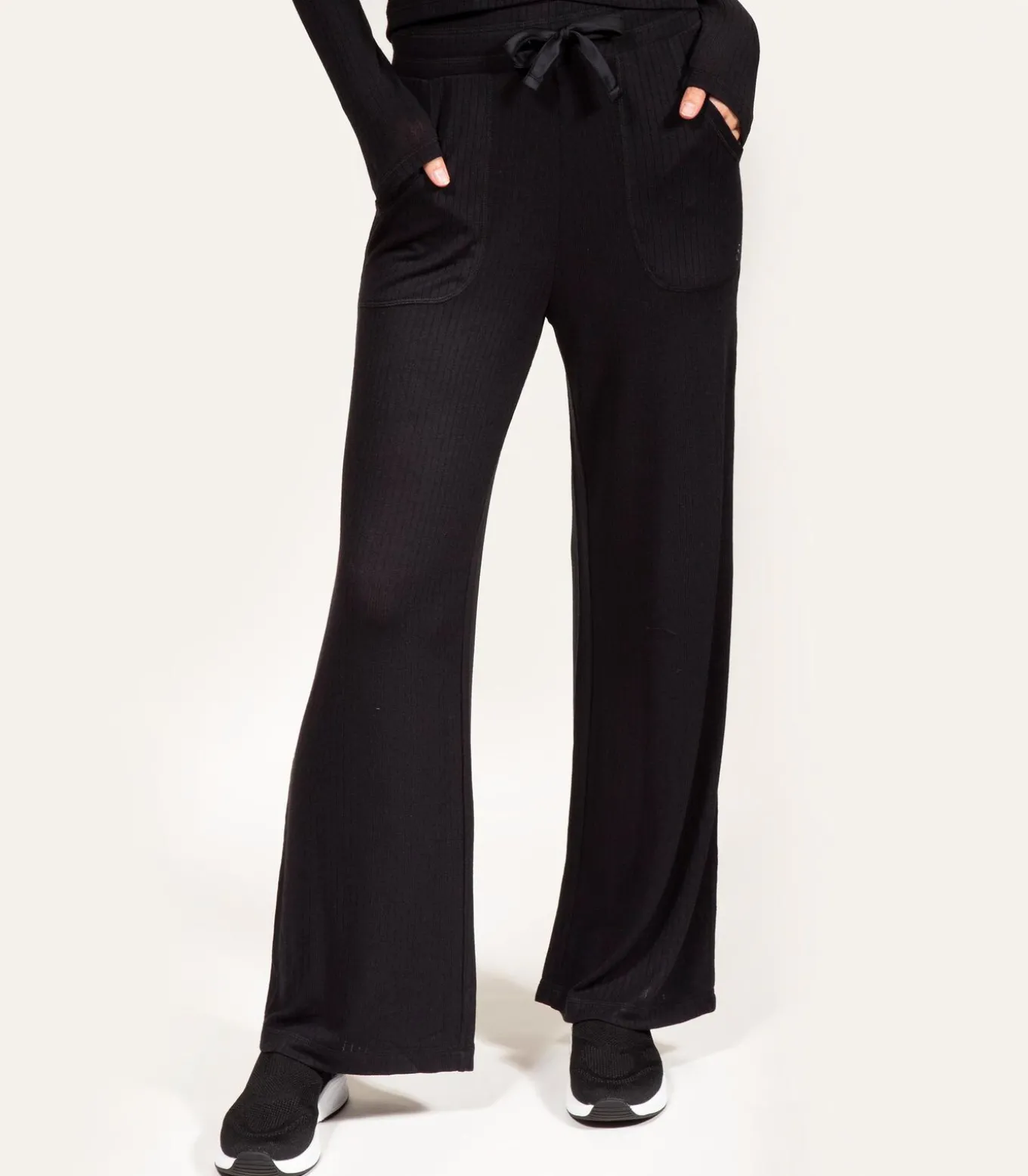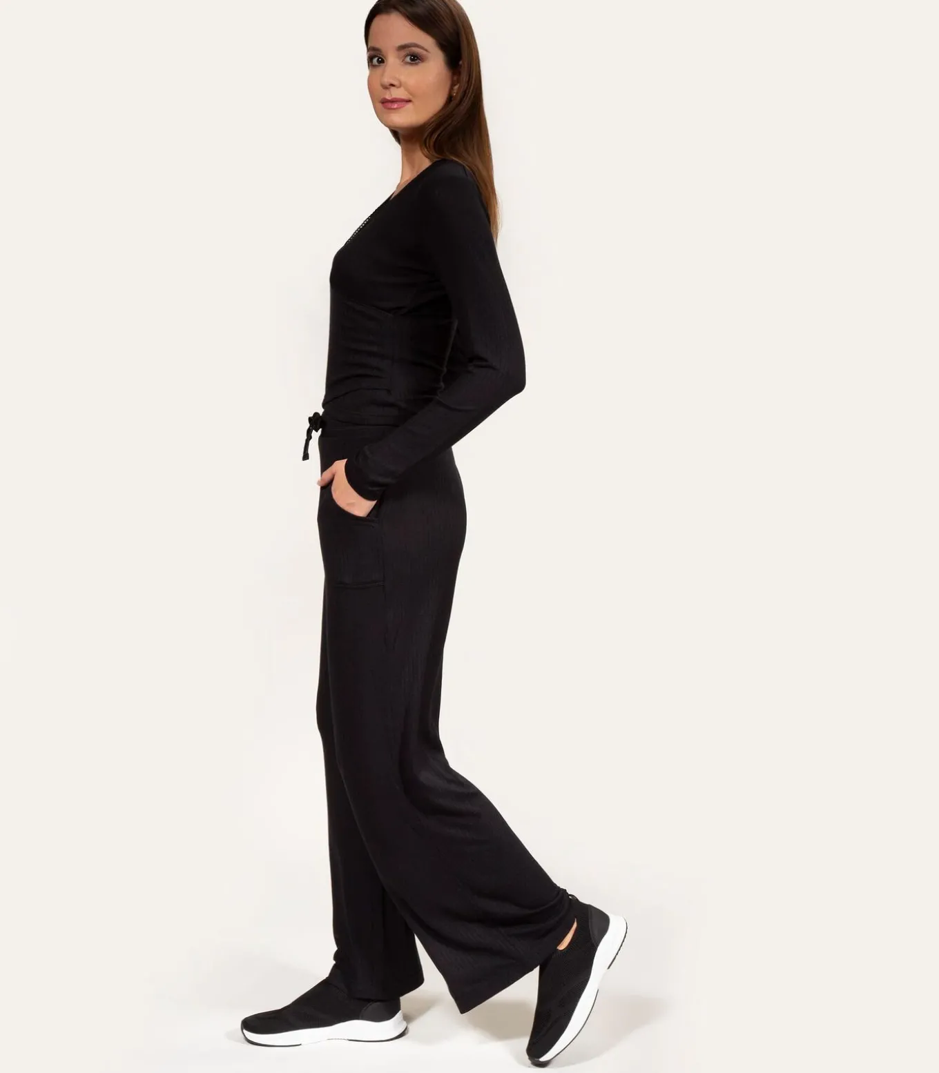 De nieuwe ultrazachte homewear–lijn van Isotoner is grotendeels gemaakt van ECOVERO™ viscose. Deze zwarte geribde broek met wijde pijpen combineert veel comfort en elegantie dankzij de zakken, elastische hoge taille en verstelbare satijnen koord in de taille.Het model is 177 cm lang en draagt maat 34/36.
