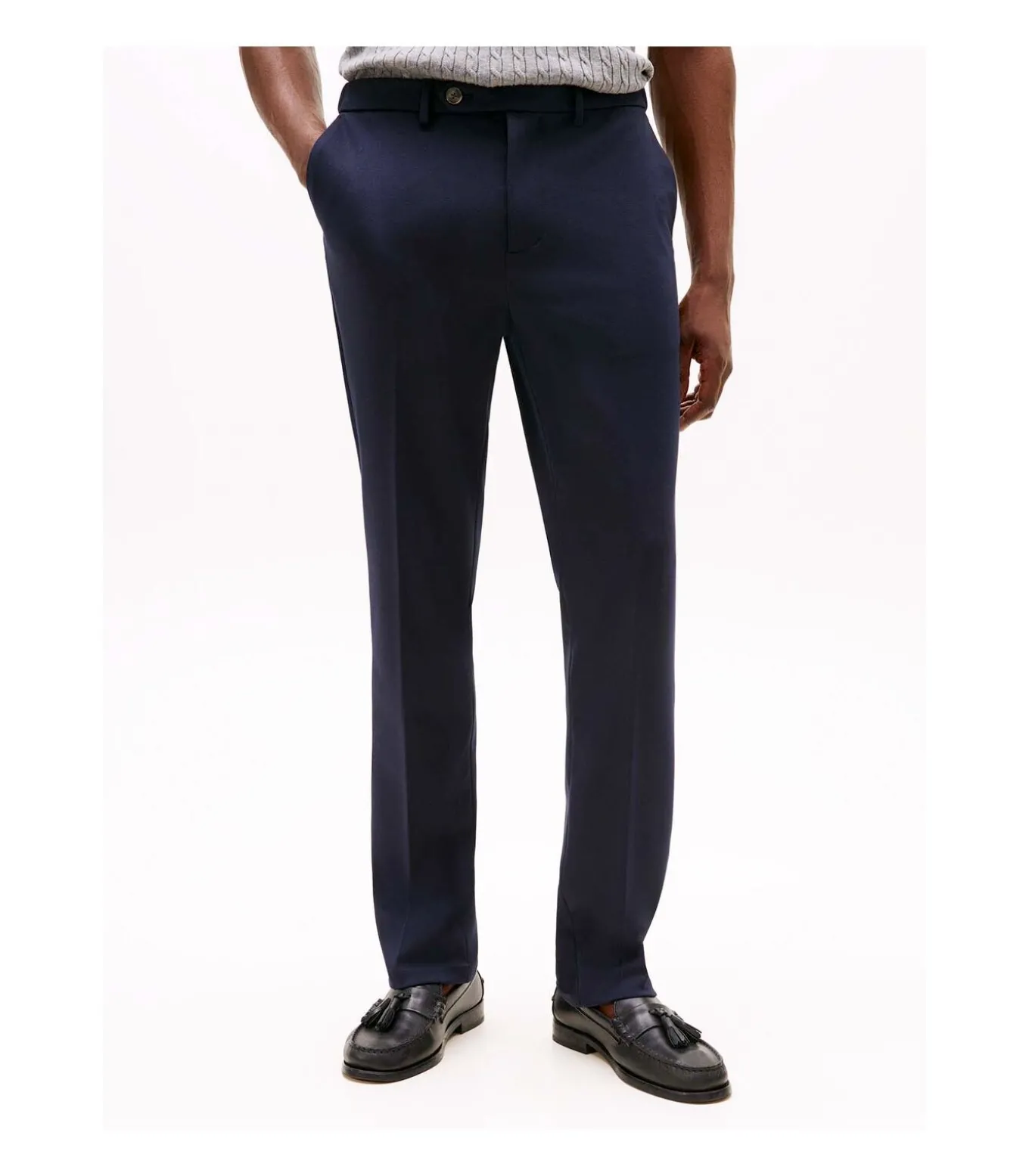 Kleur: marineblauw. Samenstelling: 75% polyester, 22% viscose, 3% elastaan. Pasvorm: recht model. Sluiting: rits en knoop. Details: twee open steekzakken, twee paspelzakken met knoop aan de achterkant, stretchstof van viscosemix, Tommy Hilfiger–merk. Duurzaamheid: gemaakt van gecertificeerd gerecycled polyester. Gebruik: ideaal voor praktische en elegante kleding, perfect voor op kantoor of voor smart casual gelegenheden.