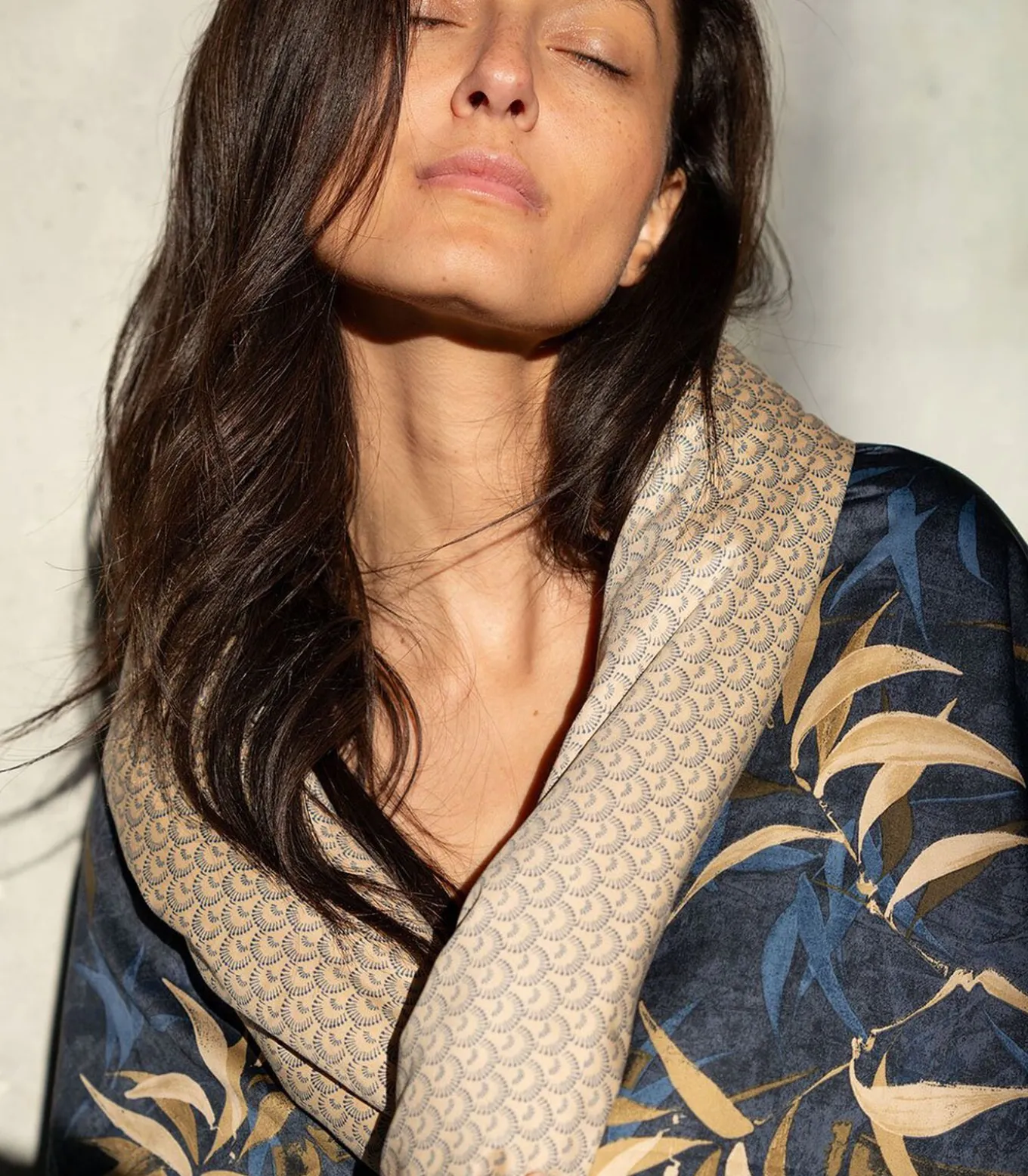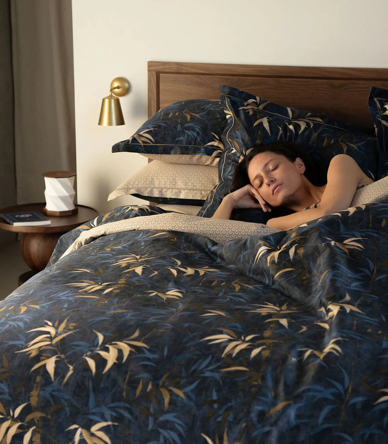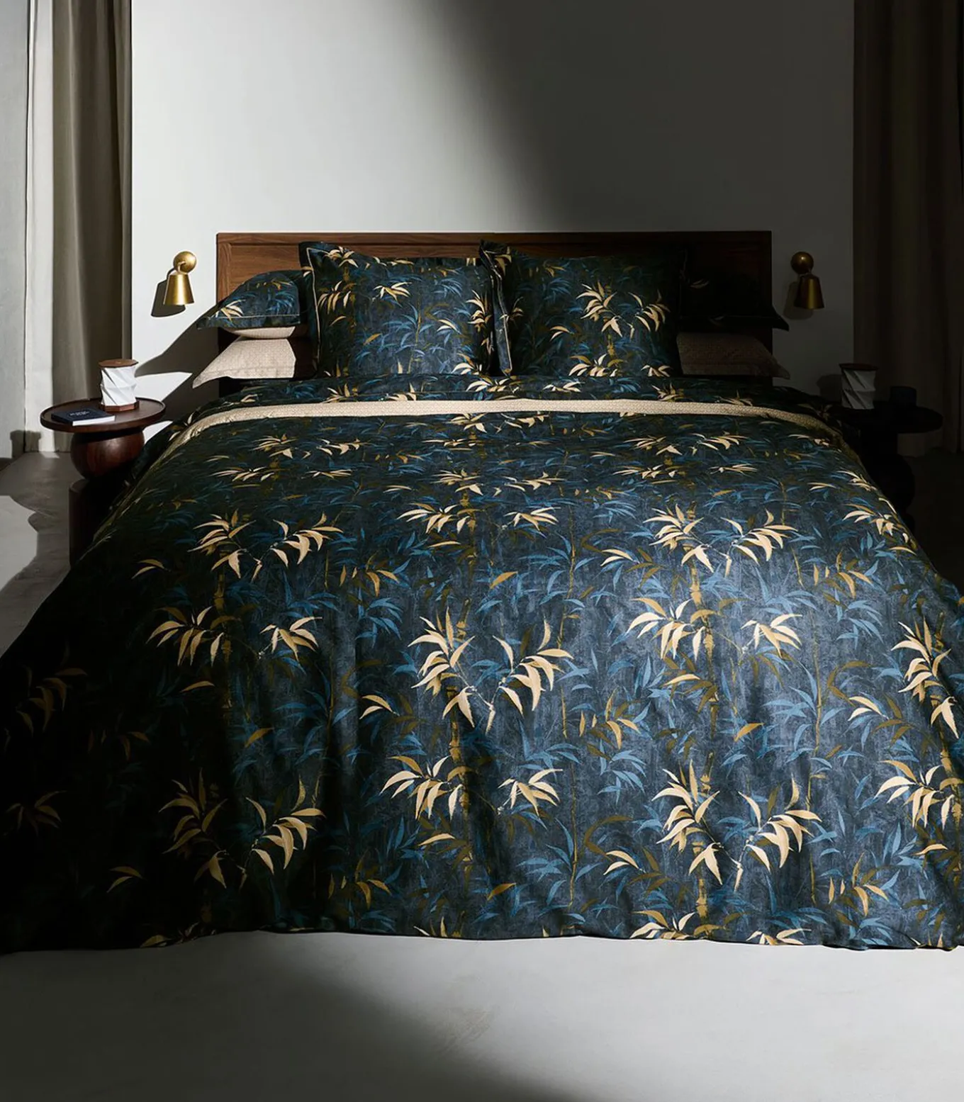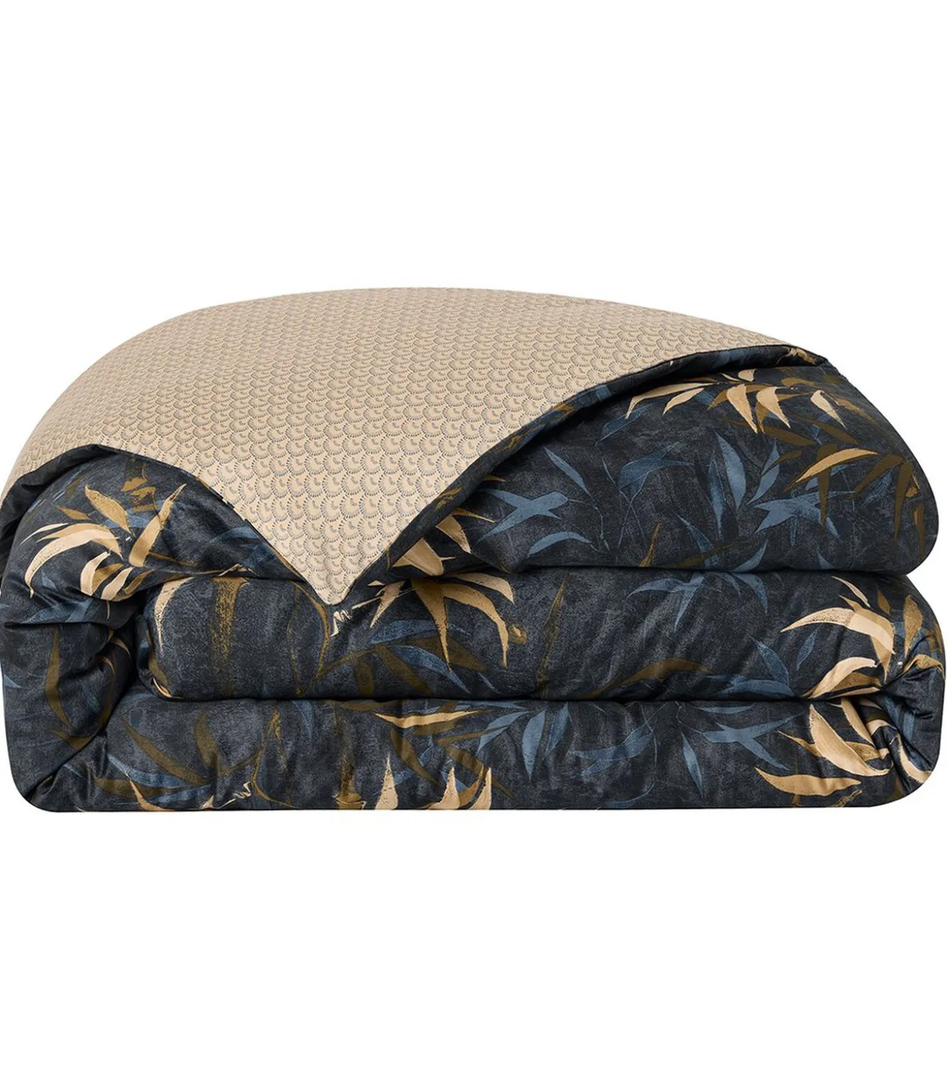 Bamboeprint in blauw en goudbeige op een nachtblauwe achtergrondNachtblauwe palmettenprint op goudbeige achtergrond