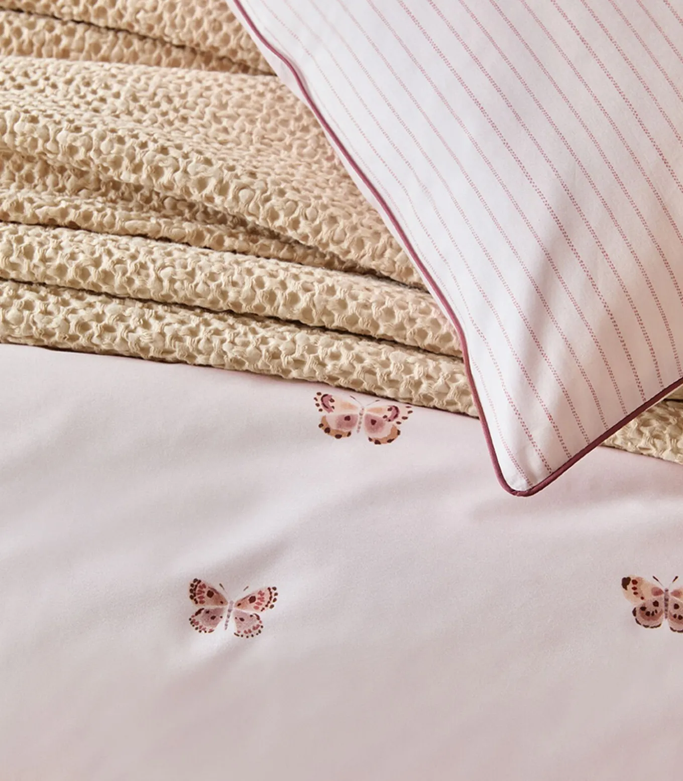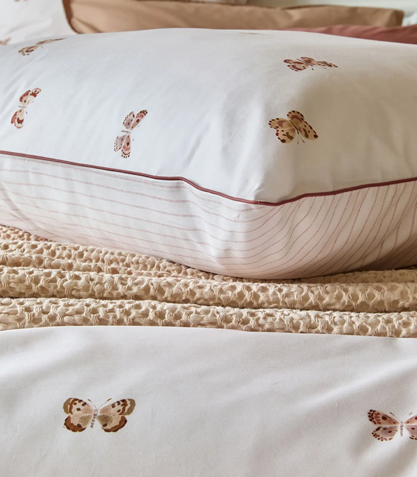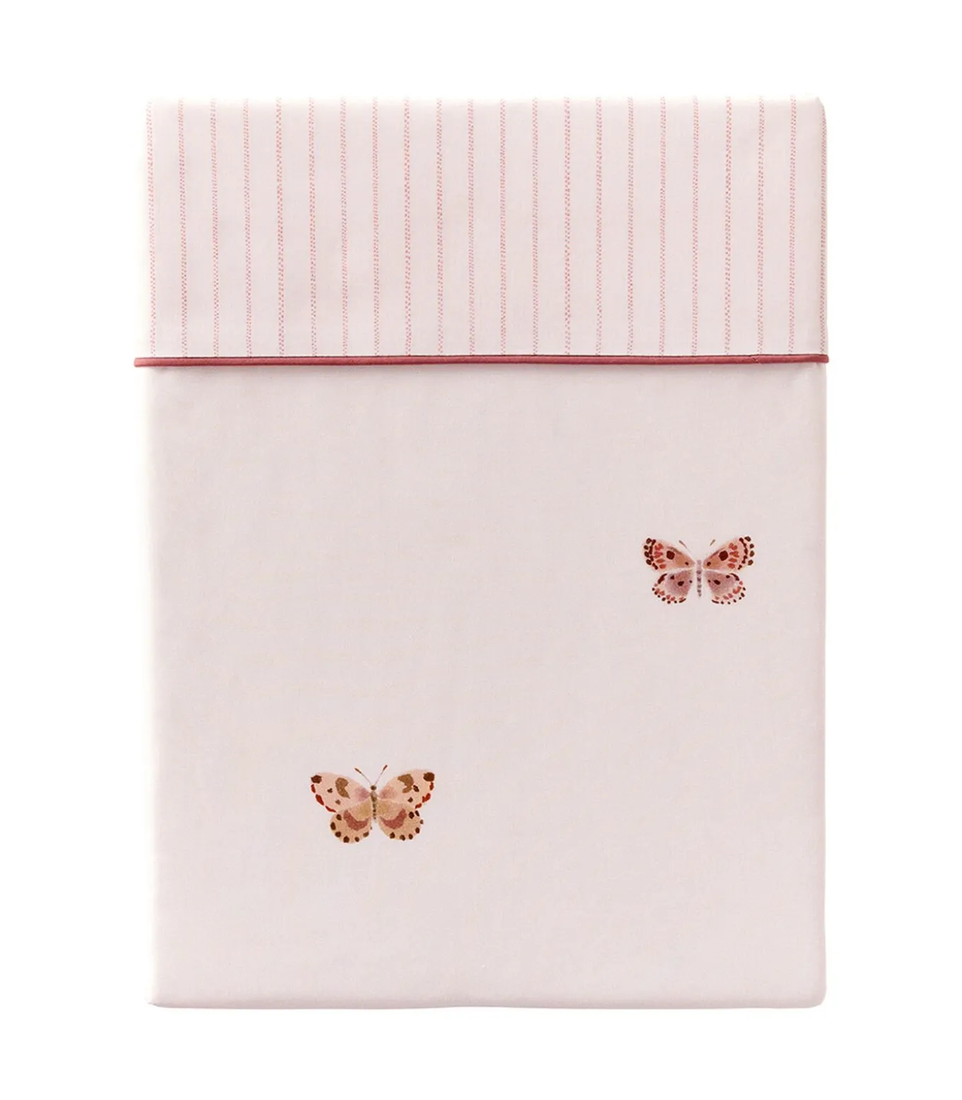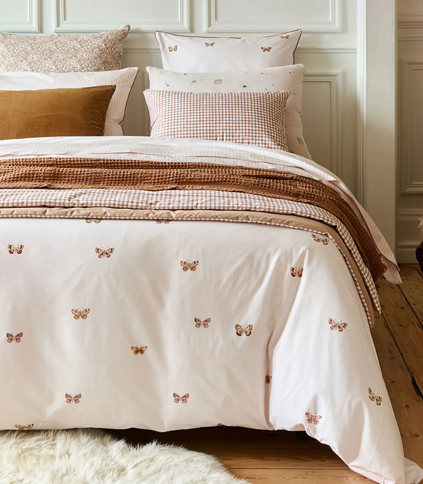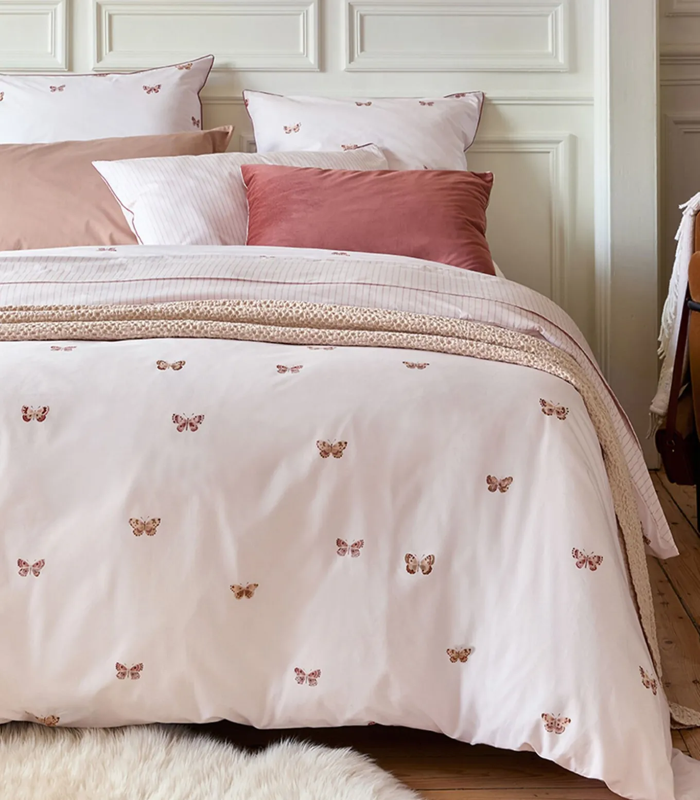 Geef uw dagelijks leven een vleugje poëzie met ons Délicatesse–model. Dit laken heeft een betoverend ontwerp met een groot aantal vlinders die rond lijken te fladderen in een fraai, verfijnd ballet. Dit met gouache geschilderde ontwerp in roze tinten wordt versterkt door een achterkant met bruinroze strepen, wat een subtiel vleugje verfijning toevoegt. Laat u verleiden door de natuurlijke schoonheid en elegantie van ons Délicatesse bedlinnen, ontworpen om uw slaapkamer te veranderen in een poëtische oase van rust.