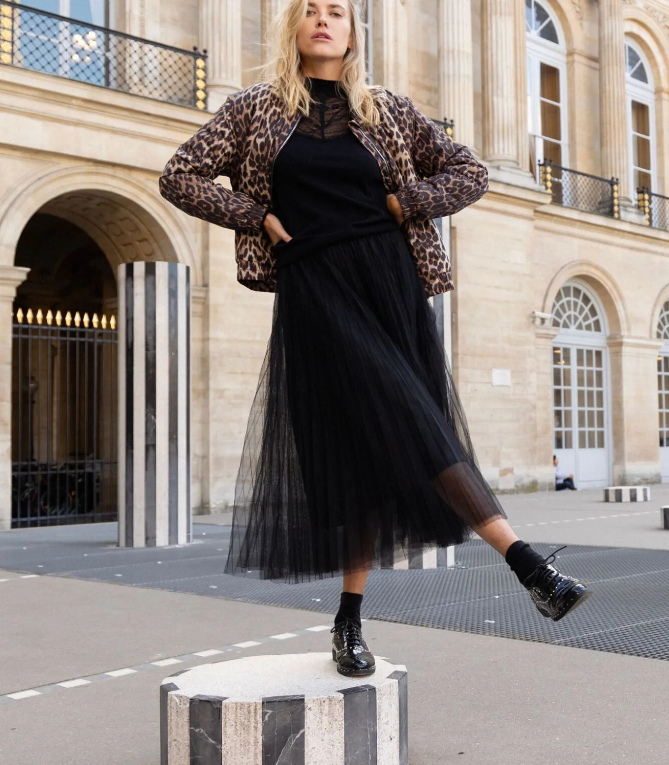 DJUDY damesrok met middellange lengte. Deze zwierige, uitlopende rok verleidt met zijn chique en vrouwelijke stijl. Gemaakt van lichte en luchtige tule, heeft hij fijne, regelmatige plooien over de gehele lengte, voor een elegante beweging bij elke stap. De taille wordt geaccentueerd door een brede elastische tailleband voor een comfortabele pasvorm zonder zichtbare sluiting. Ideaal voor een elegante of bohemian outfit, dit tijdloze item is geschikt voor vele gelegenheden.