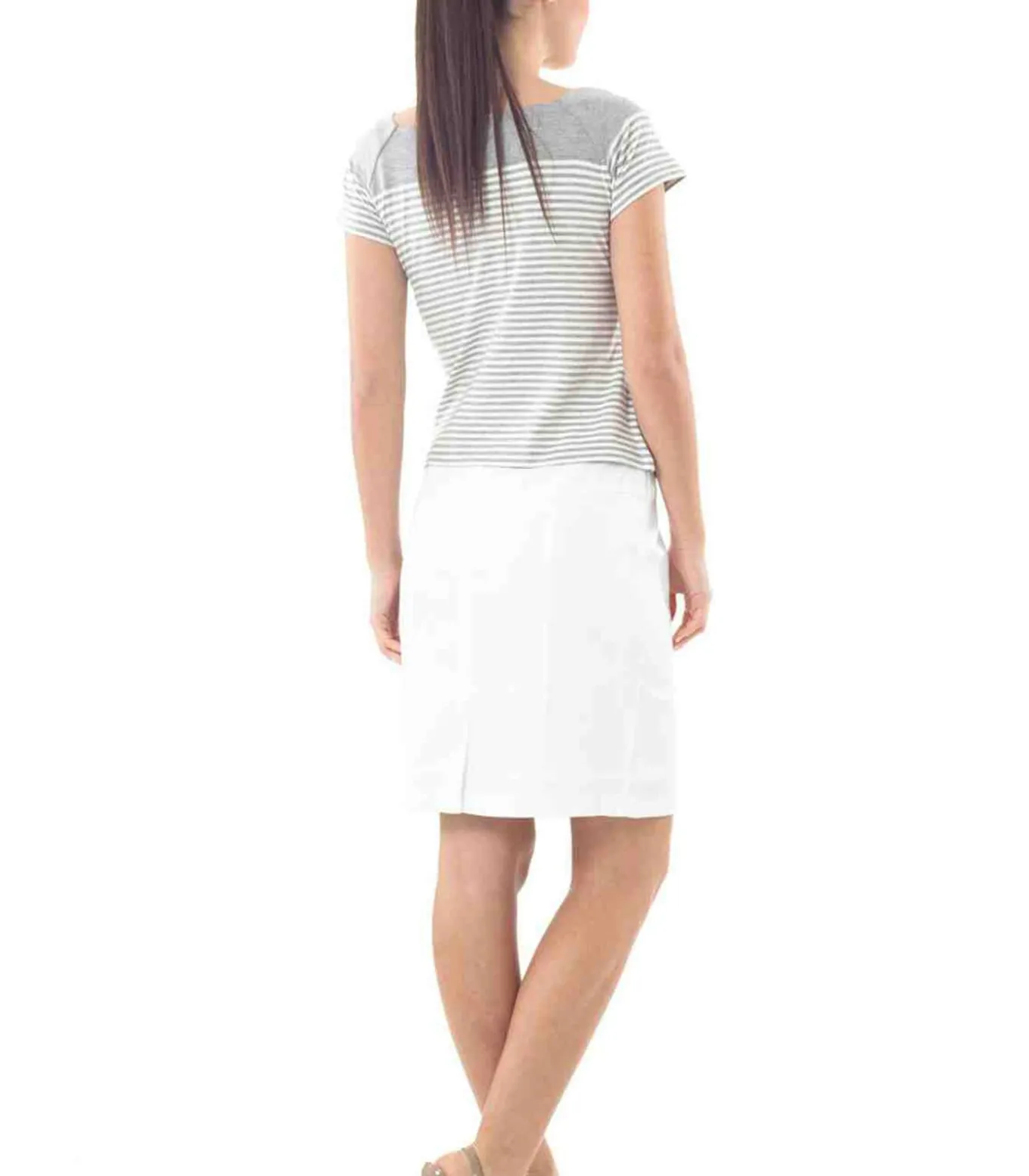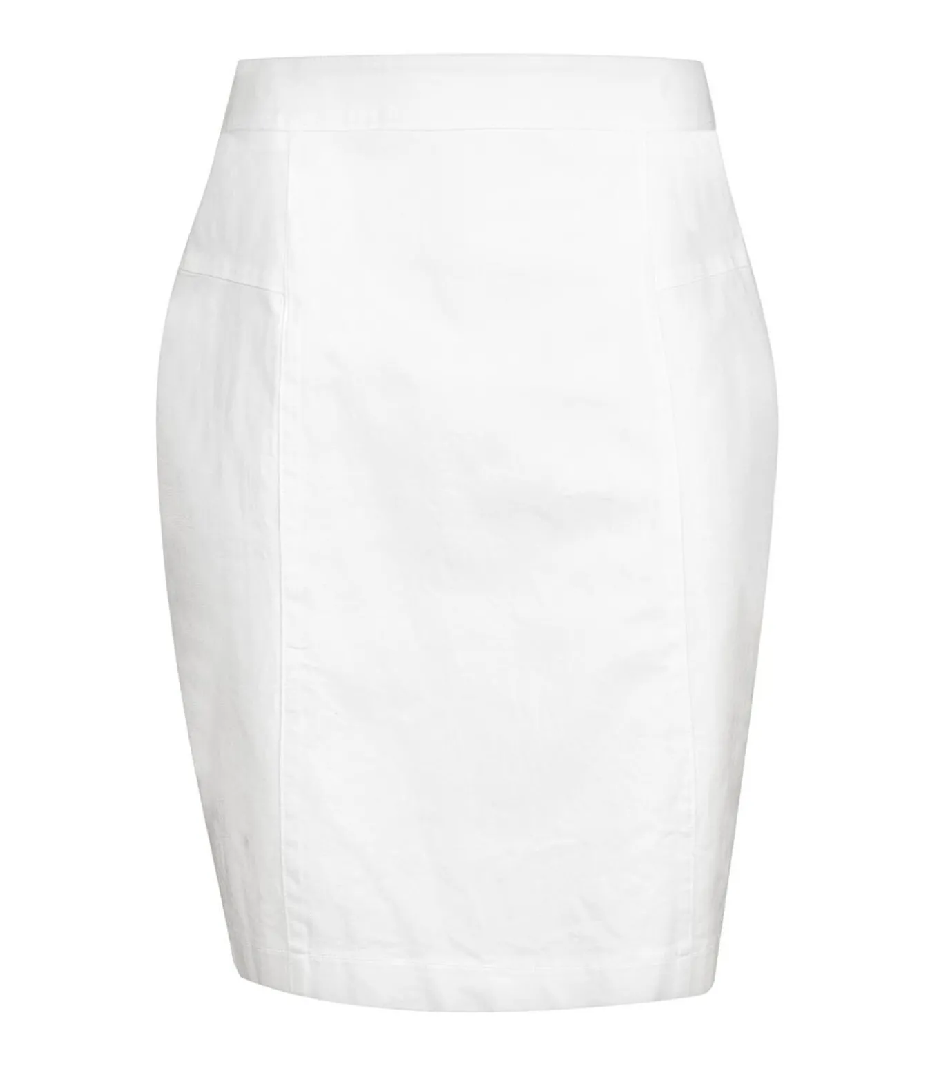 Deze chique witte rok, gemaakt van duurzame katoen–elastaan cabardine stof, biedt een verfijnde uitstraling met een gestructureerde pasvorm. Met decoratieve naden aan de voorkant, een verborgen ritssluiting aan de achterkant en een kleine split achter voor bewegingsvrijheid, valt deze rok comfortabel boven de knie. Perfect te combineren met blouses of casual tops, deze veelzijdige rok combineert moeiteloos elegantie en functionaliteit, ideaal voor zowel kantoor als casual uitstapjes.