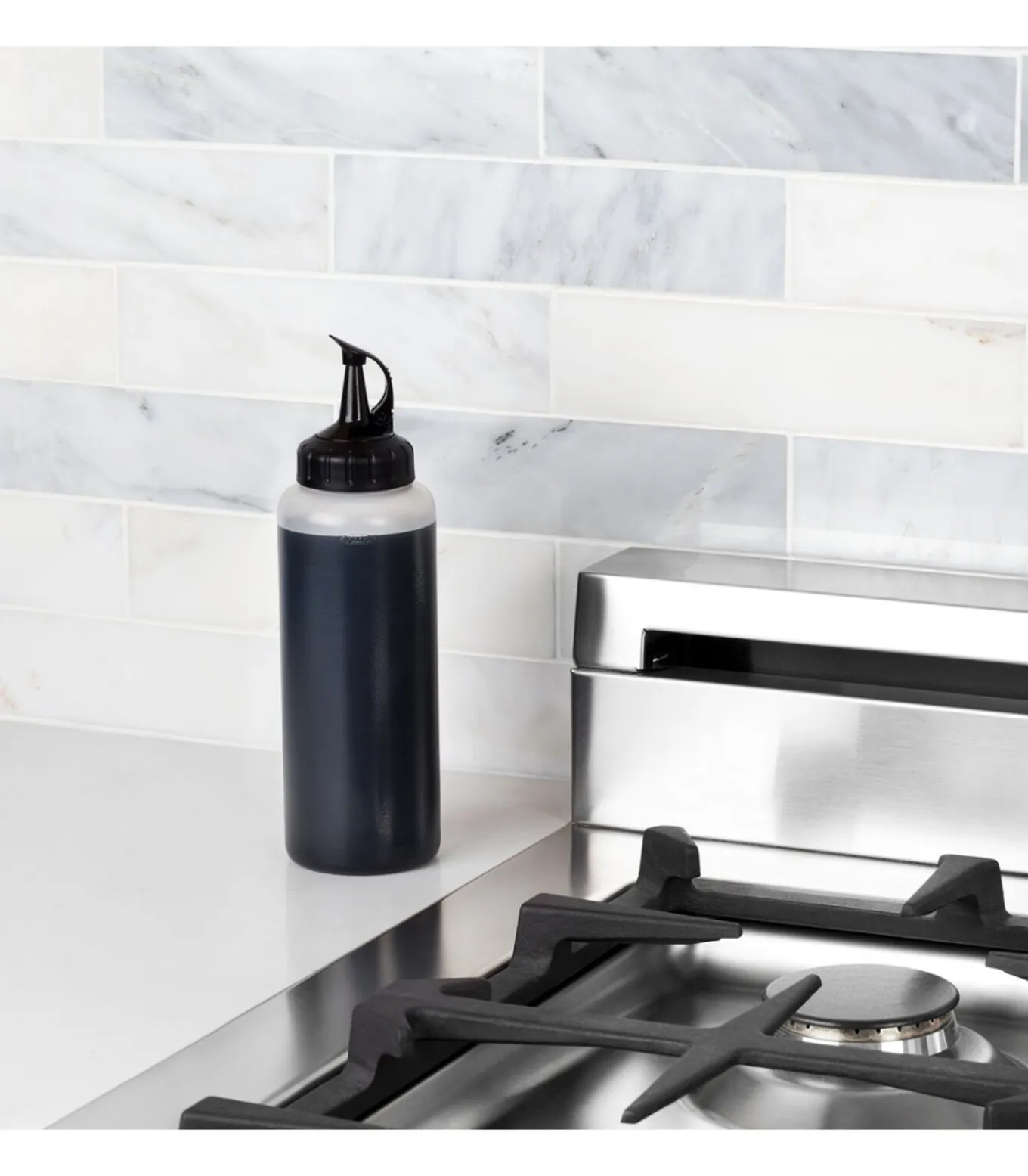 Maakt u veel gebruik van olie, azijn of dressing in uw gerechten? Deze spuitfles van OXO is geschikt voor alle soorten vloeistoffen. U kunt gemakkelijk doseren door in de fles te knijpen. De spuitmond is voorzien van een handig klepje, zodat je de spuitfles gemakkelijk afsluit. Als je hem sluit, klikt hij dicht. En als je hem opent, klikt het klepje vast in de geopende stand. Dit voorkomt dat het klepje tijdens het werk voor de spuitmond komt. De royale openingen zorgt ervoor dat de fles zonder knoeien kan worden gevuld. De fles heeft een inhoud van 35 cl; niet te groot en niet te klein! Deze spuitfles heeft een inhoud van 350 milliliter en is voorzien van handige maatstreepjes in milliliters, cups en ounces. De fles is van BPA–vrij kunststof gemaakt en vaatwasmachinebestendig.