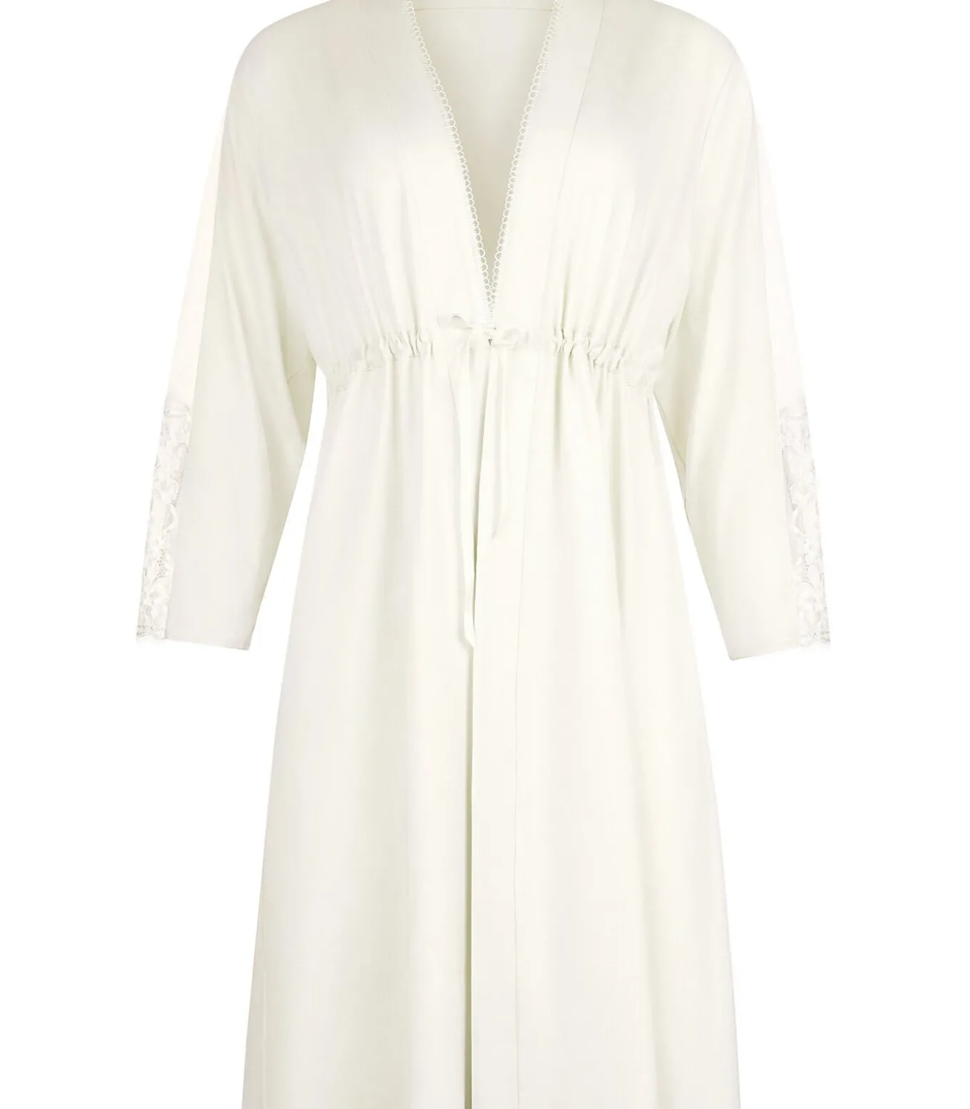 Comfortabele kamerjurk met sluiting net boven de taille. Het satijnen lint aan de sluiting geeft het stuk extra verfijning. Wijde 3/4–mouwen met driehoekige inzetstukken van tule en kant. Halslijn afgewerkt met fijn decoratief elastiek. Lengte ca. 95 cm.