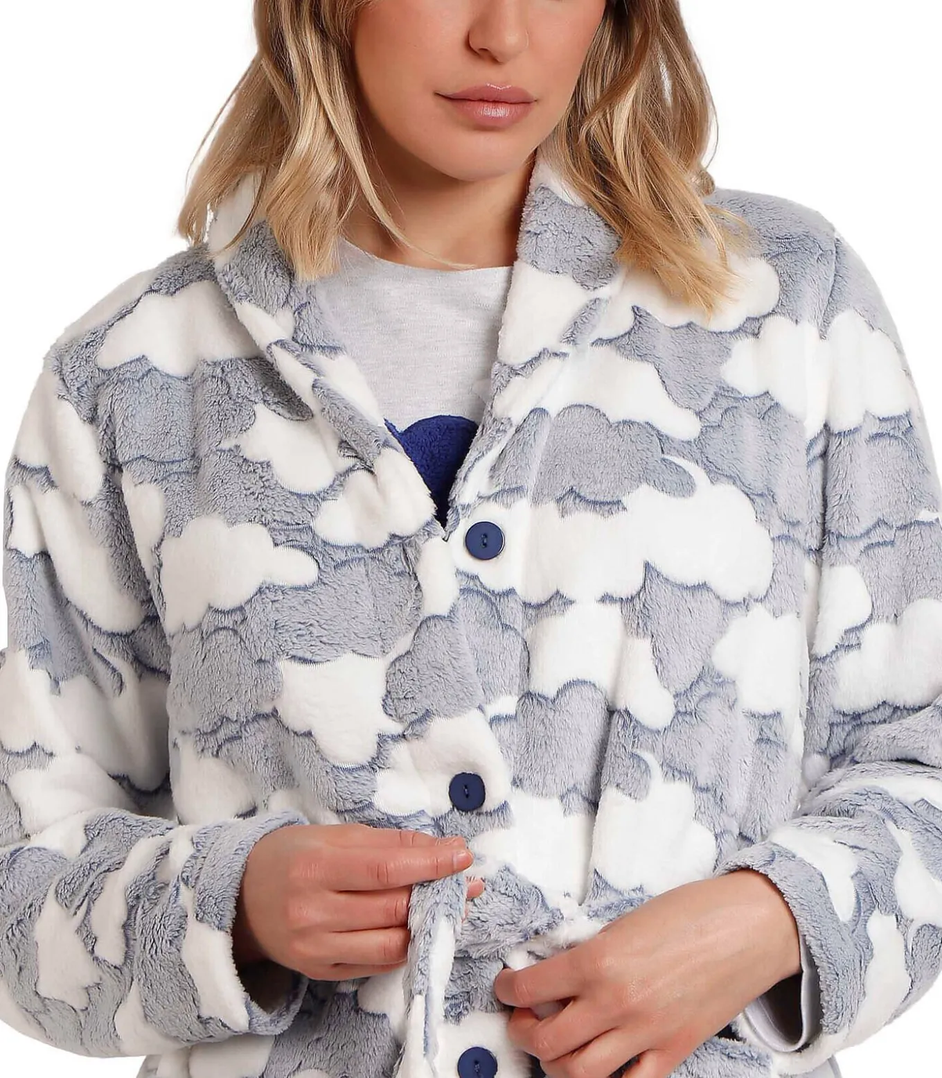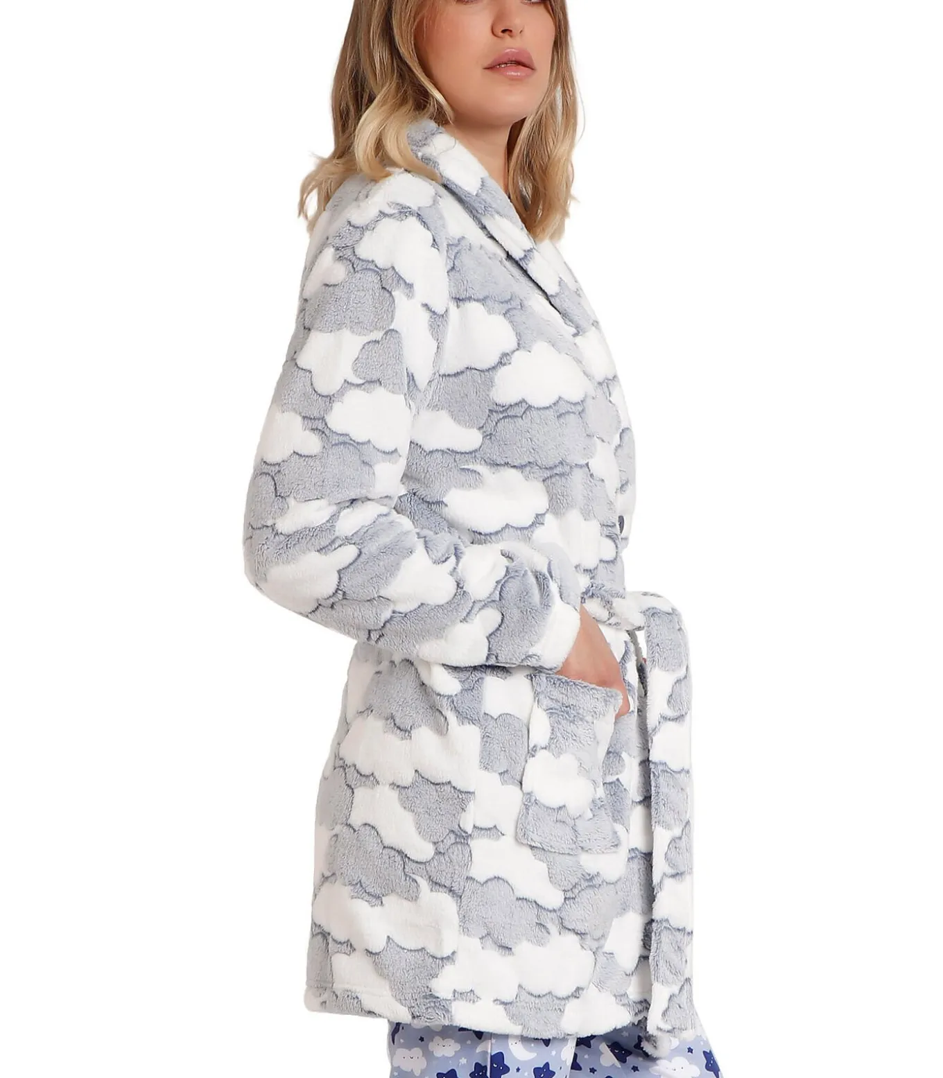 Zeer warme badjas van Corel fleece, met all–over wolkenpatroon. Hij heeft lange mouwen en praktische steekzakken. Hij kan dicht worden gedragen dankzij een ceintuur die in de taille kan worden geknoopt en een knoopsluiting aan de voorkant. Ultrazacht en comfortabel, perfect voor winteravonden of ontspannen dagen thuis.[Jurk wordt apart verkocht. De pyjama die het model op de foto’s draagt, is niet inbegrepen].