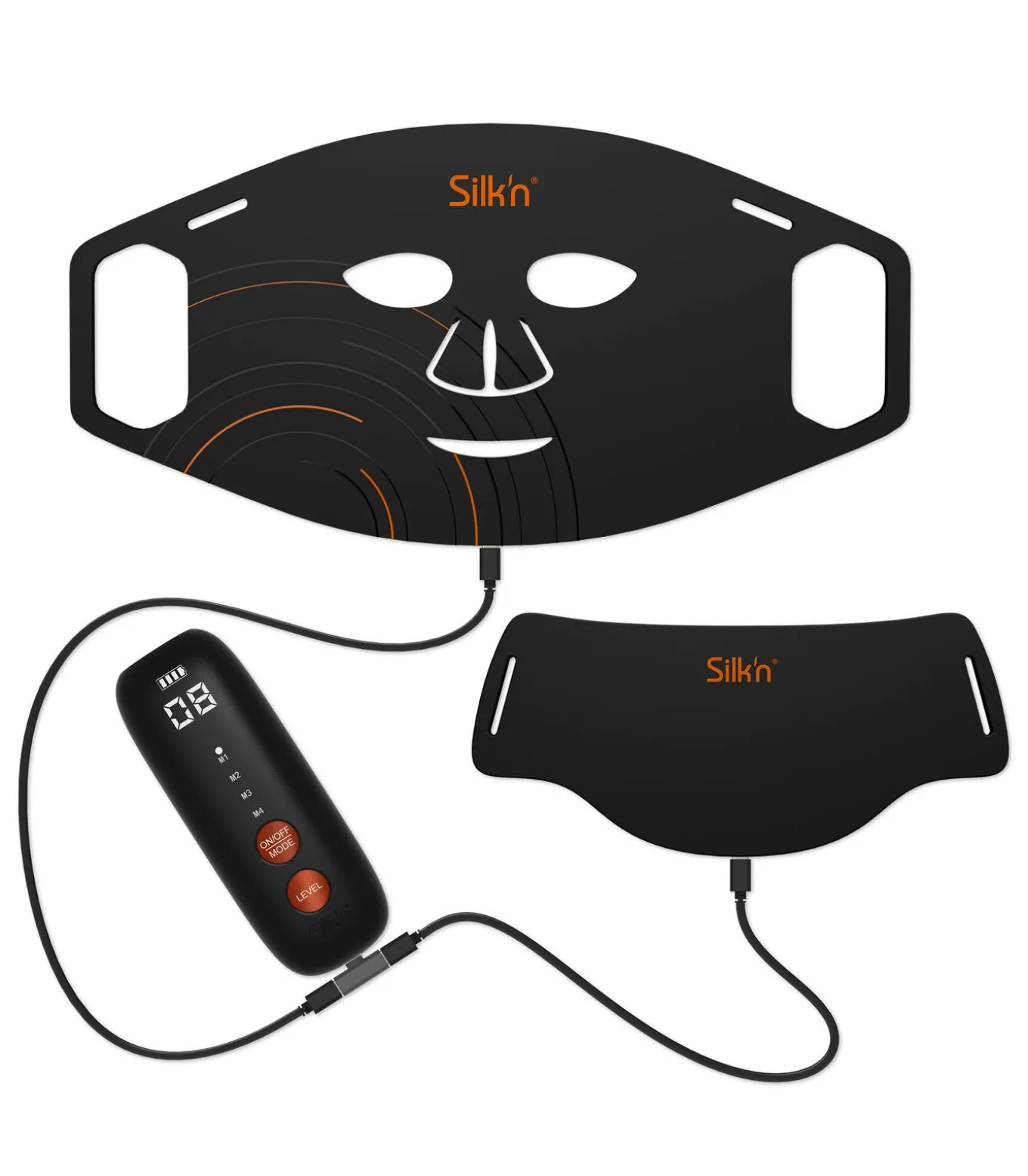 De Silk’n Dual LED Face & Neck Mask Set met Builder Serum is een complete oplossing voor huidverjonging van zowel gezicht als hals. Het masker maakt gebruik van geavanceerde LED–lichttherapie en behandelt beide zones tegelijkertijd. Met vier verschillende lichtmodi – rood, donkerrood, blauw en nabij–infrarood – richt het zich op huidveroudering, pigmentatie en acne. Het meegeleverde Silk’n Builder Serum is speciaal ontwikkeld om huidvernieuwing te stimuleren, collageenaanmaak te activeren en het effect van LED–lichttherapie te versterken. De vier LED–modi zijn afgestemd op specifieke huidbehoeften: modus 1 (rood + NIR) vermindert rimpels en verbetert de bloedcirculatie, modus 2 (donkerrood + NIR) verheldert en verzacht de huid, modus 3 (rood + donkerrood) kalmeert en reguleert talgproductie, en modus 4 (blauw) vermindert acnevlekken en roodheid. Het masker is gemaakt van flexibel siliconenmateriaal dat zich aanpast aan de gezichtsvorm en is geschikt voor alle huidtypen en –kleuren. Slechts 10 minuten per dag volstaan voor zichtbare resultaten. Het Builder Serum bevat krachtige actieve ingrediënten zoals vitamine C, hyaluronzuur en Chlorella. Het versterkt de werking van LED–behandelingen, maar kan ook los van het masker dagelijks worden gebruikt. De bundel bevat: het Dual LED Face & Neck Mask, een draadloze afstandsbediening met blauwe LED–modus, een USB–oplaadkabel, een opbergtas en een flacon Builder Serum van 50 ml. Ideaal voor iedereen die gezicht en hals tegelijk wil behandelen en thuis professionele huidresultaten wil behalen.
