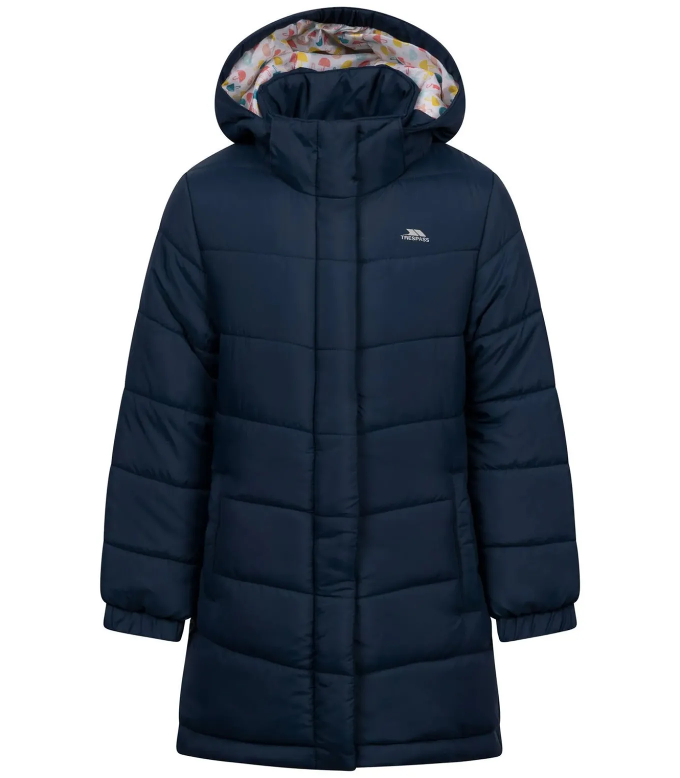 Trespass–merk jasje marineblauw genaamd Ellster, gemaakt van volledig polyester. De kleuring is contrast, het ontwerp is logo, vlak en gewatteerd. Het gewicht is licht door gebruik van stoftechnologie. De manchetten zijn elastiek en de halslijn is kapitein. Dit jasje heeft een longmouw en is voorzien van een afneembaar kappen. Het heeft twee zijzakken met volledige ritssluiting. De passende maten zijn: 2–3 jaar met 21 inch, 3–4 jaar met 22 inch, 5–6 jaar met 24 inch, 7–8 jaar met 26 inch, 9–10 jaar met 28 inch.