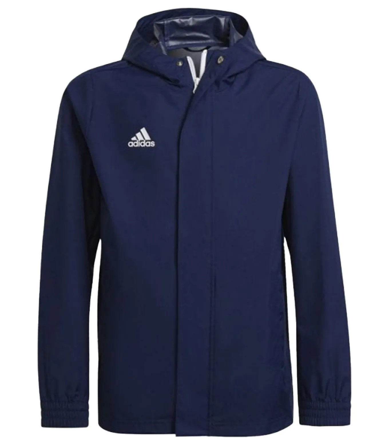 Adidas ENTRADA 22 Windjak marineblauw jacket is gemaakt van 100% polyester. Het ontwerp is eenvoudig en kenmerkt zich door de aanwezigheid van het logo van de merk. Deze windjak kent waterdichte stoftechnologie, waardoor hij geschikt is voor weersomstandigheden met neerslag of regen. Het halsband is hoog en kapiteinachtig, met langemuiteringsmogelijkheid. De mouwen hebben remmen en het hoofddeksel heeft een integraal deksel. Het jacket heeft twee buitenzakken met rijen. De sluitenis van de windjak is compleet met drukknop. Bij de 14–jarige maat is de lengte 34 inch, bij de 12–jarige 30,5 inch, bij de 10–jarige 28 inch, bij de 6–jarige 24 inch en bij de 8–jarige 25 inch.