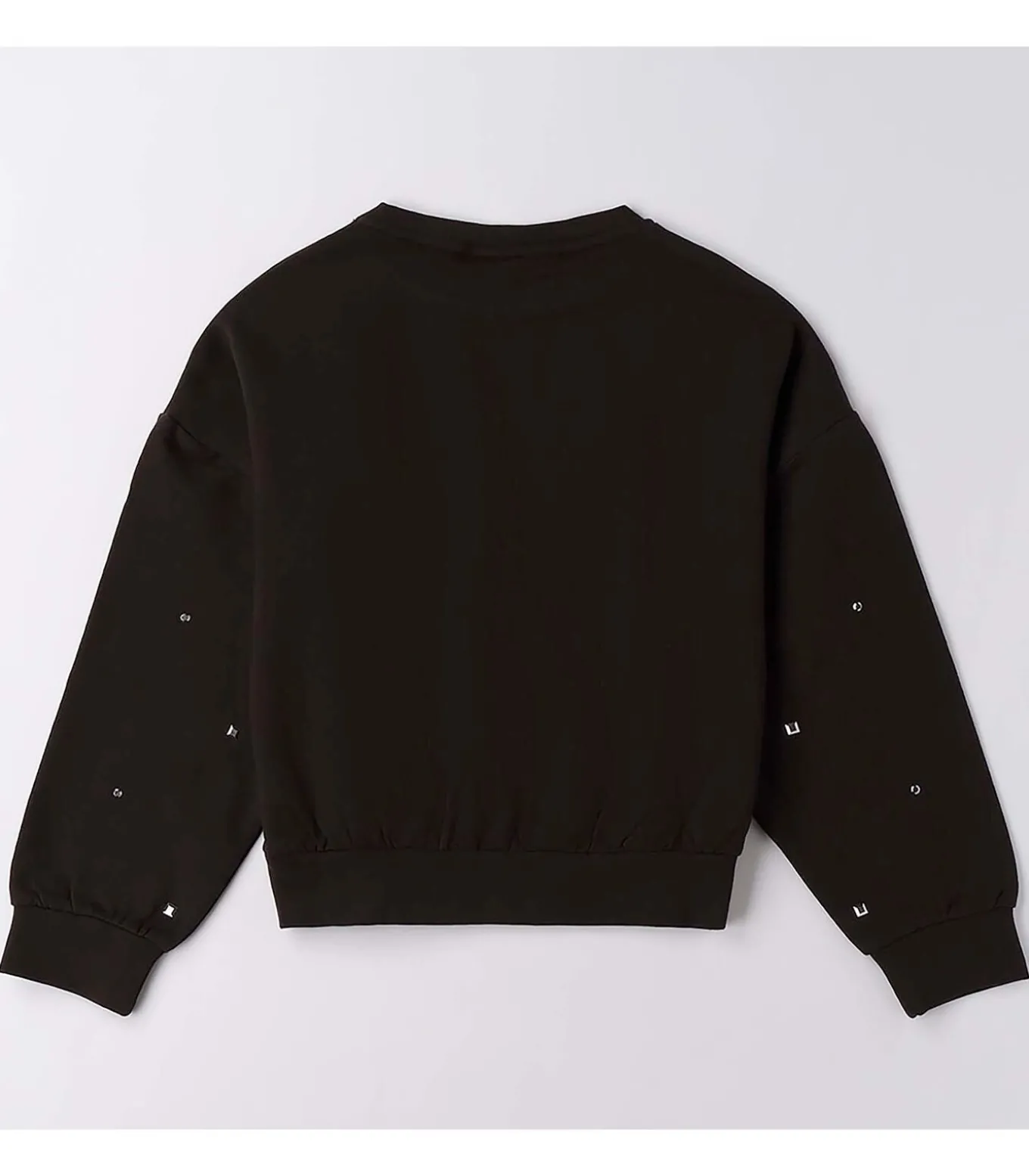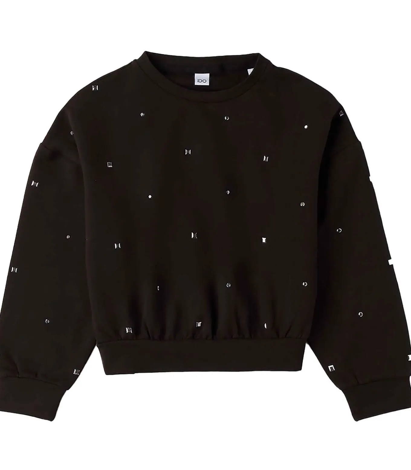 Kleur: zwart. Samenstelling: lichtgewicht geborstelde stretch sweatshirt. Mouwen: lang. Halslijn: ronde hals. Details: Meisjessweater versierd met strass–applicaties, met elastische zoom en manchetten voor een comfortabele en vrouwelijke pasvorm. Gebruik: ideaal voor casual looks met een vleugje glitter, perfect voor school, vrije tijd en speciale gelegenheden.
