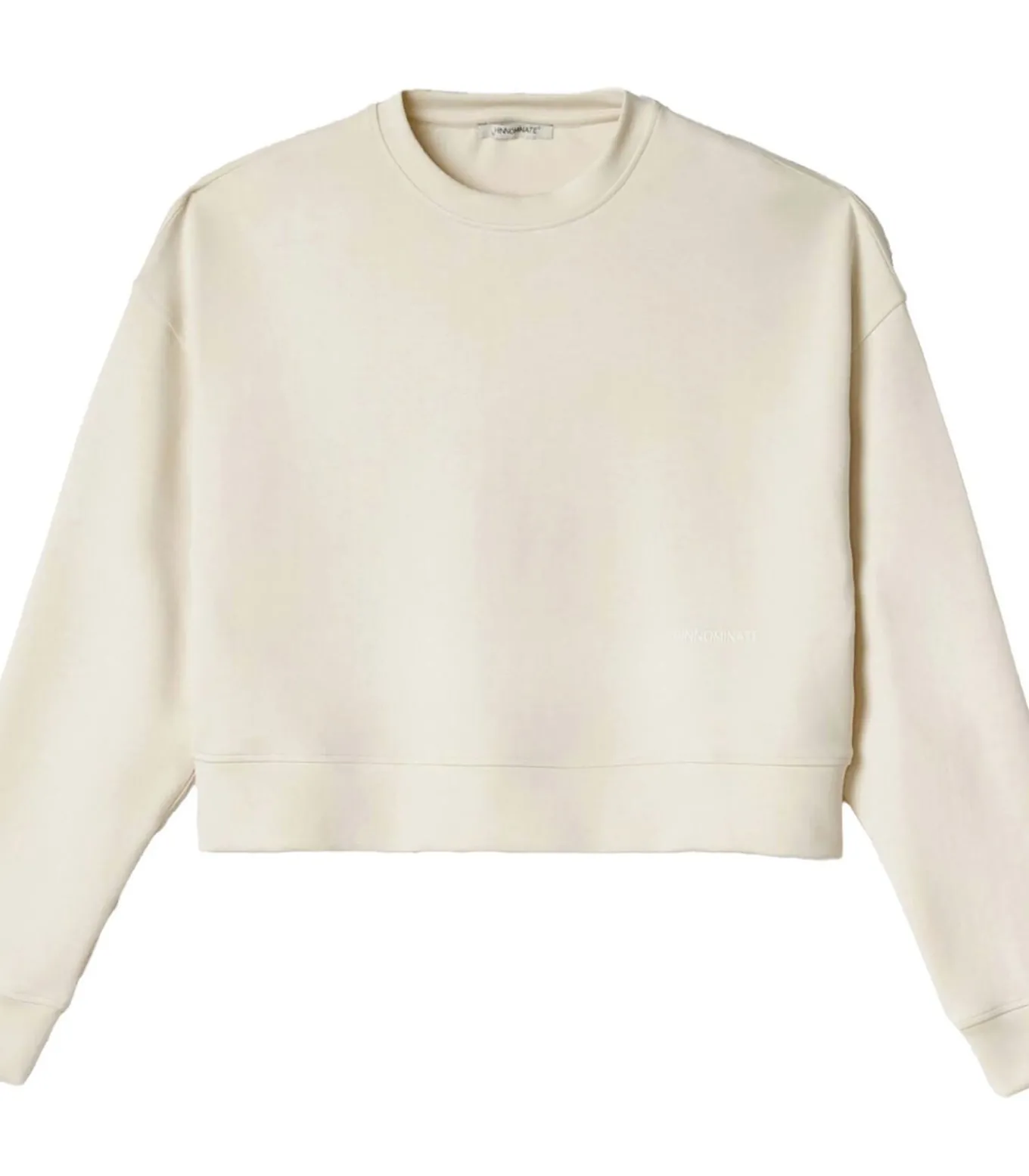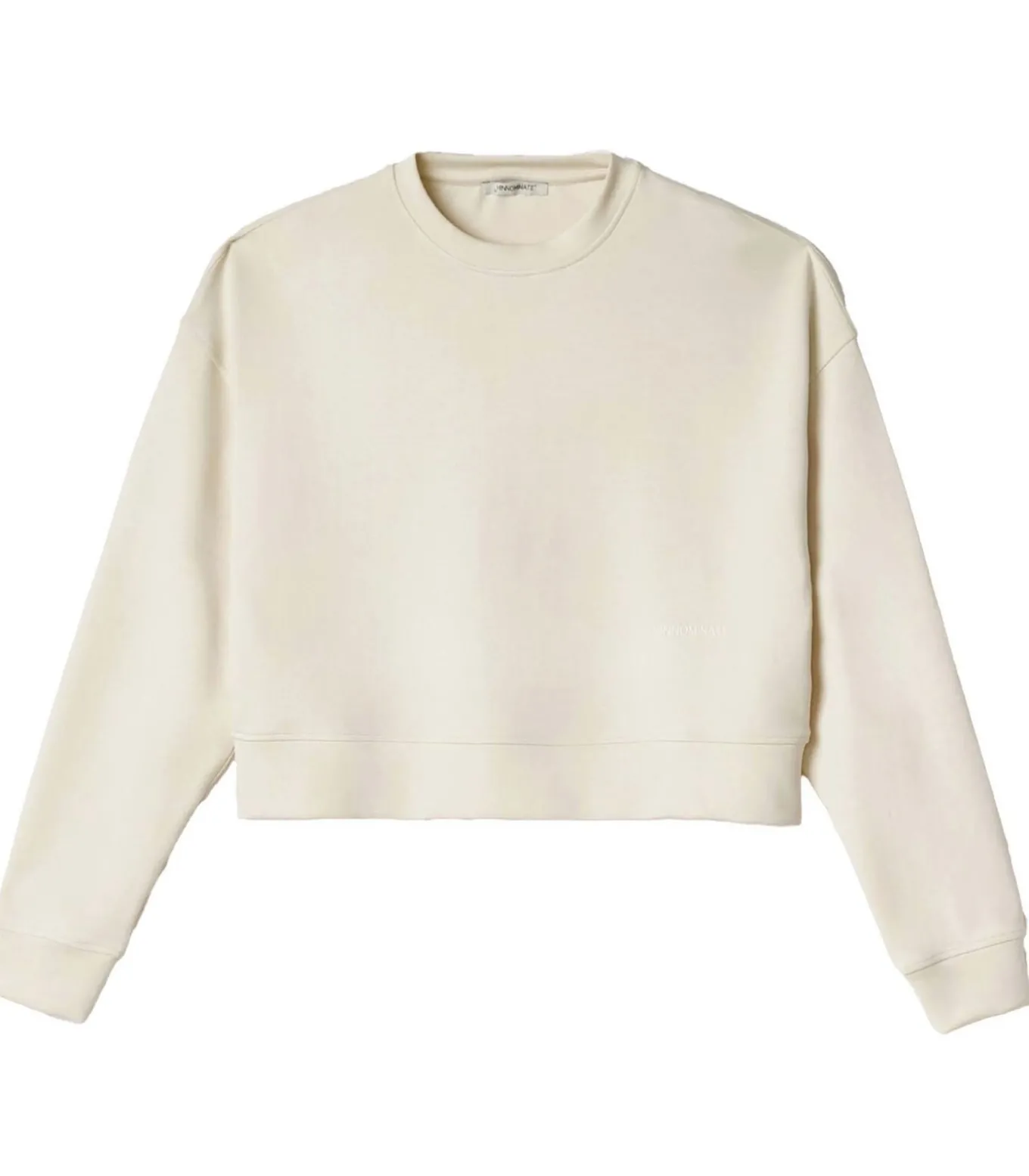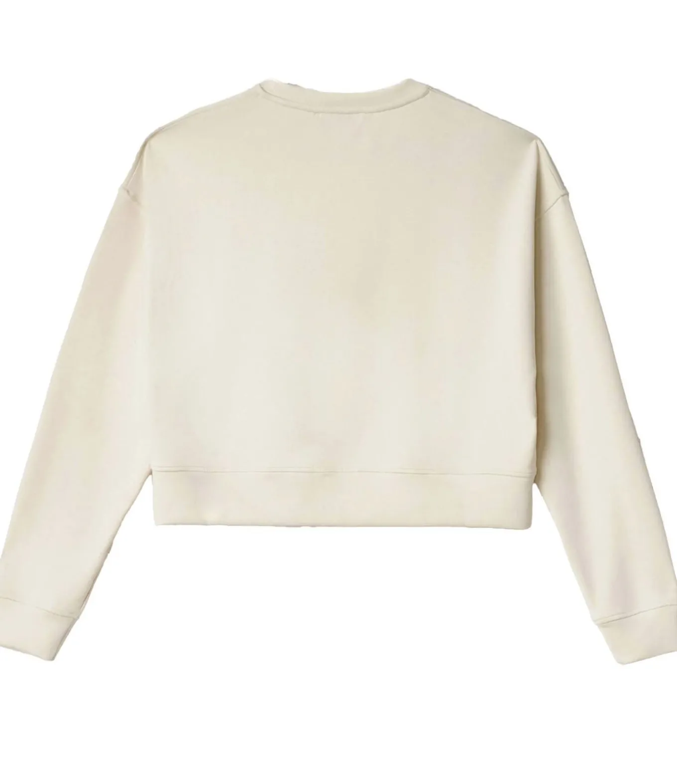 Kleur: Boterwit. Samenstelling: 44% viscose, 47% polyester, 9% elastomeer. Mouwen: Lang. Halslijn: Ronde hals. Lengte: Kort. Details: Cropped sweatshirt met ronde hals van viscosemix, met strakke lijnen en een moderne snit. Discreet logo op de voorkant. Gebruik: Perfect voor een casual en eigentijdse look, ideaal te combineren met een high–waist broek of rok.
