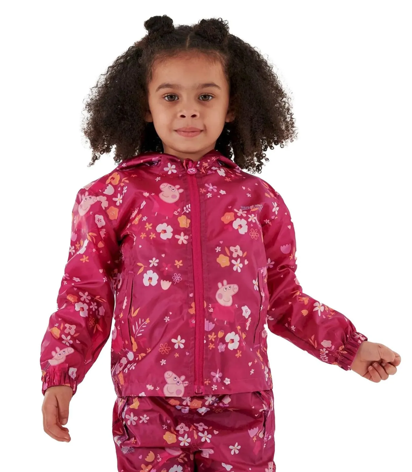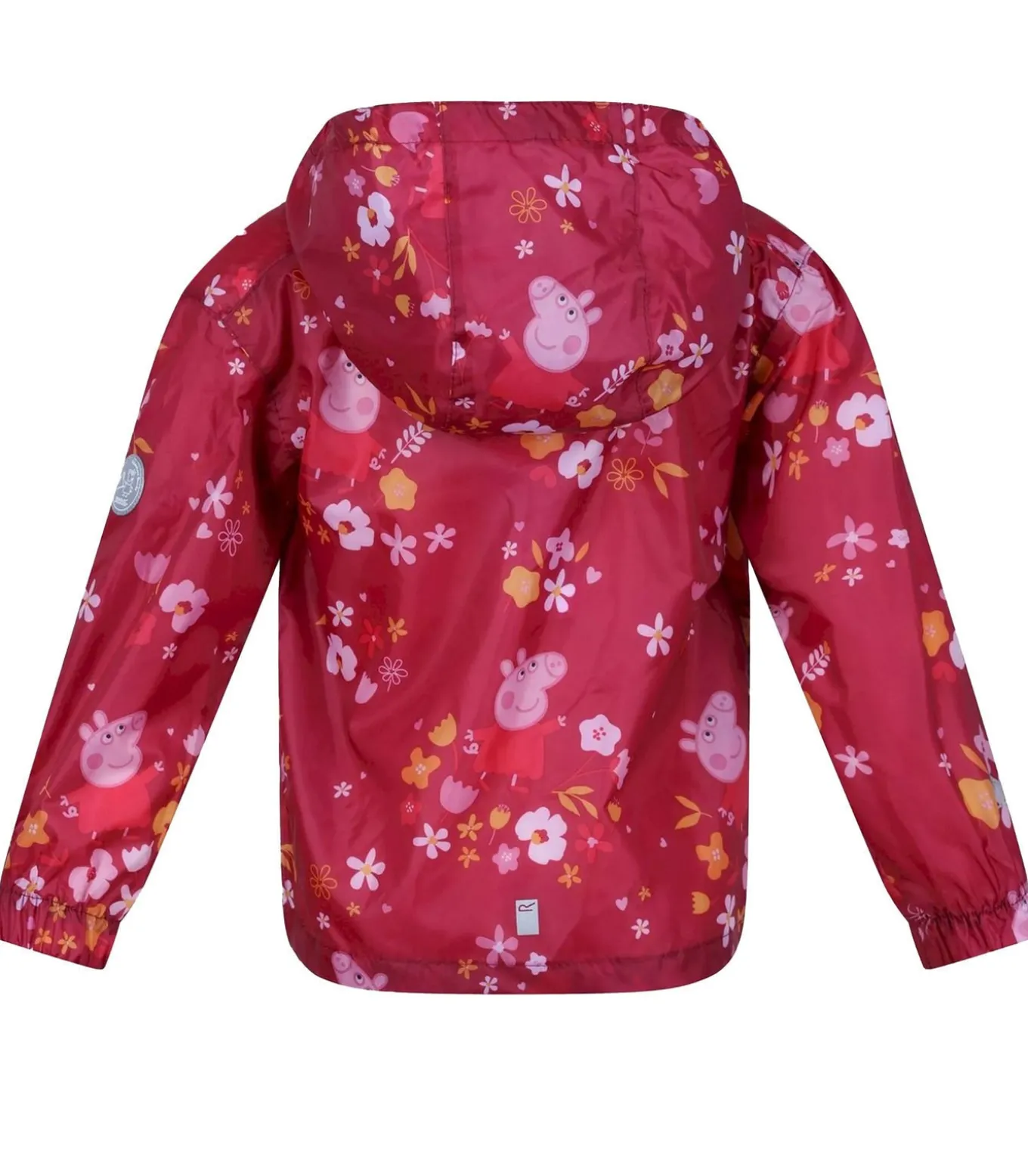 Dit waterdichte kinderjack van Regatta heeft Peppa Pig–figuren in een bloemenprint. Het materiaal van de jas is 100% polyester met een ademende, waterafstotende en winddichte constructie met Isolite 5000–stoftechnologie. De belangrijkste kenmerken zijn een volledige ritssluiting, getailleerde manchetten en een meegroeibare capuchon met elastisch trekkoord. Twee zijzakken bieden opbergruimte. De naden zijn volledig getapet voor extra waterdichtheid. Voor het gemak kan de jas compact worden opgeborgen. Belangrijk is dat dit jack een officiële licentie heeft voor de Peppa Pig personages. Het is een lichtgewicht en beschermende optie voor kinderen tijdens activiteiten in nat weer.