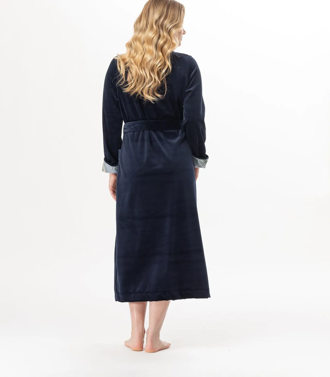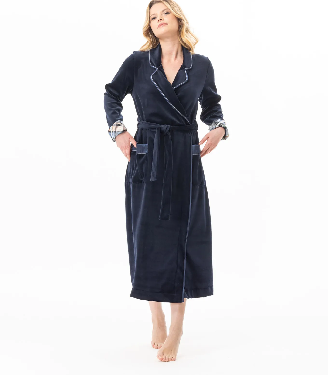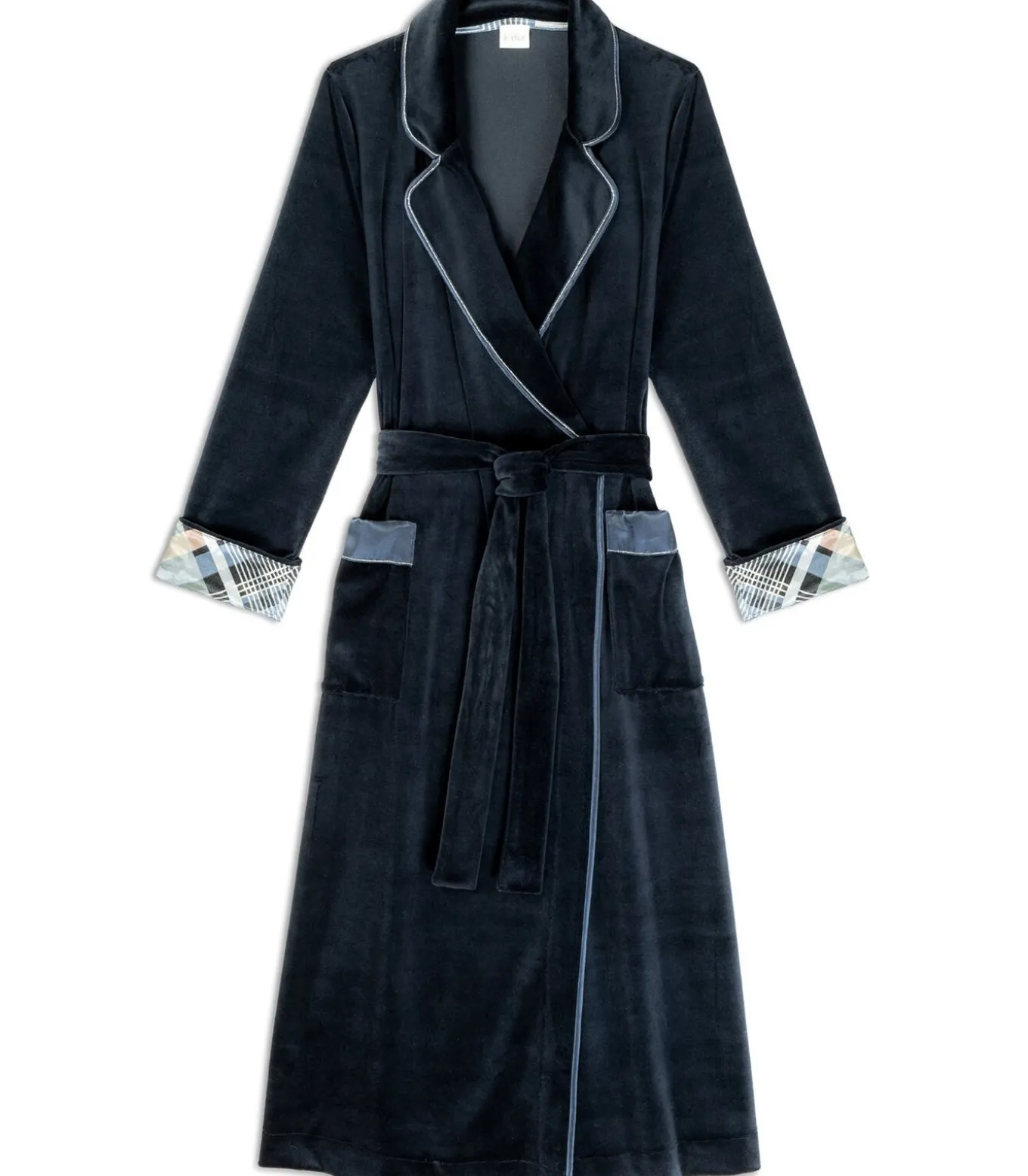 Alles wat je zoekt in een badjas! Warm, comfortabel, goed gesneden, elegant en toch makkelijk te dragen. De satijnen afwerking en de exclusieve Bradley tartanprint in viscose geven het nachtblauwe fluweel precies de juiste dosis chic.